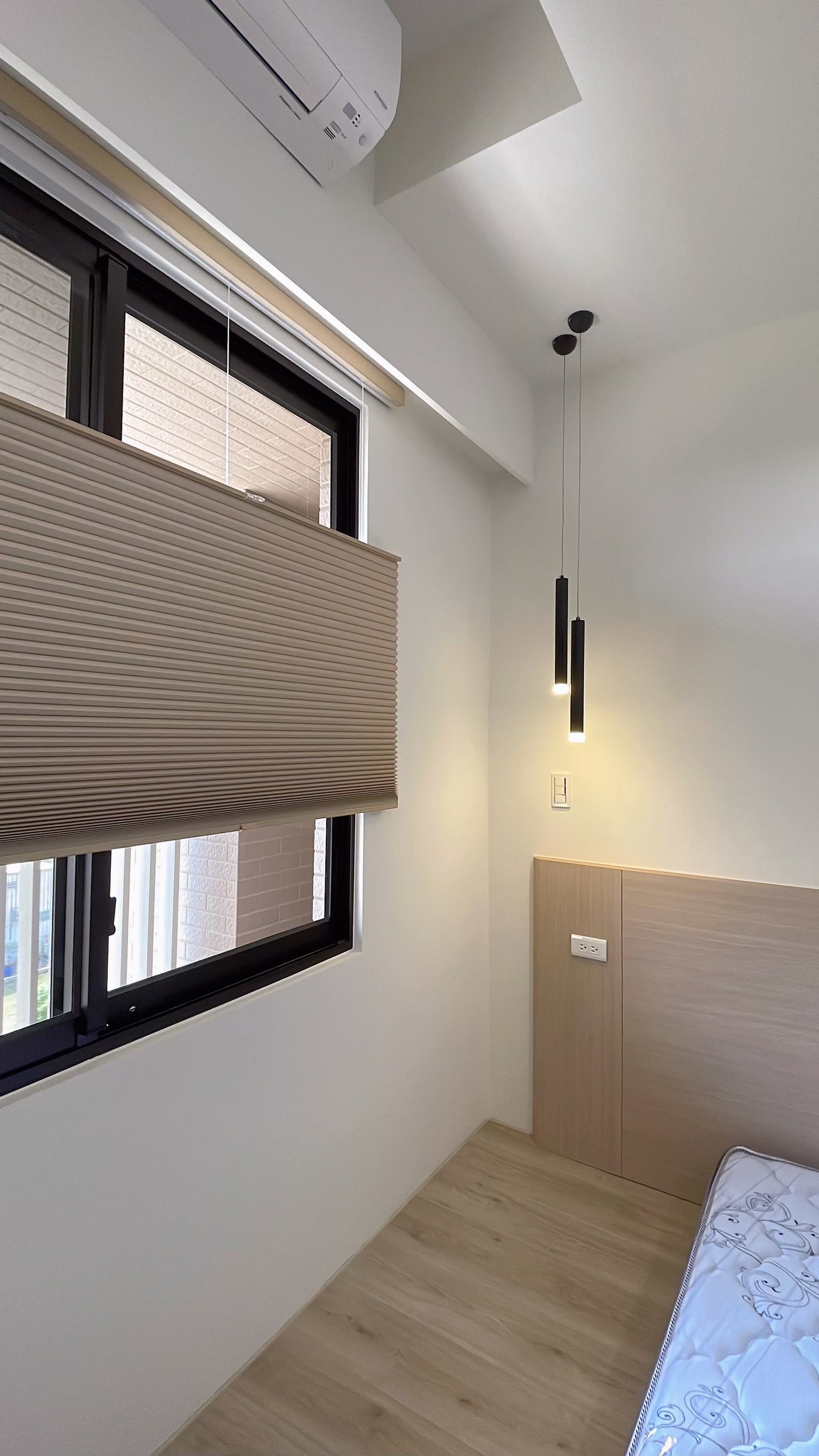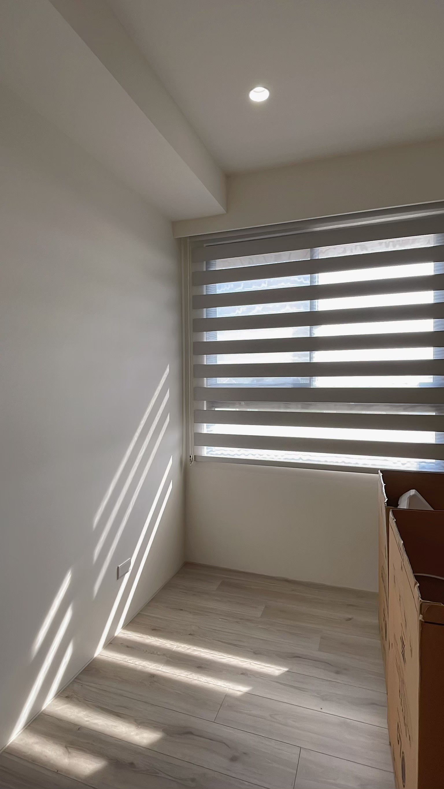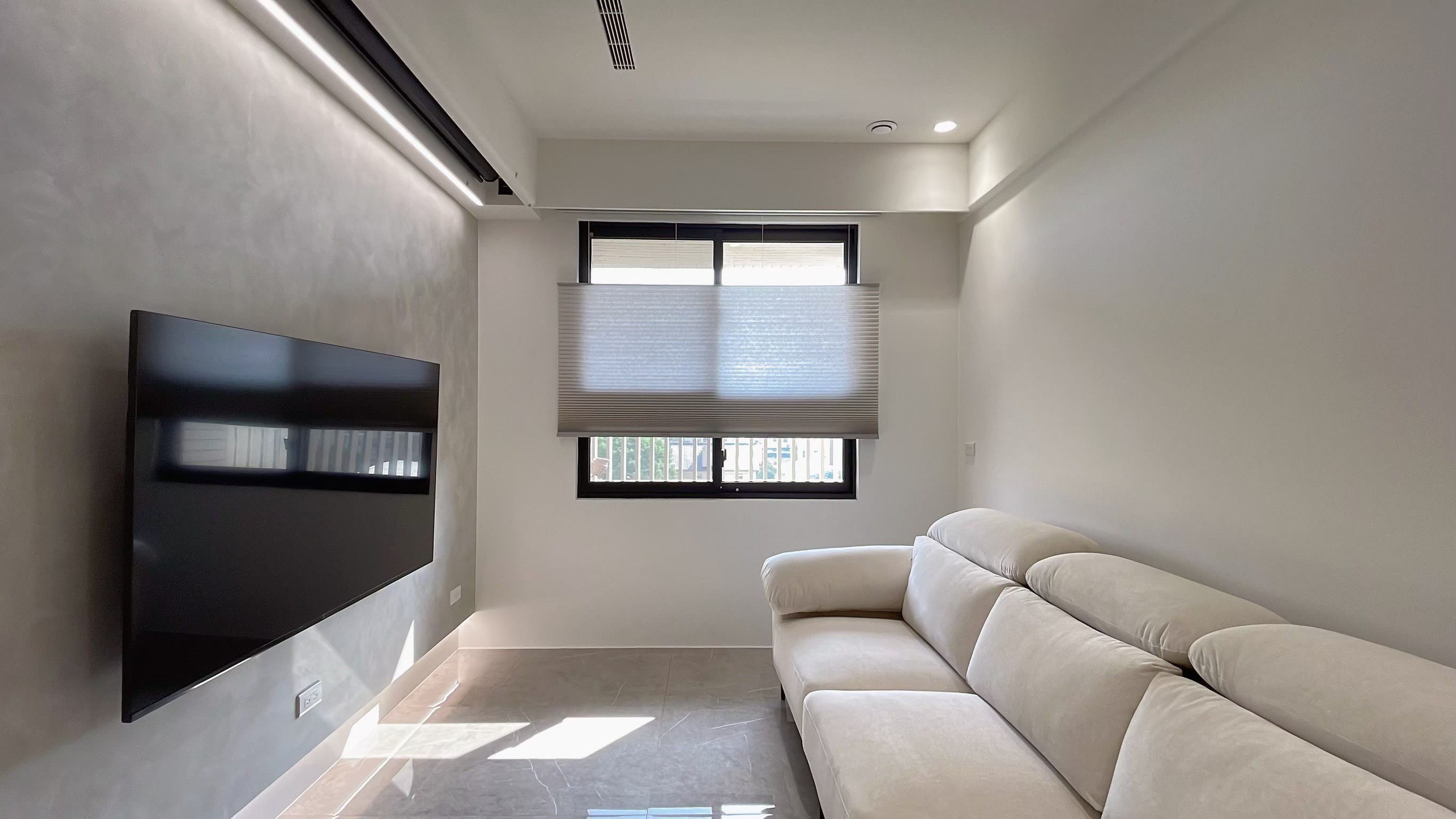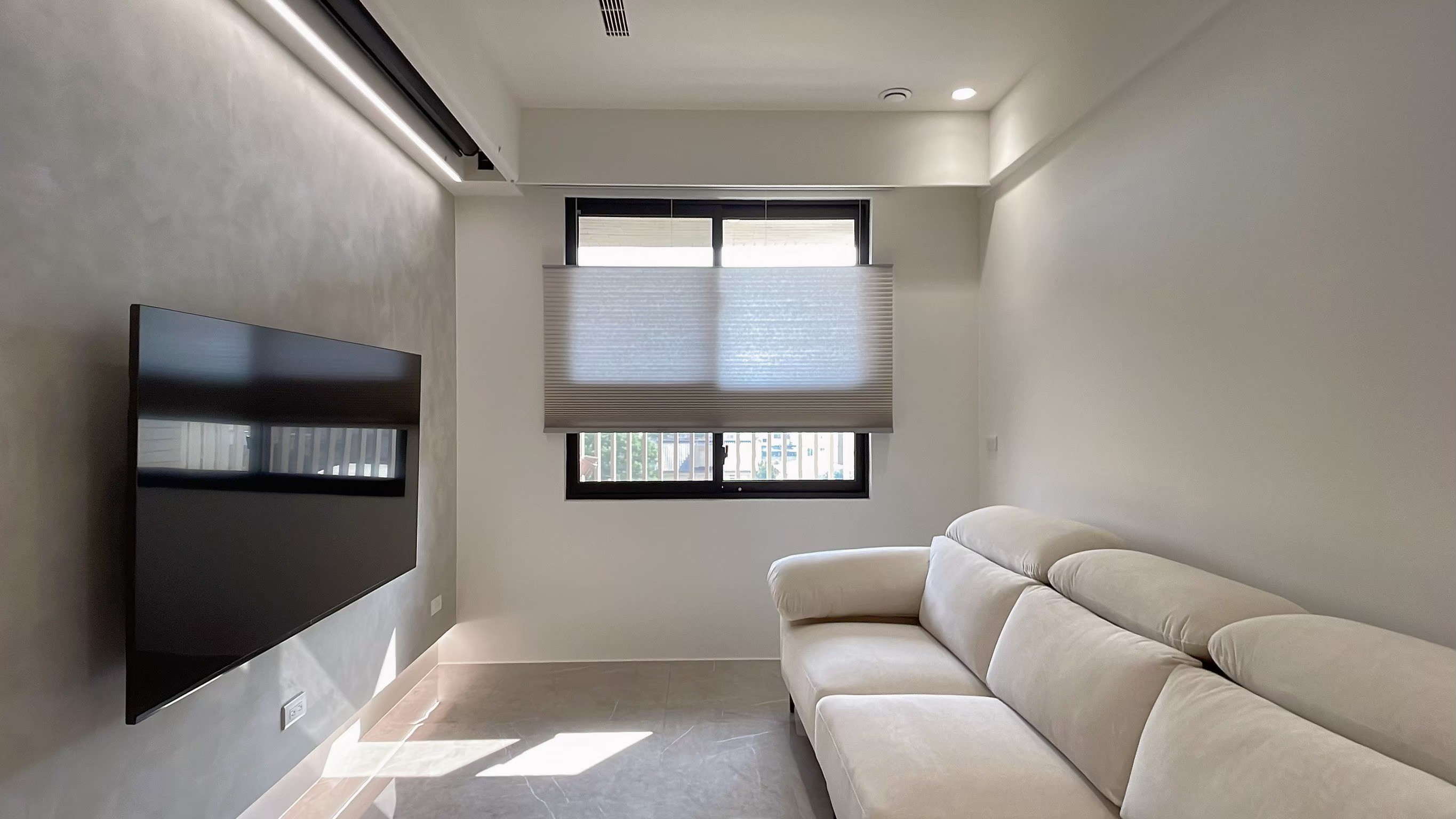 以簡約現代風格為基調,最大亮點是窗邊的半透光蜂巢簾。它能柔化日光,讓空間維持明亮卻不刺眼,同時有效保護隱私,不會讓室內一覽無遺。蜂巢結構具隔熱與節能效果,能提升居家舒適度,也減少冷氣耗能。搭配大片窗景,讓自然光隨時間變化,營造出溫潤又具層次的氛圍,使客廳在功能與美感之間取得平衡。