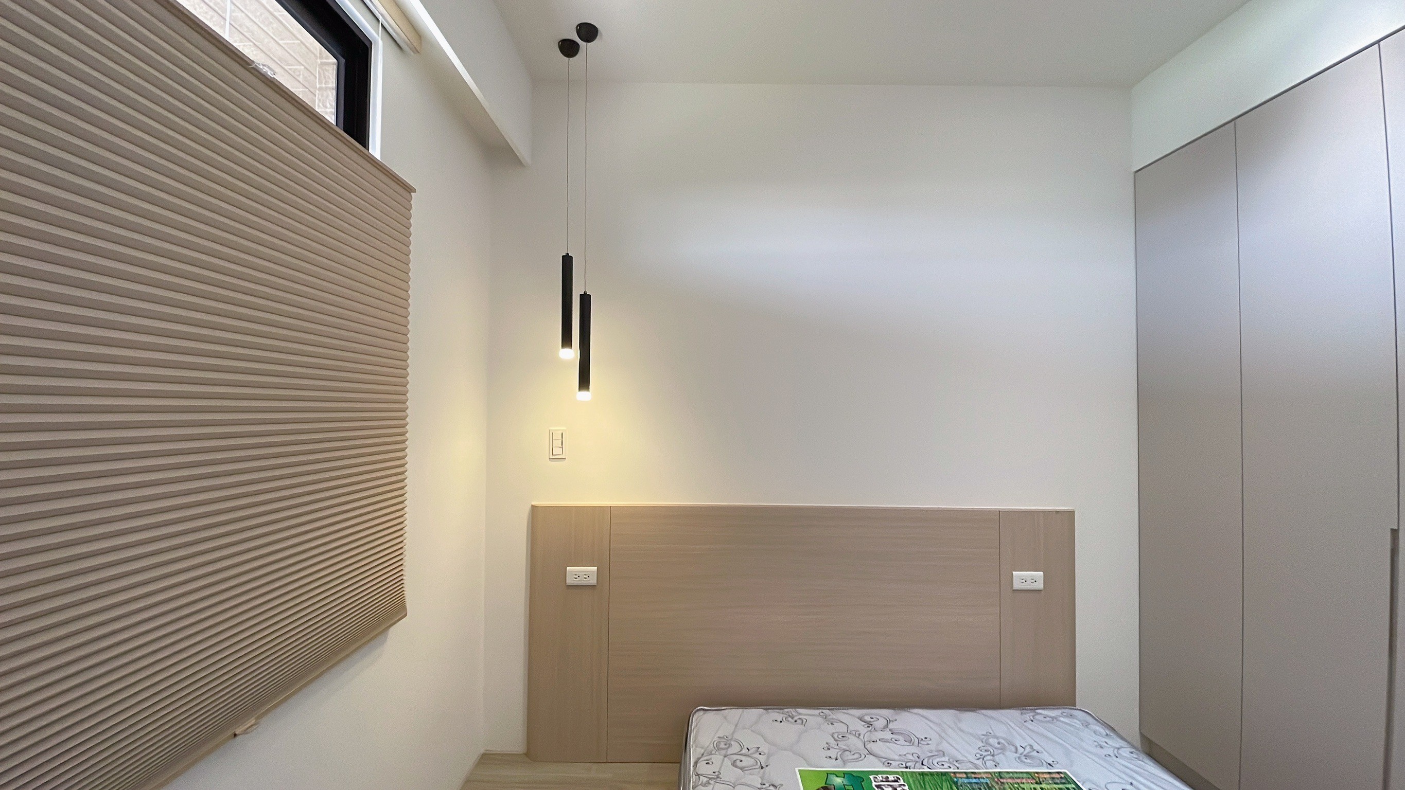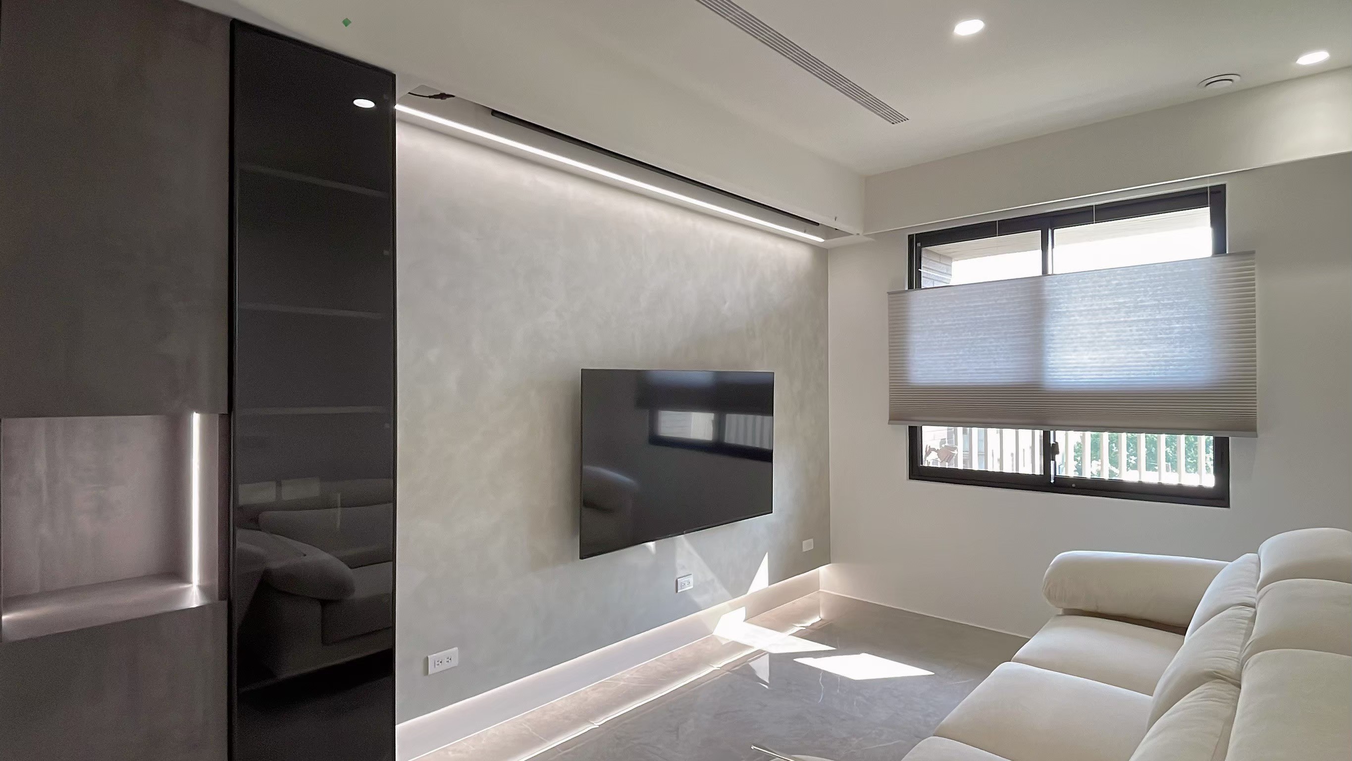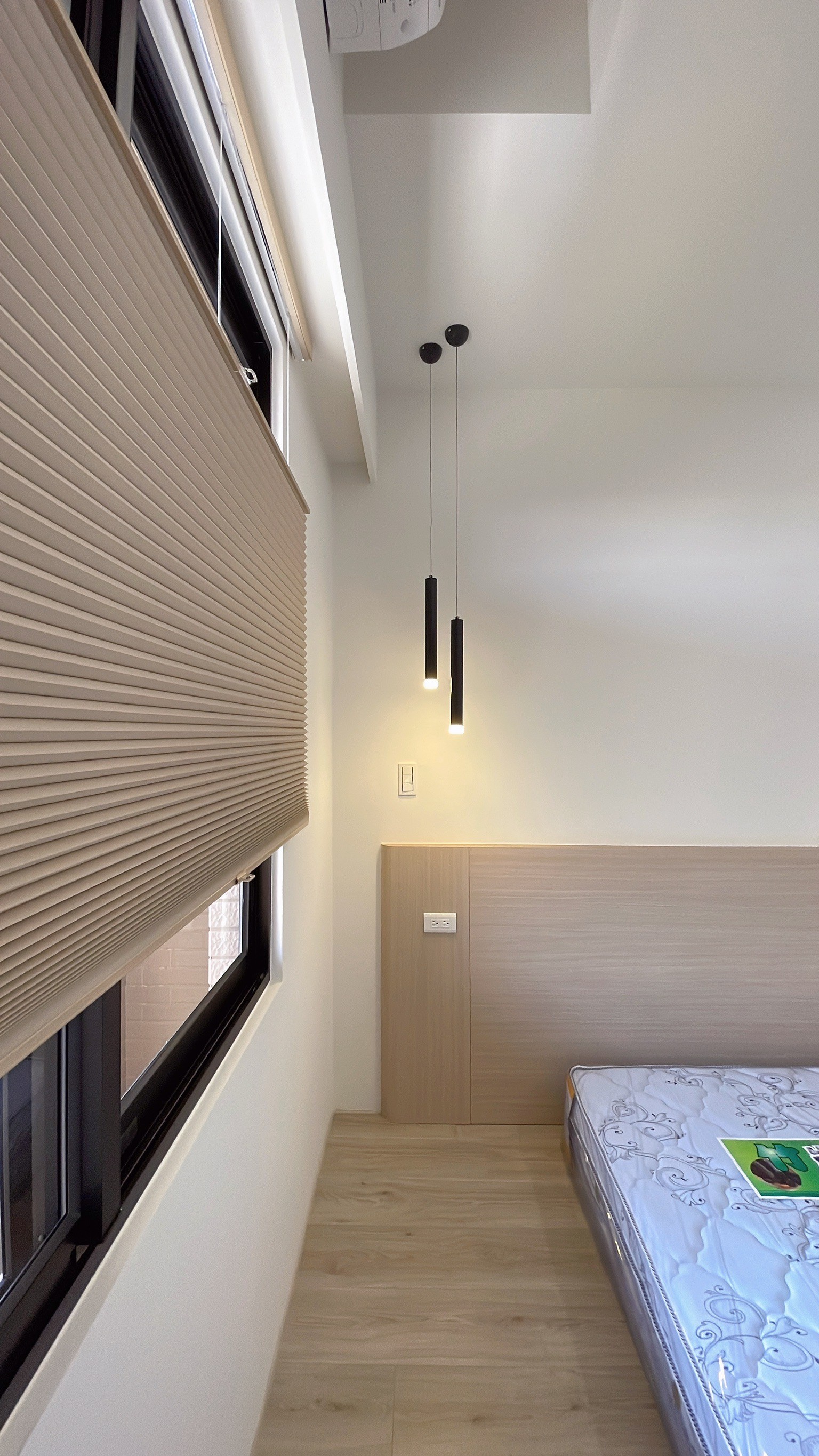 以簡約現代風格為基調,最大亮點是窗邊的半透光蜂巢簾。它能柔化日光,讓空間維持明亮卻不刺眼,同時有效保護隱私,不會讓室內一覽無遺。蜂巢結構具隔熱與節能效果,能提升居家舒適度,也減少冷氣耗能。搭配大片窗景,讓自然光隨時間變化,營造出溫潤又具層次的氛圍,使客廳在功能與美感之間取得平衡。