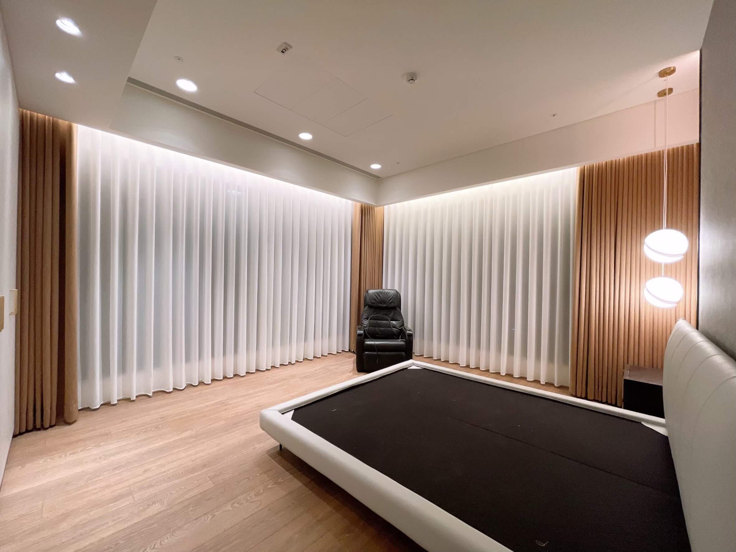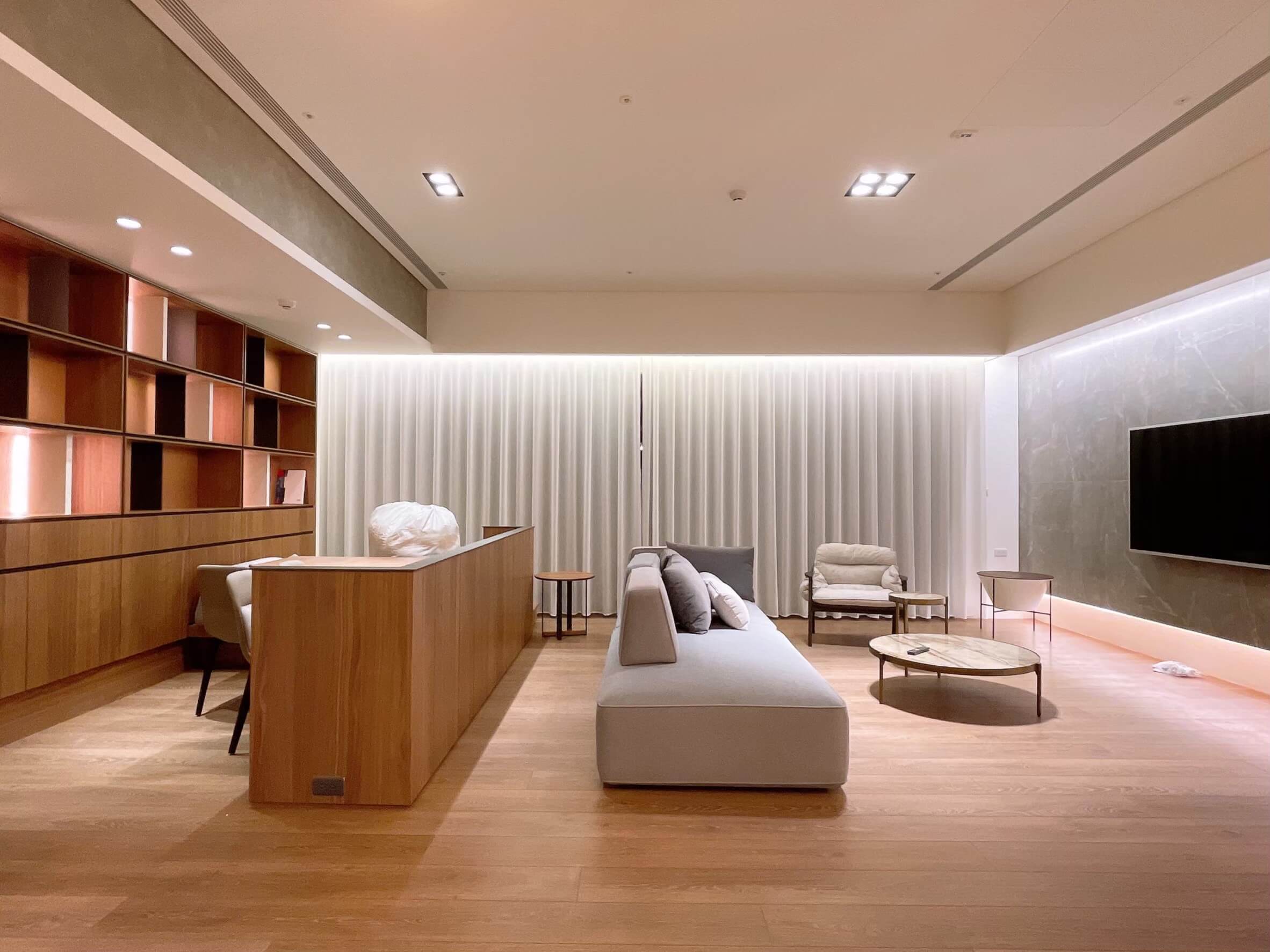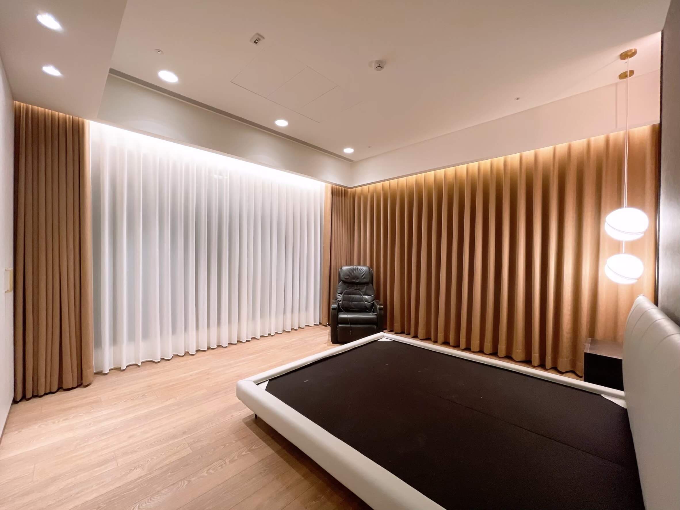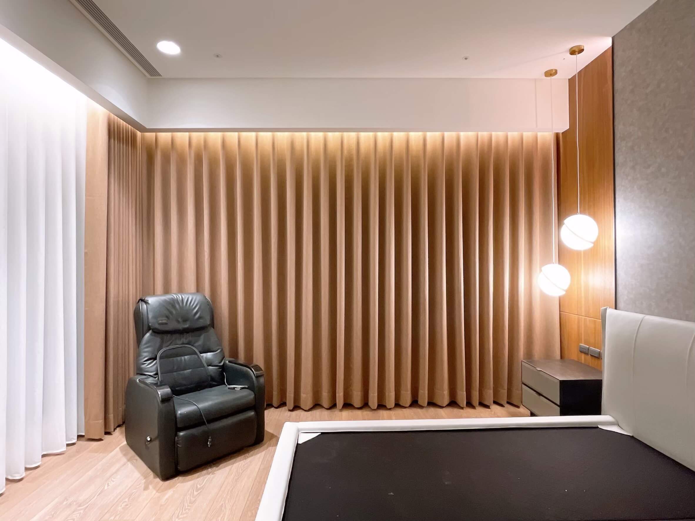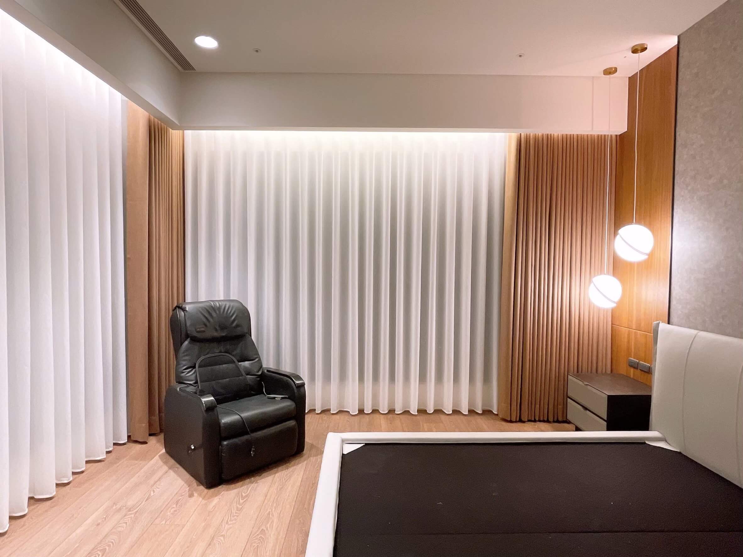 以落地窗搭配一整面白色布簾為視覺重點,窗簾以柔和的垂墜線條延伸整體高度感,使客廳顯得更開闊大器。布簾材質在光線照射下呈現溫潤質感,能靈活調節隱私與採光,白色更帶來清爽純淨的氛圍。與木質地板及溫暖燈光相互呼應,窗簾不僅是遮光工具,更是塑造空間層次與質感的重要元素,營造出雅緻而舒適的居家氛圍。