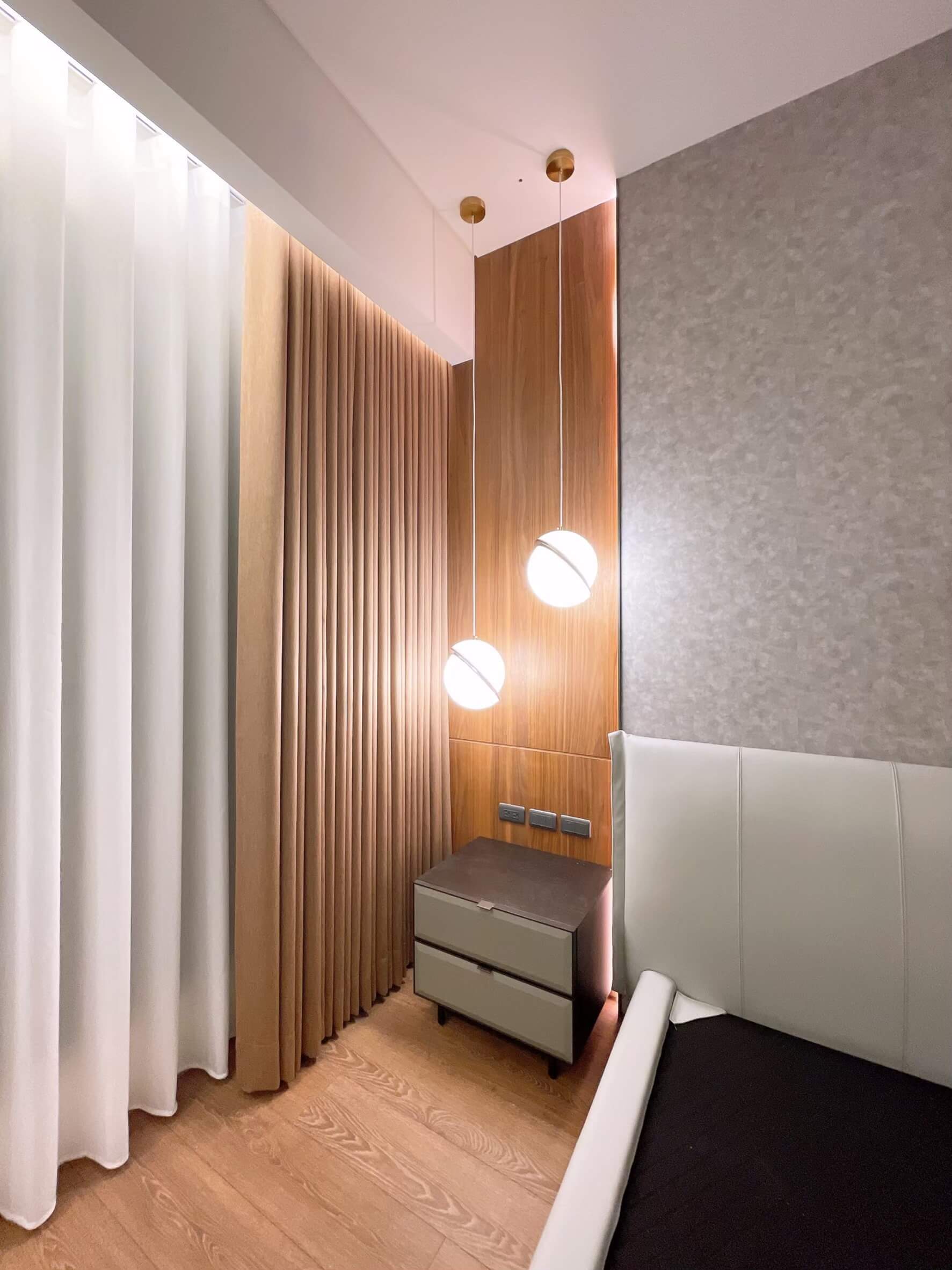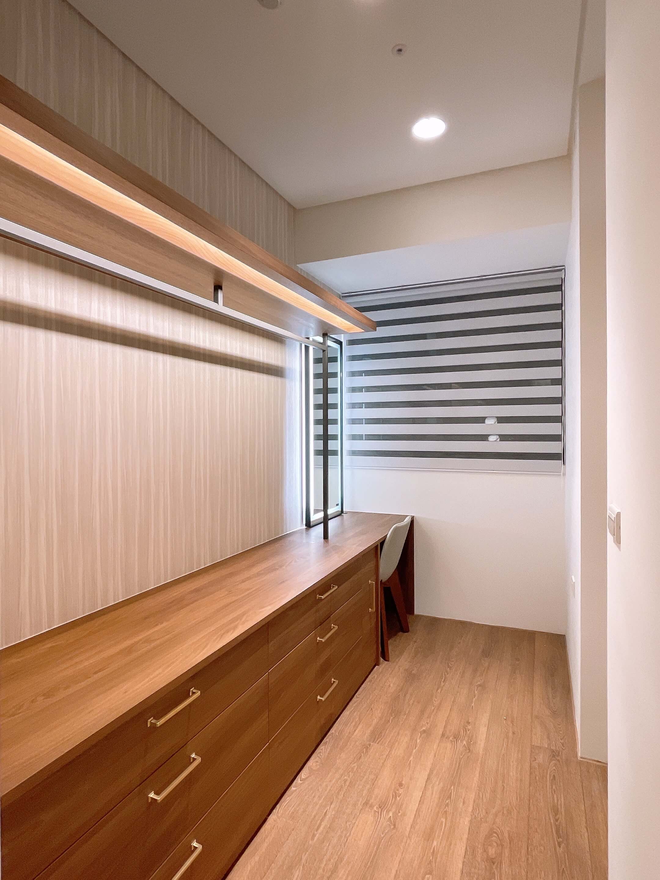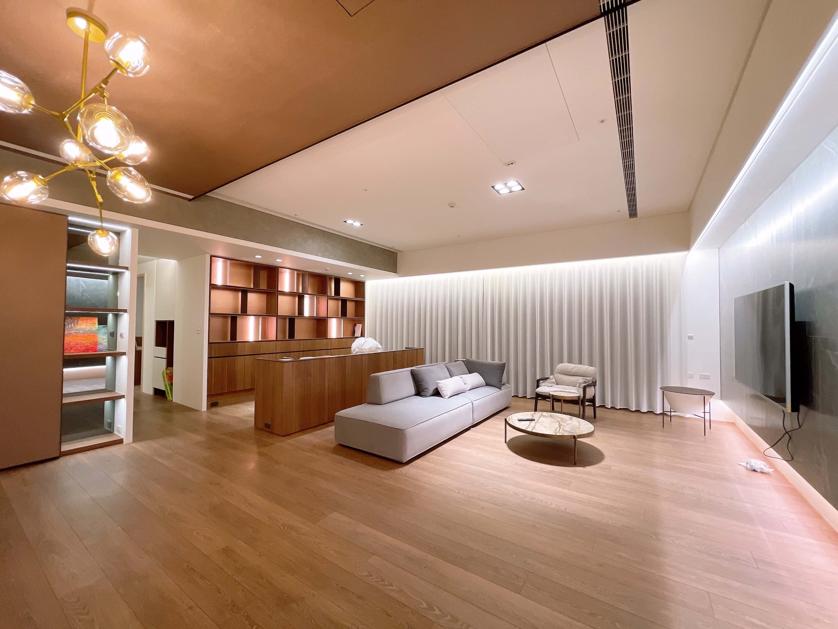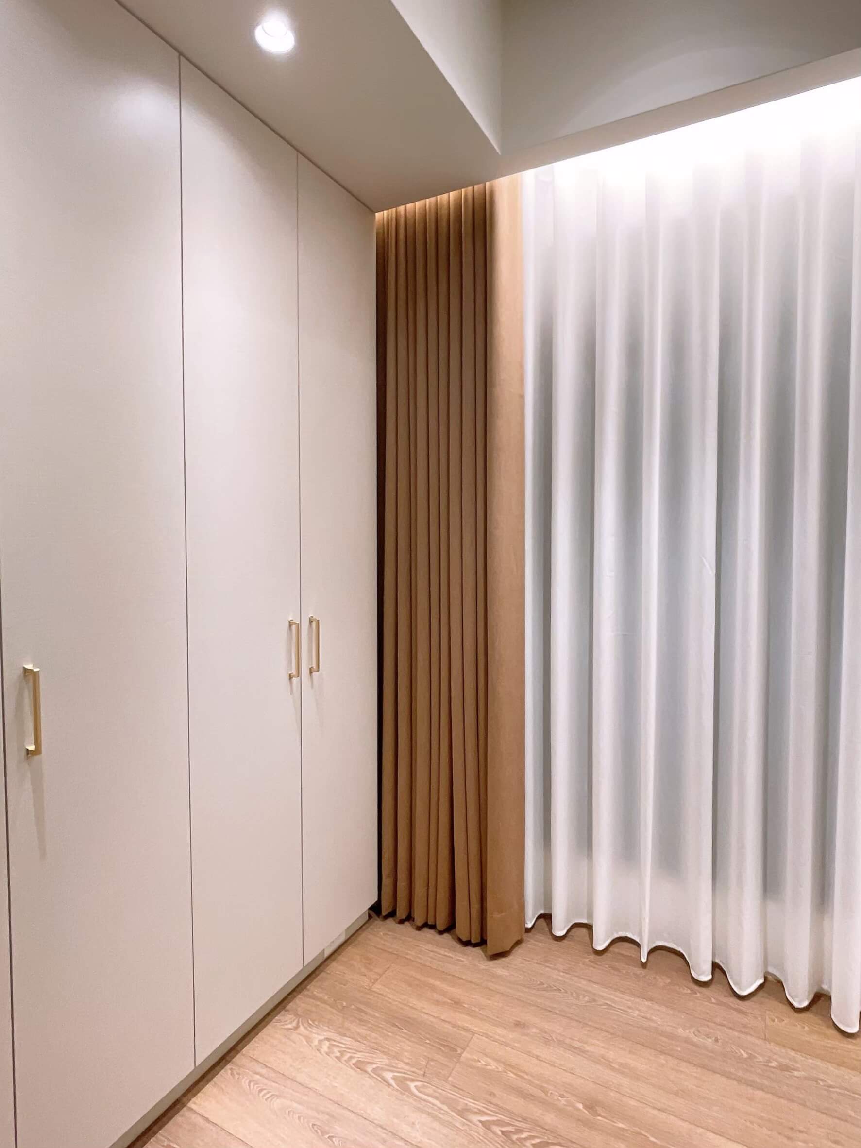 以落地窗搭配一整面白色布簾為視覺重點,窗簾以柔和的垂墜線條延伸整體高度感,使客廳顯得更開闊大器。布簾材質在光線照射下呈現溫潤質感,能靈活調節隱私與採光,白色更帶來清爽純淨的氛圍。與木質地板及溫暖燈光相互呼應,窗簾不僅是遮光工具,更是塑造空間層次與質感的重要元素,營造出雅緻而舒適的居家氛圍。