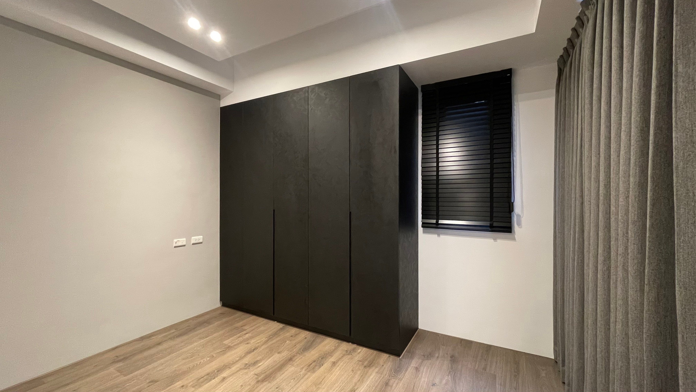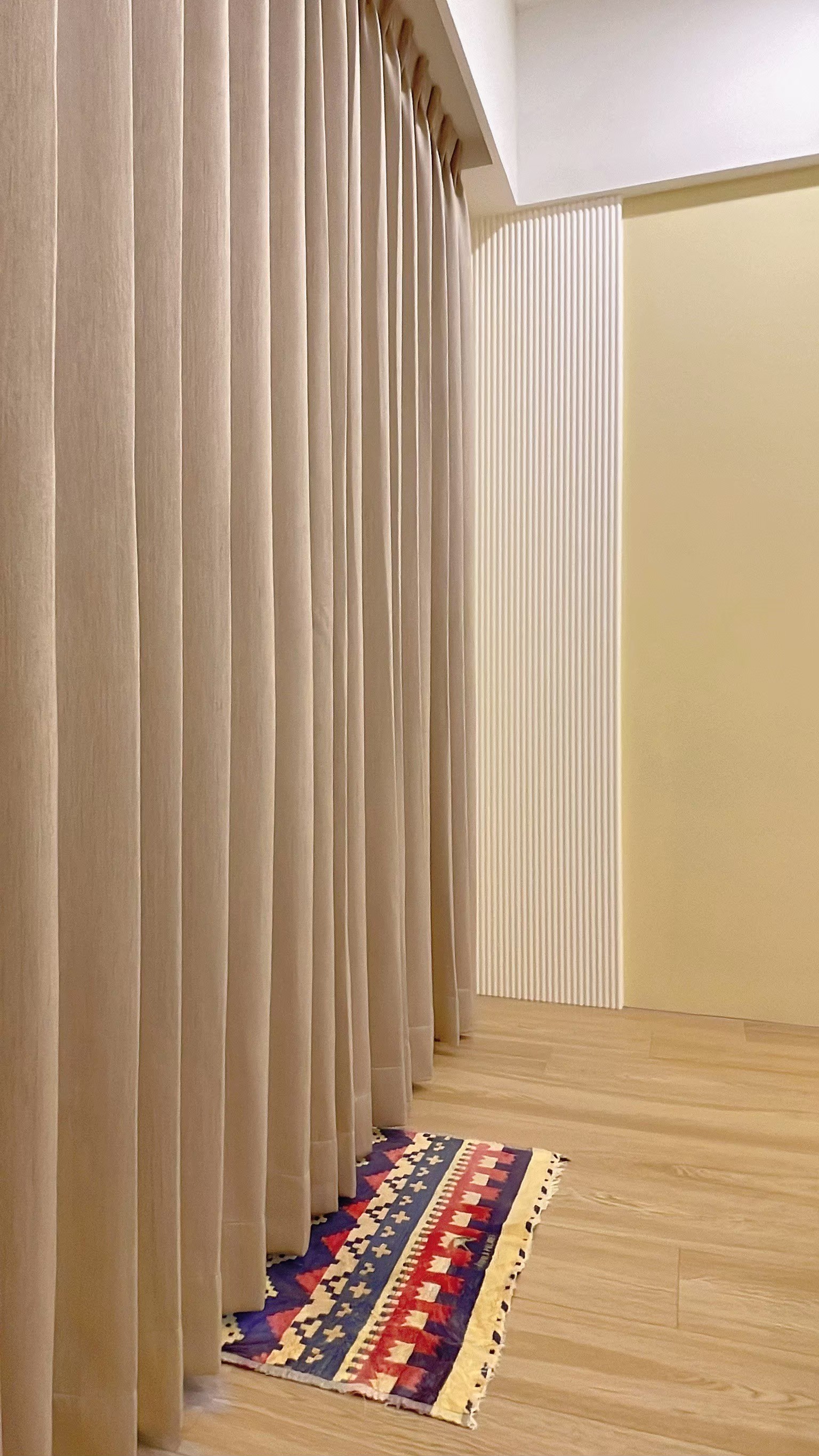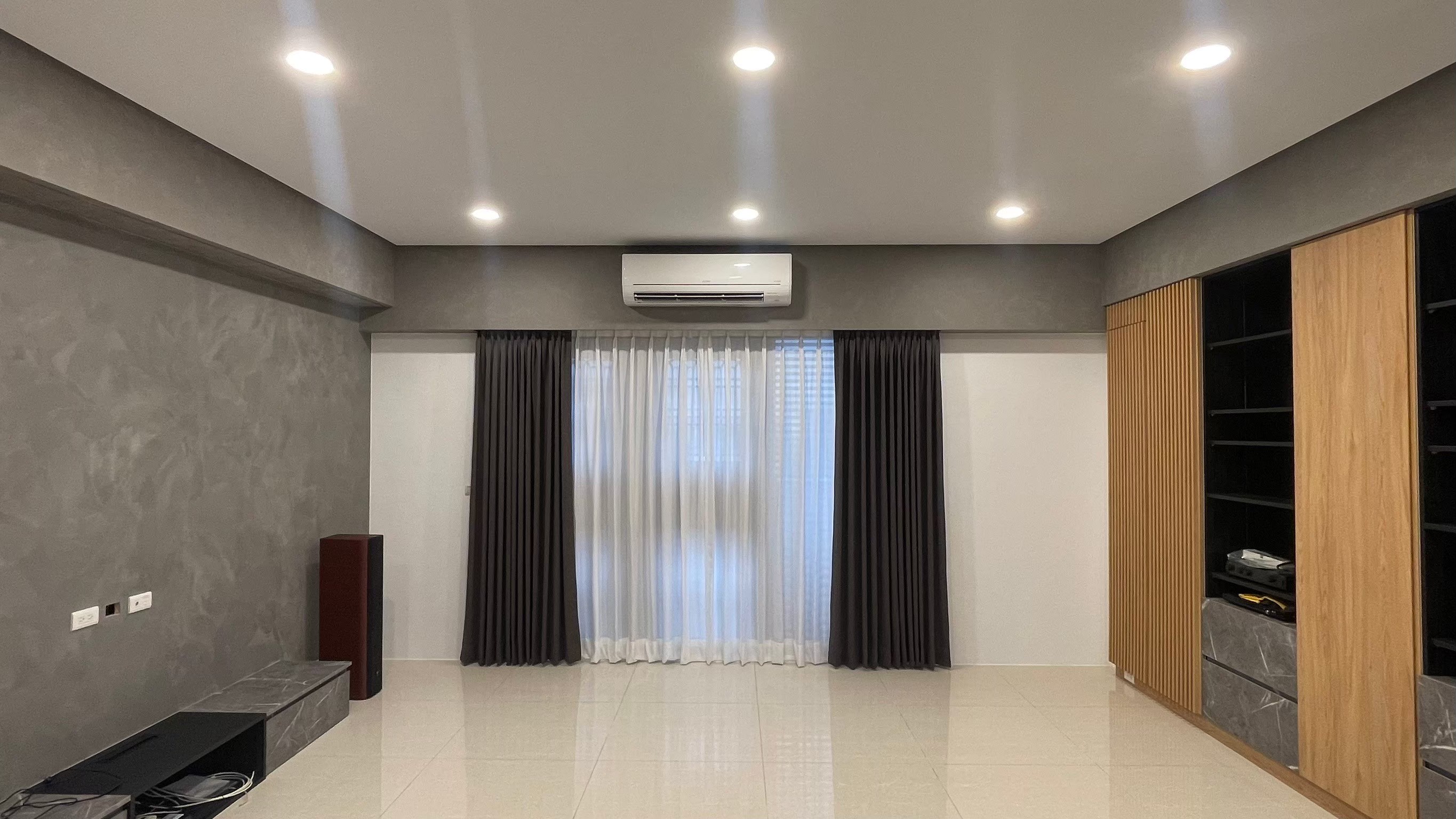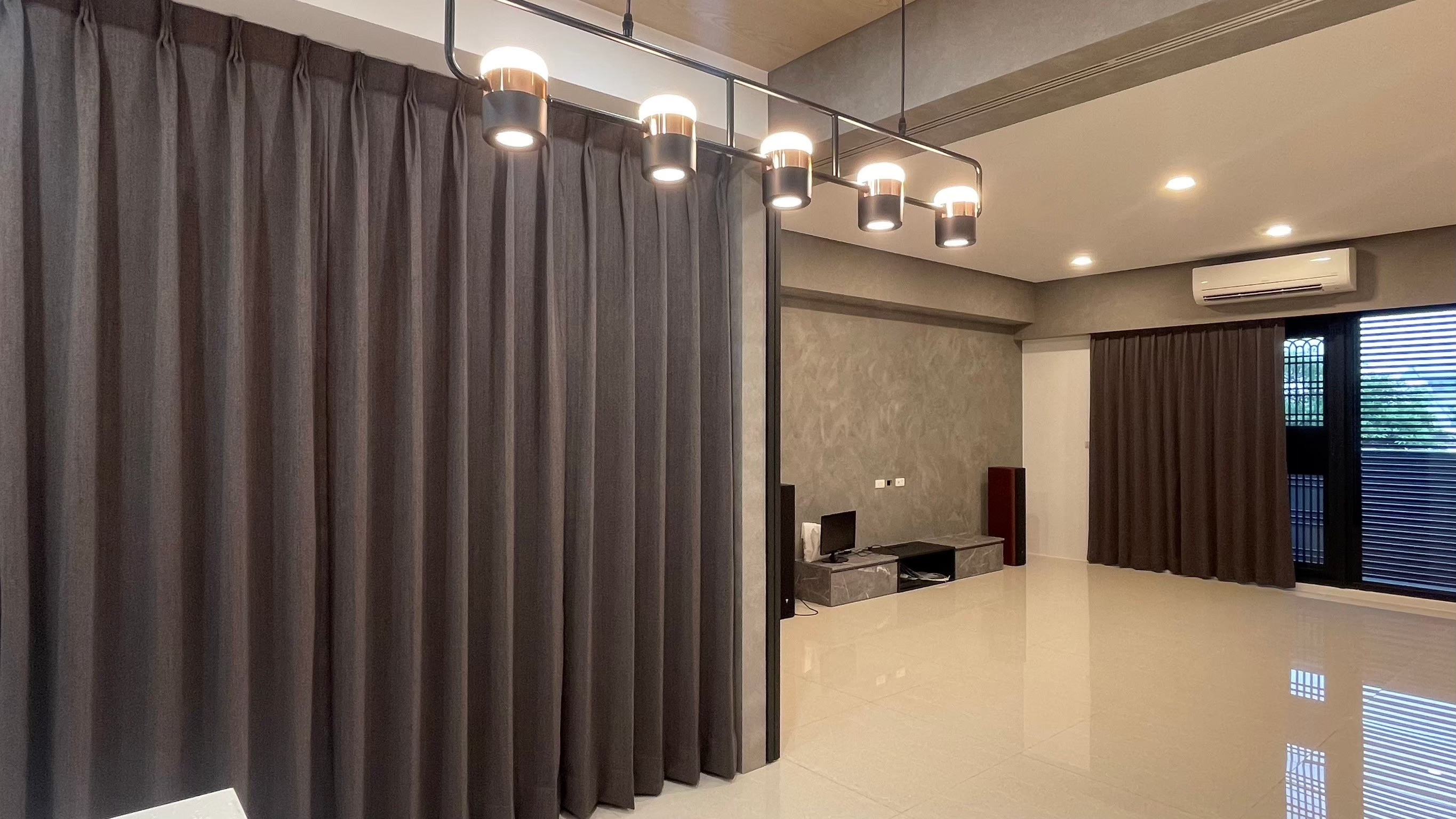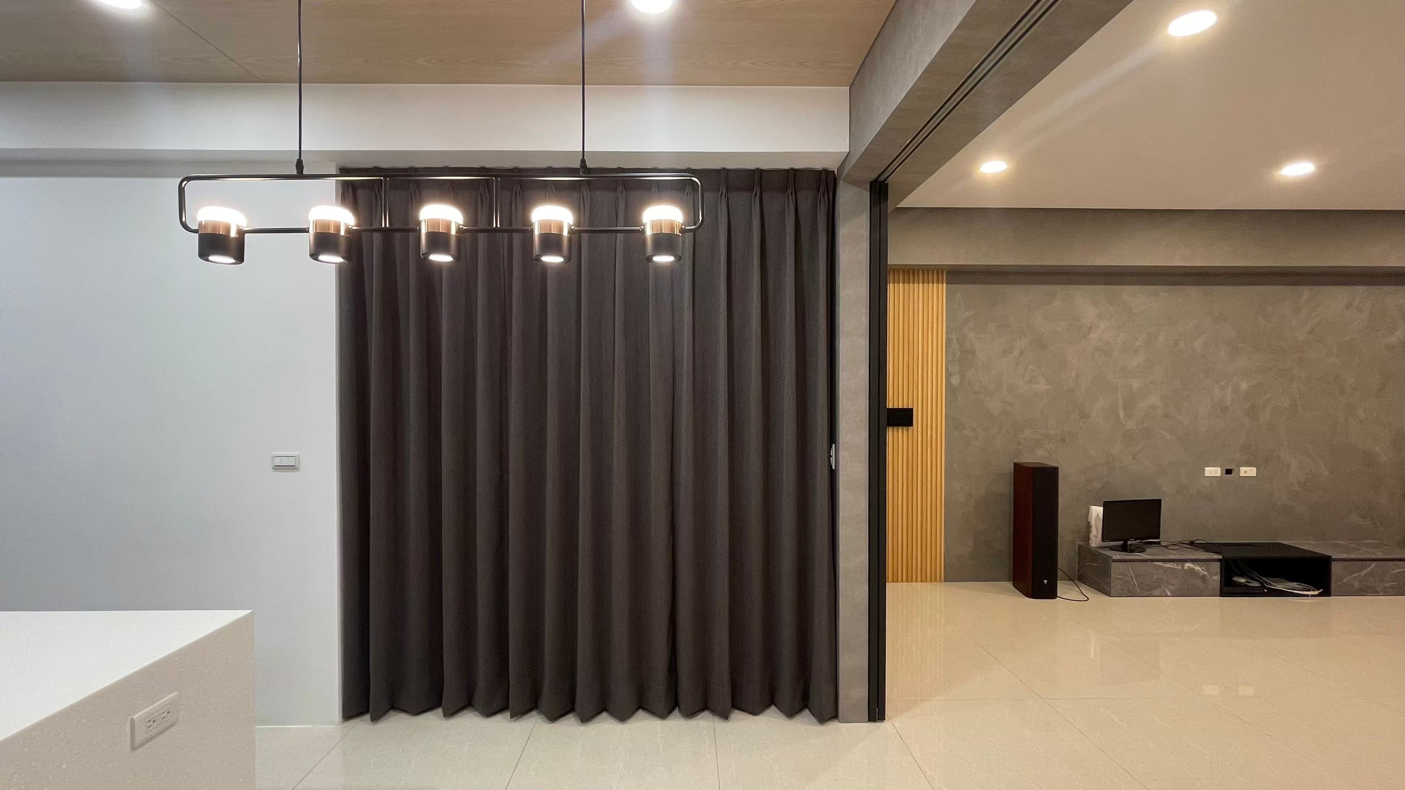 客廳的窗簾設計以「遮光布簾+霧感柔光紗」為主,展現簡潔大方的氛圍。外層深灰色遮光布簾能在需要時完全隔絕光線,提供安靜私密的休憩環境;內層白色霧感紗簾則在白天引入柔和光線,讓空間保持明亮卻不刺眼。雙層搭配既能靈活控制光線,又增添層次感,與灰色牆面及淨白地板相互呼應,使空間更顯現代感與質感。