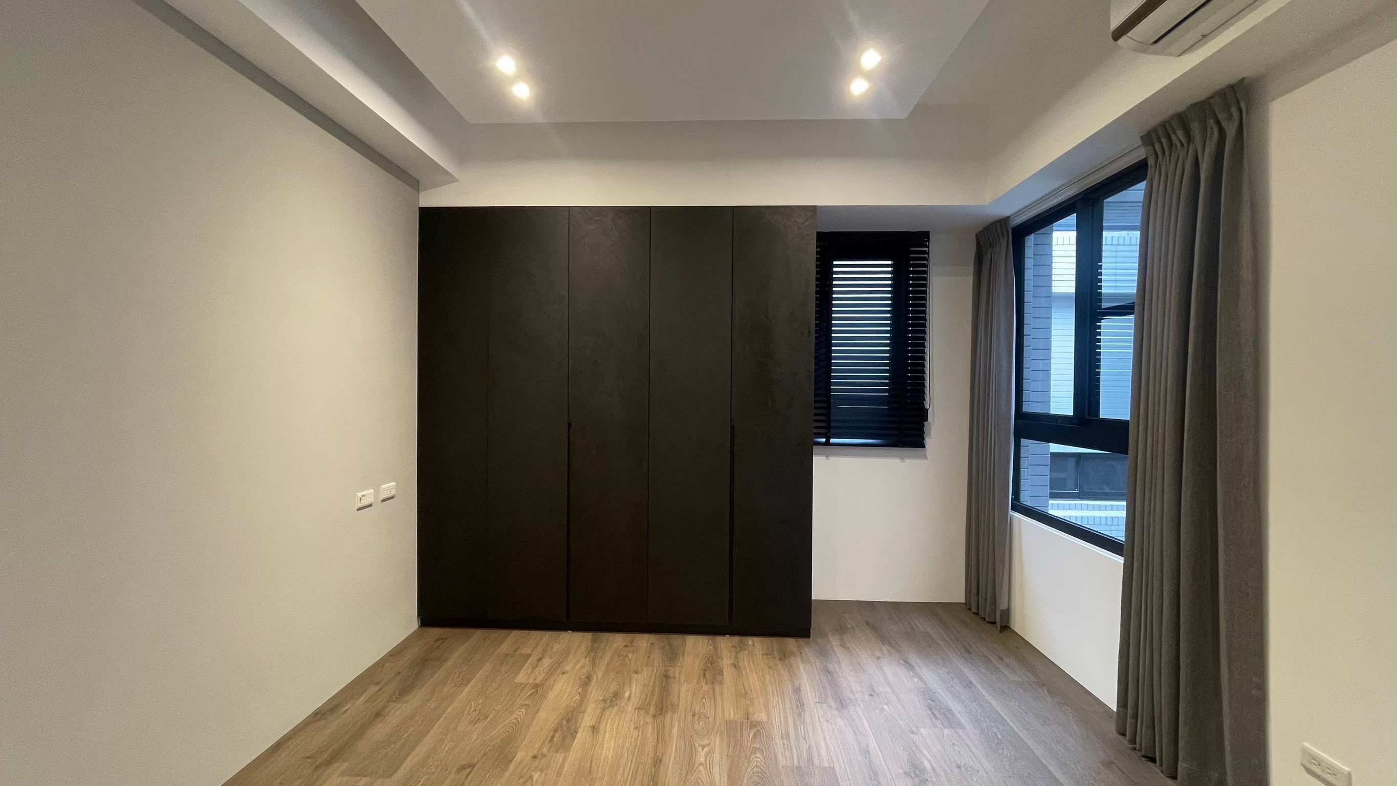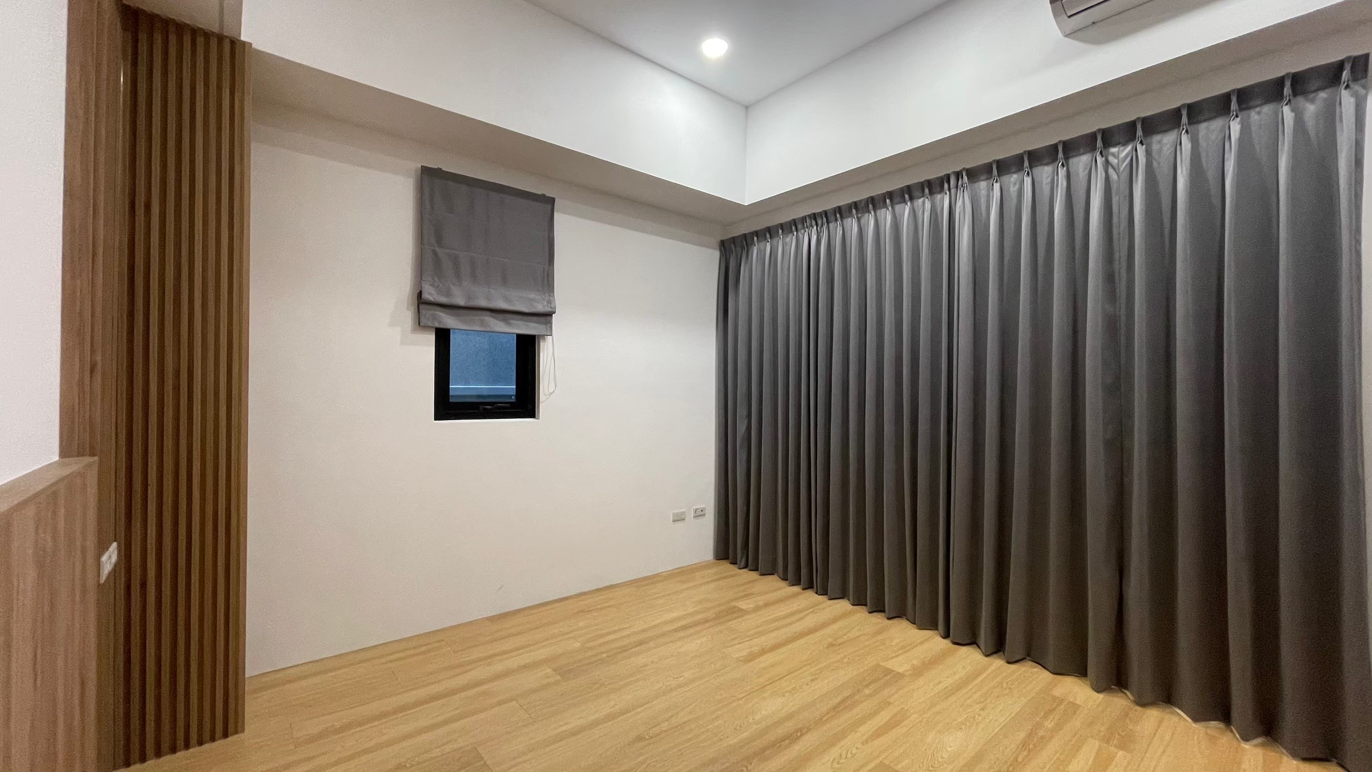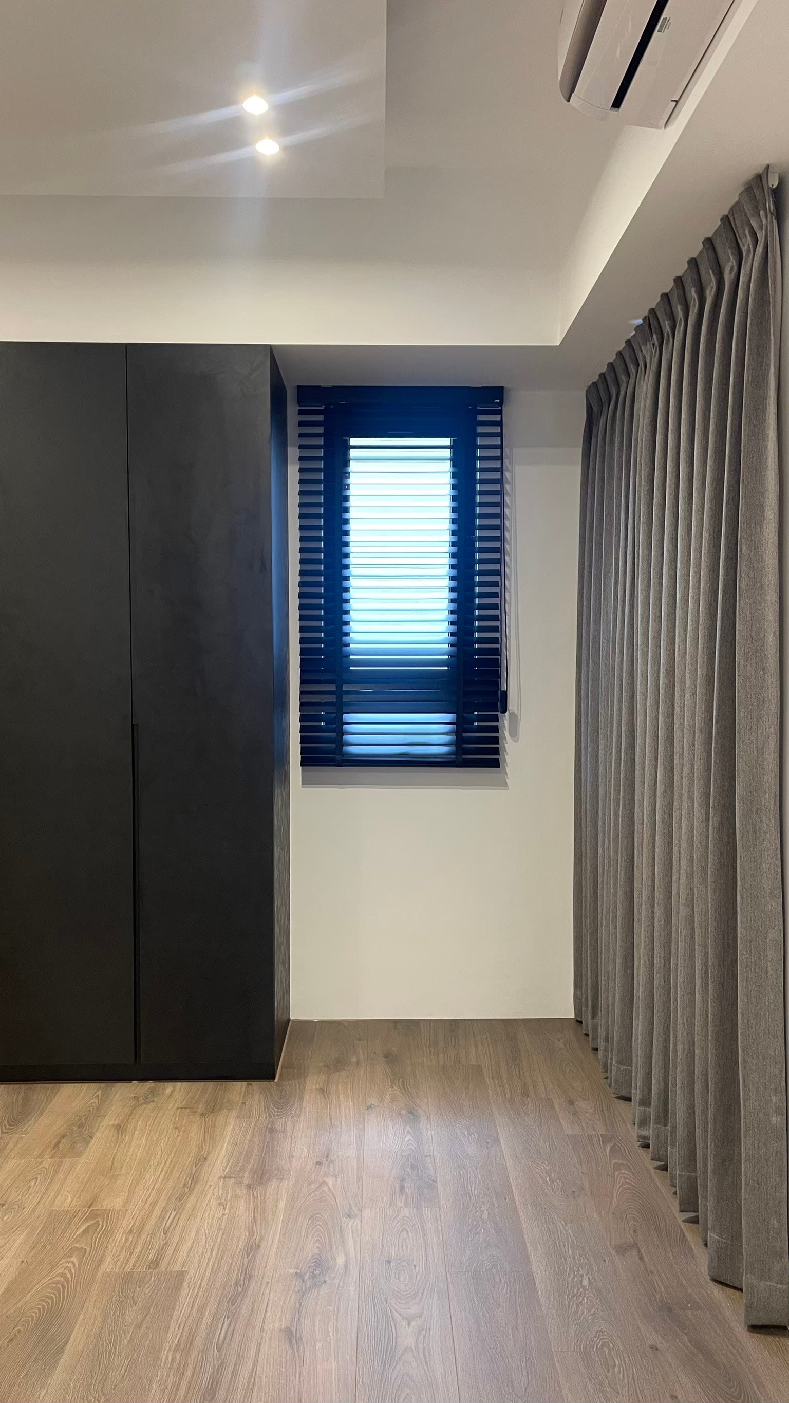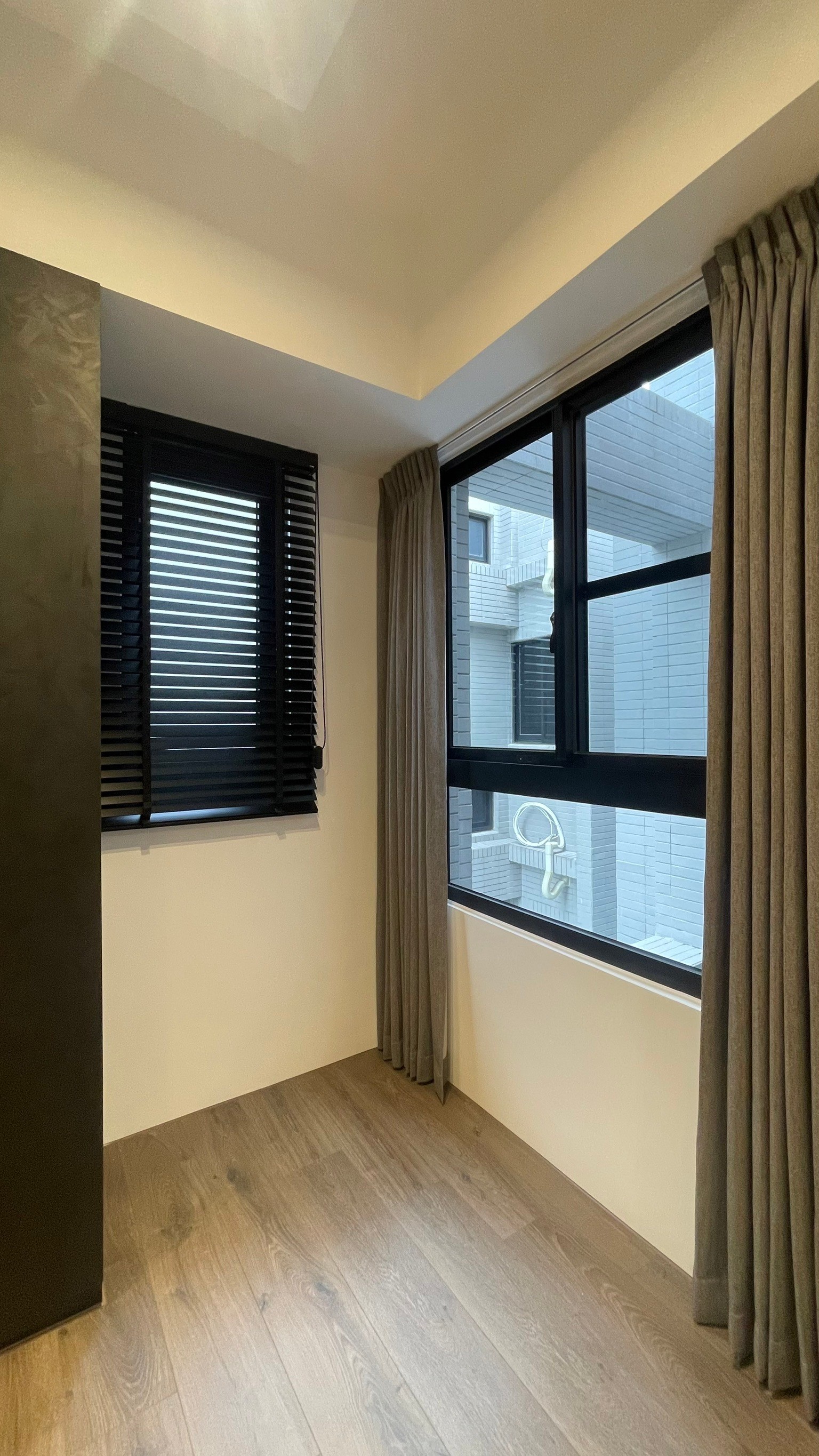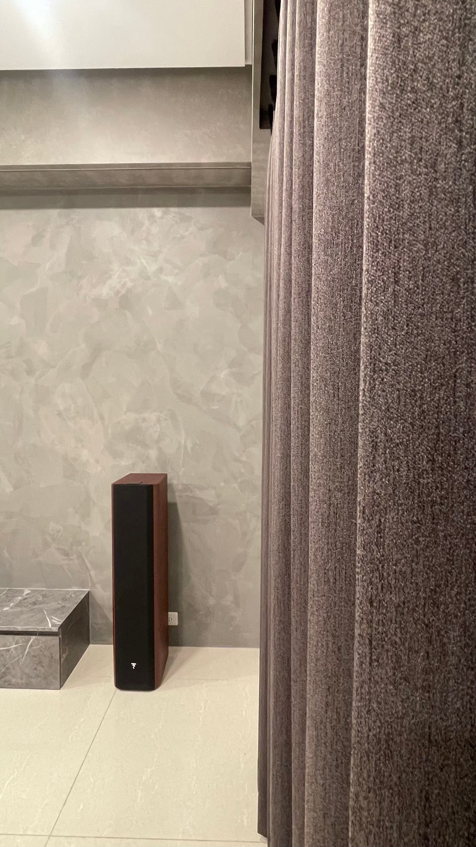 客廳的窗簾設計以「遮光布簾+霧感柔光紗」為主,展現簡潔大方的氛圍。外層深灰色遮光布簾能在需要時完全隔絕光線,提供安靜私密的休憩環境;內層白色霧感紗簾則在白天引入柔和光線,讓空間保持明亮卻不刺眼。雙層搭配既能靈活控制光線,又增添層次感,與灰色牆面及淨白地板相互呼應,使空間更顯現代感與質感。