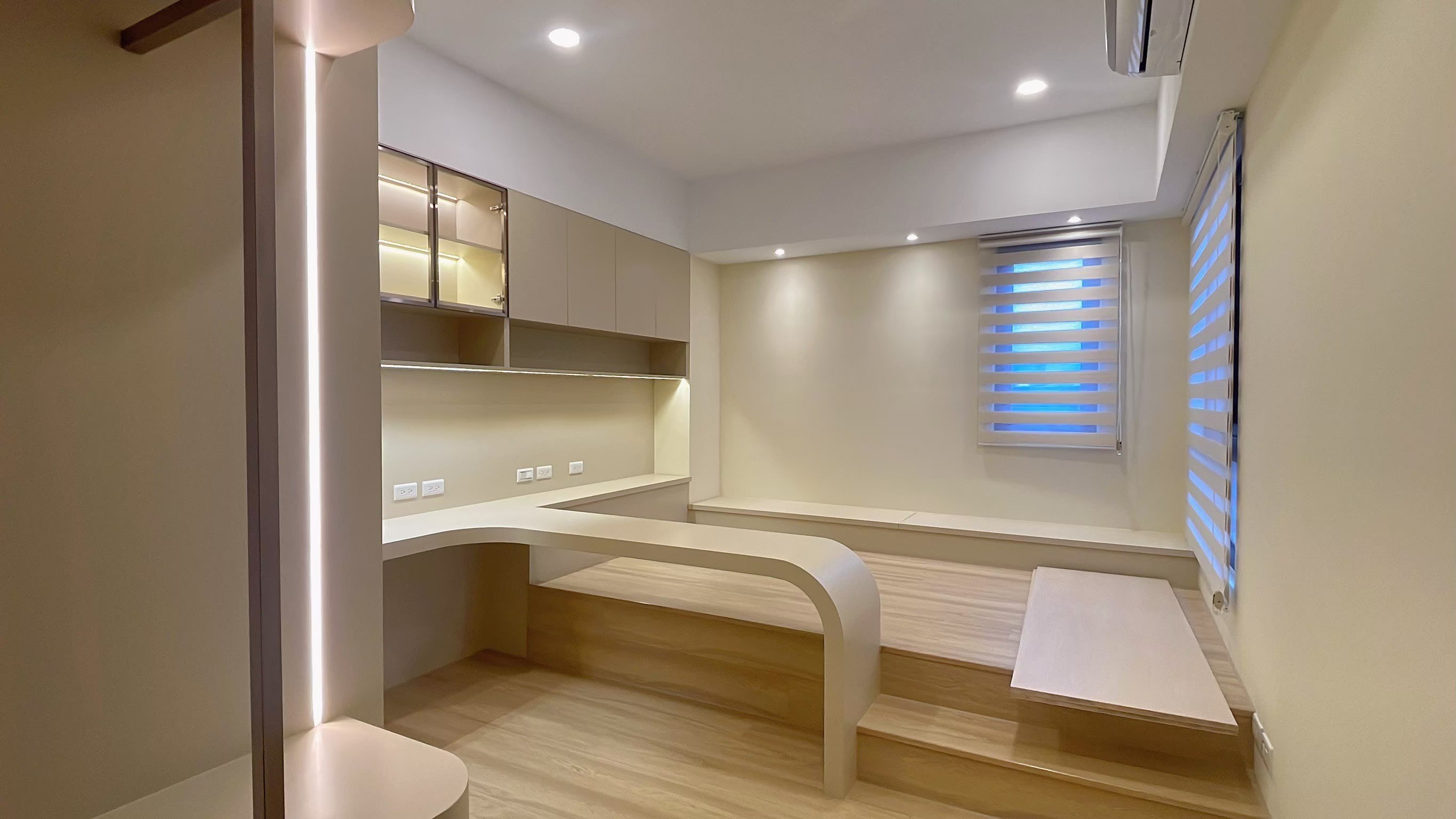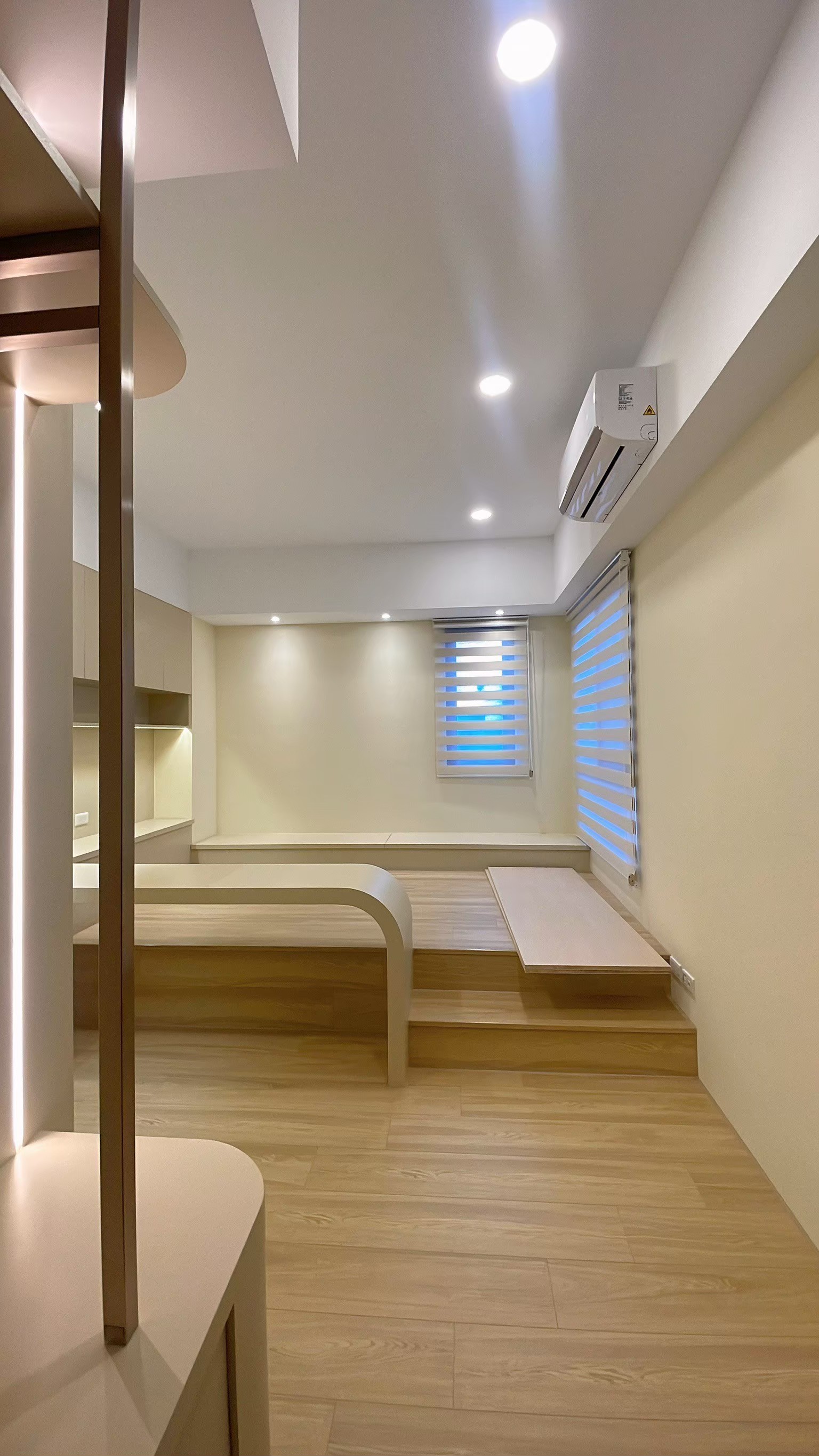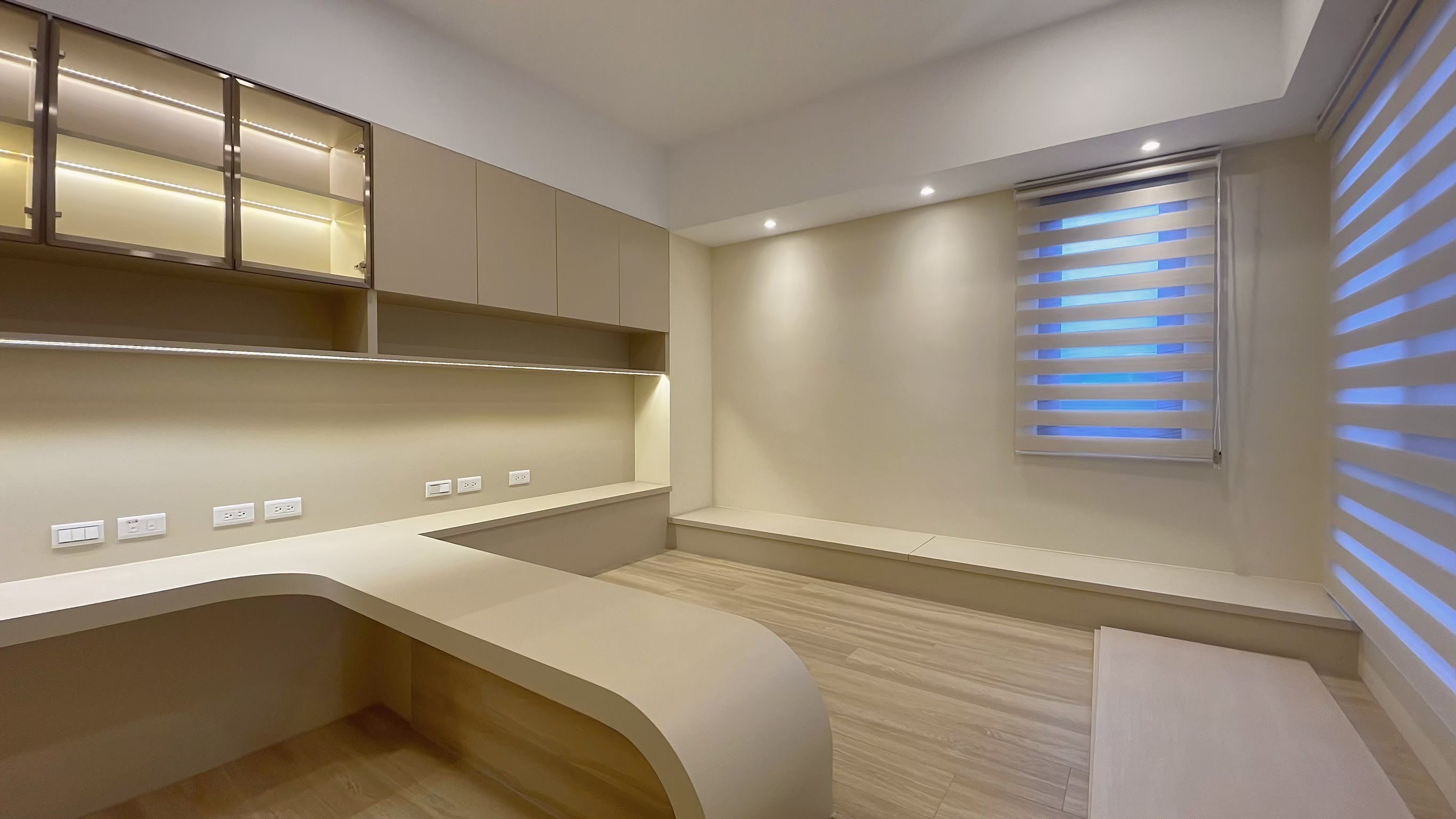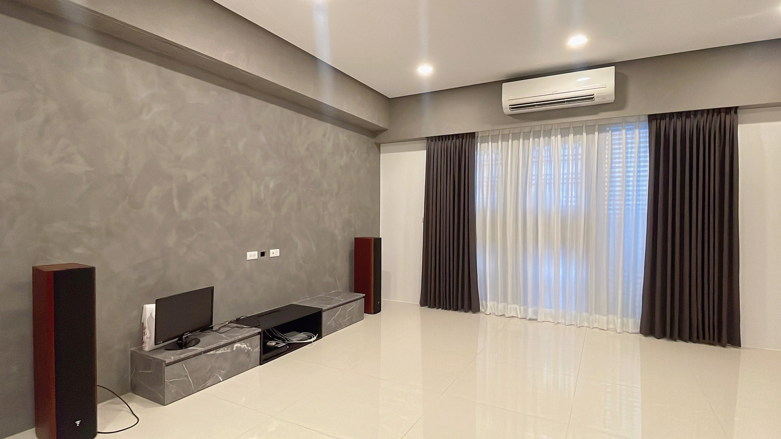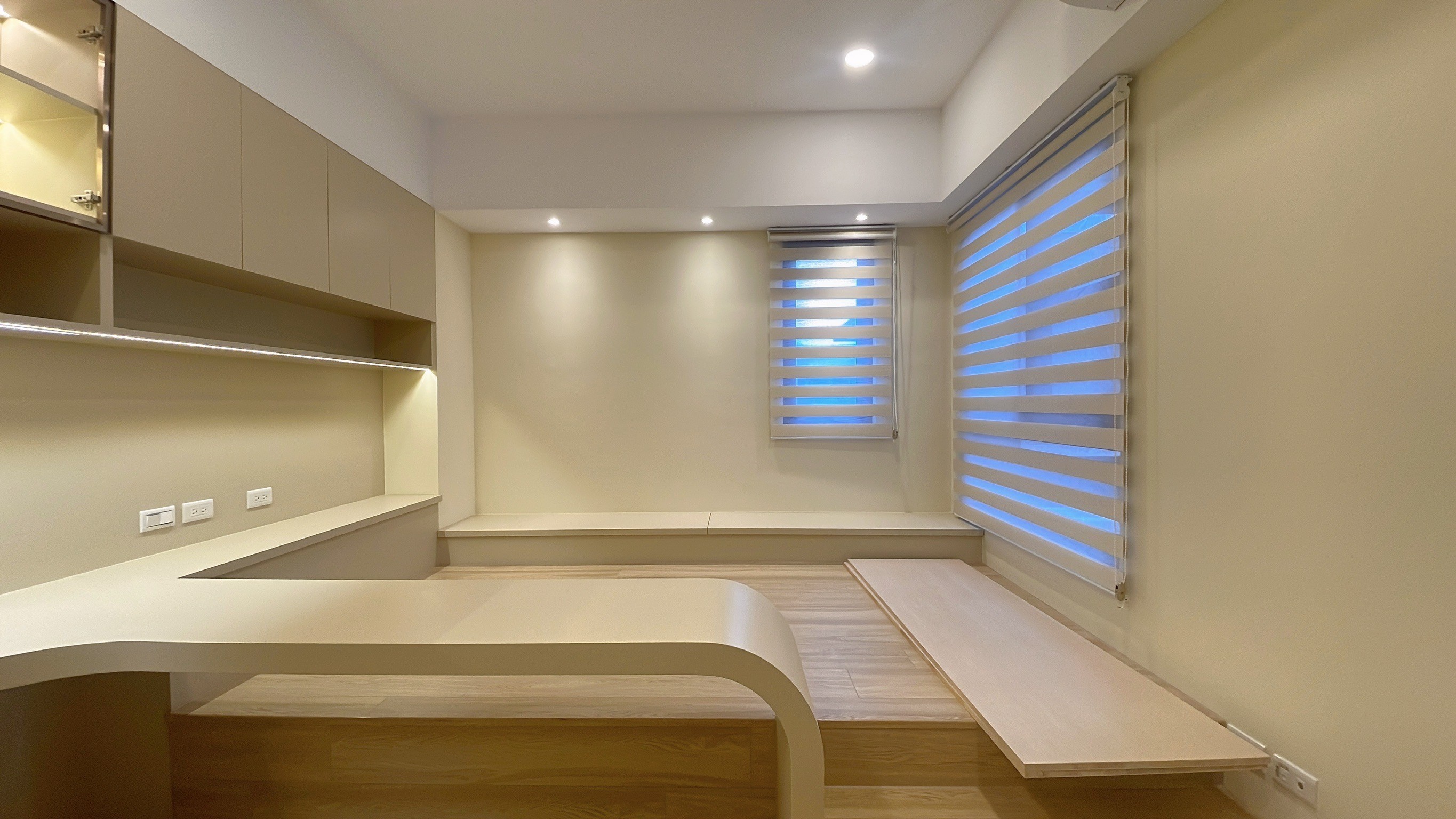 客廳的窗簾設計以「遮光布簾+霧感柔光紗」為主,展現簡潔大方的氛圍。外層深灰色遮光布簾能在需要時完全隔絕光線,提供安靜私密的休憩環境;內層白色霧感紗簾則在白天引入柔和光線,讓空間保持明亮卻不刺眼。雙層搭配既能靈活控制光線,又增添層次感,與灰色牆面及淨白地板相互呼應,使空間更顯現代感與質感。