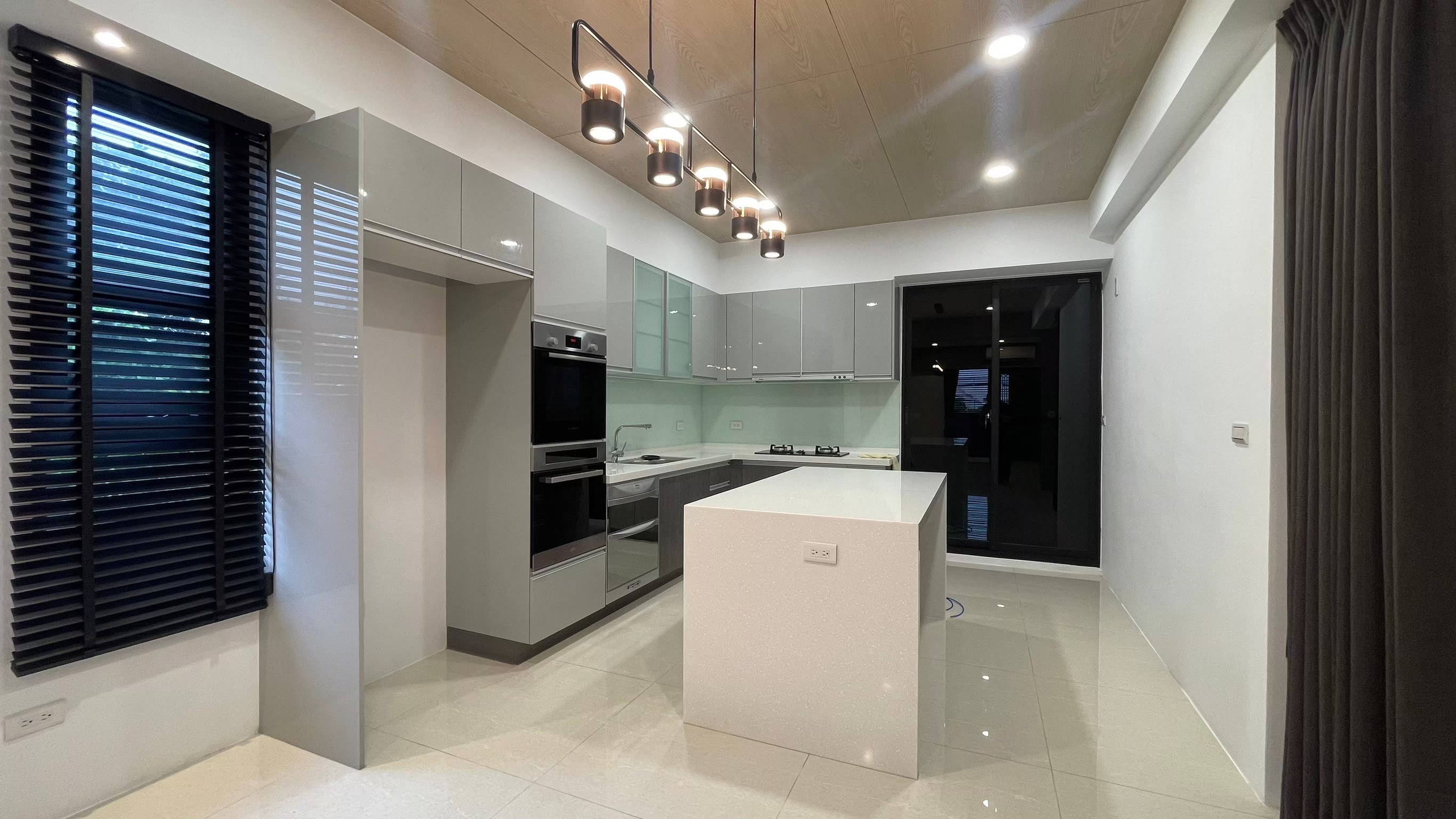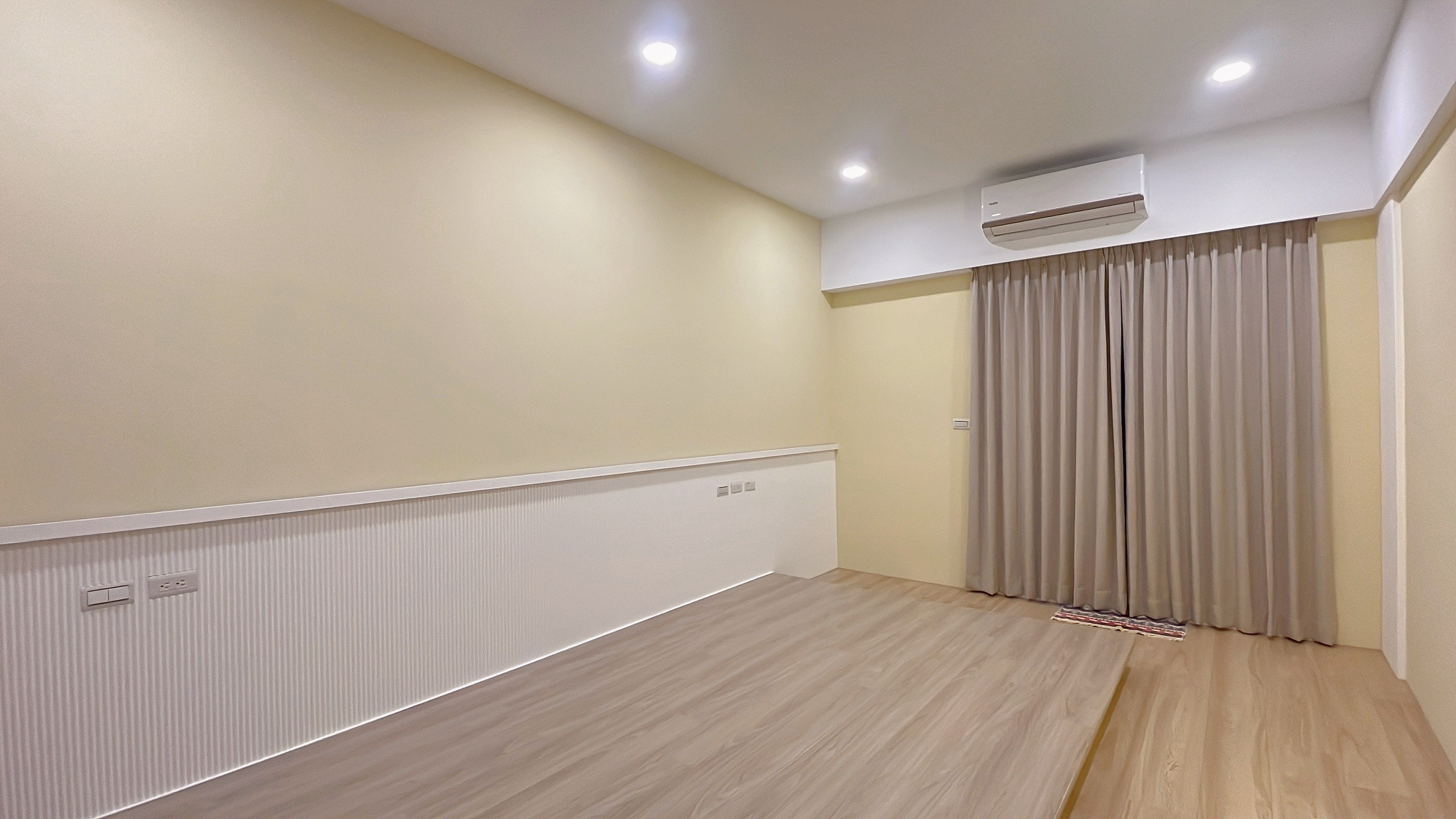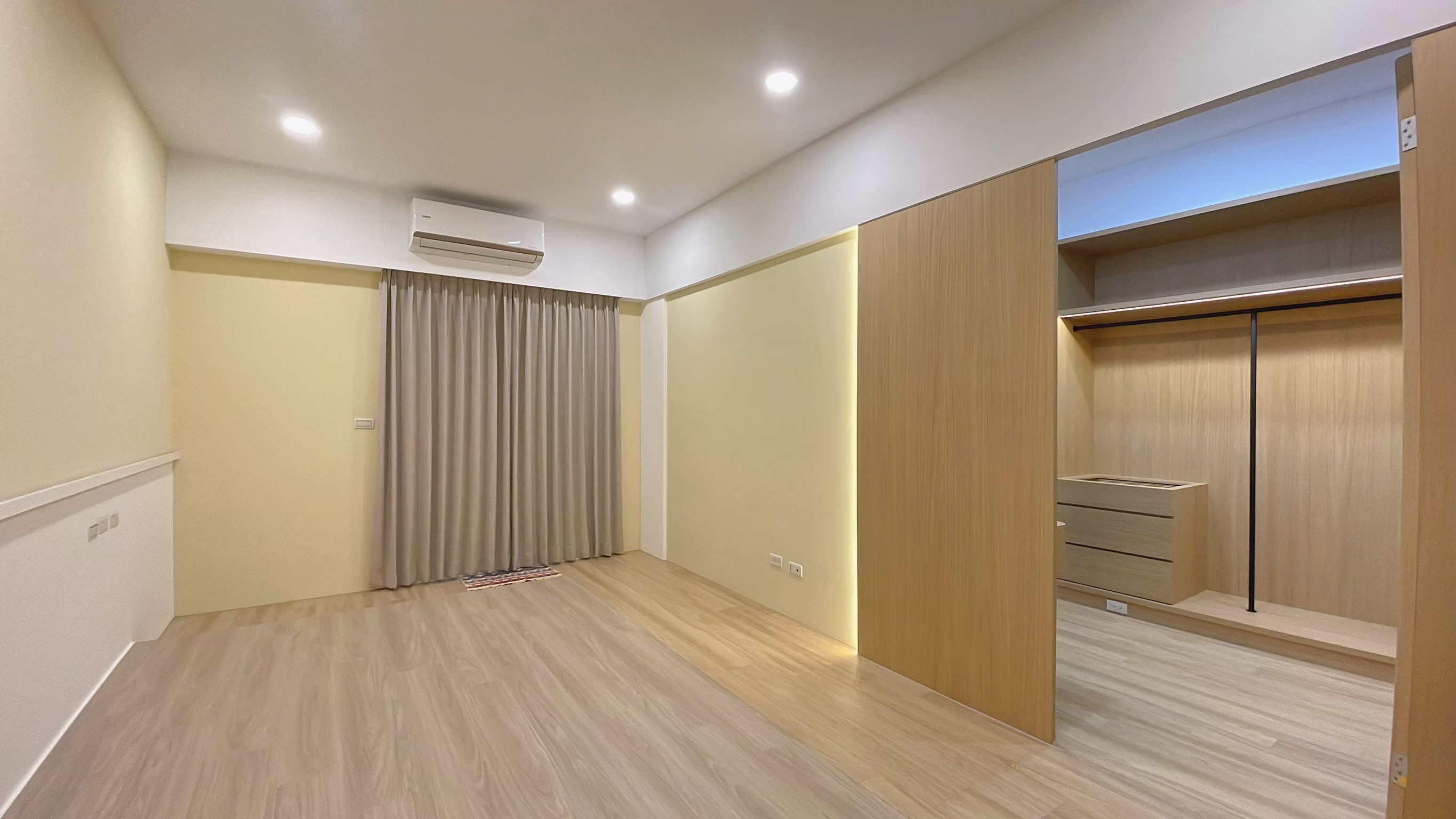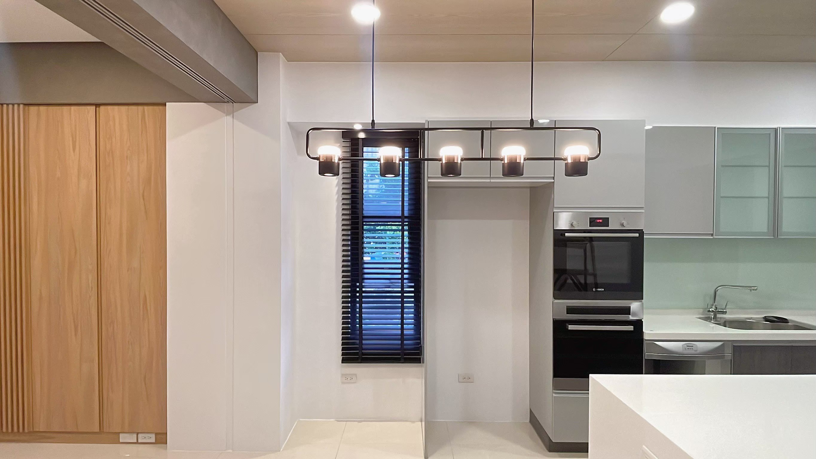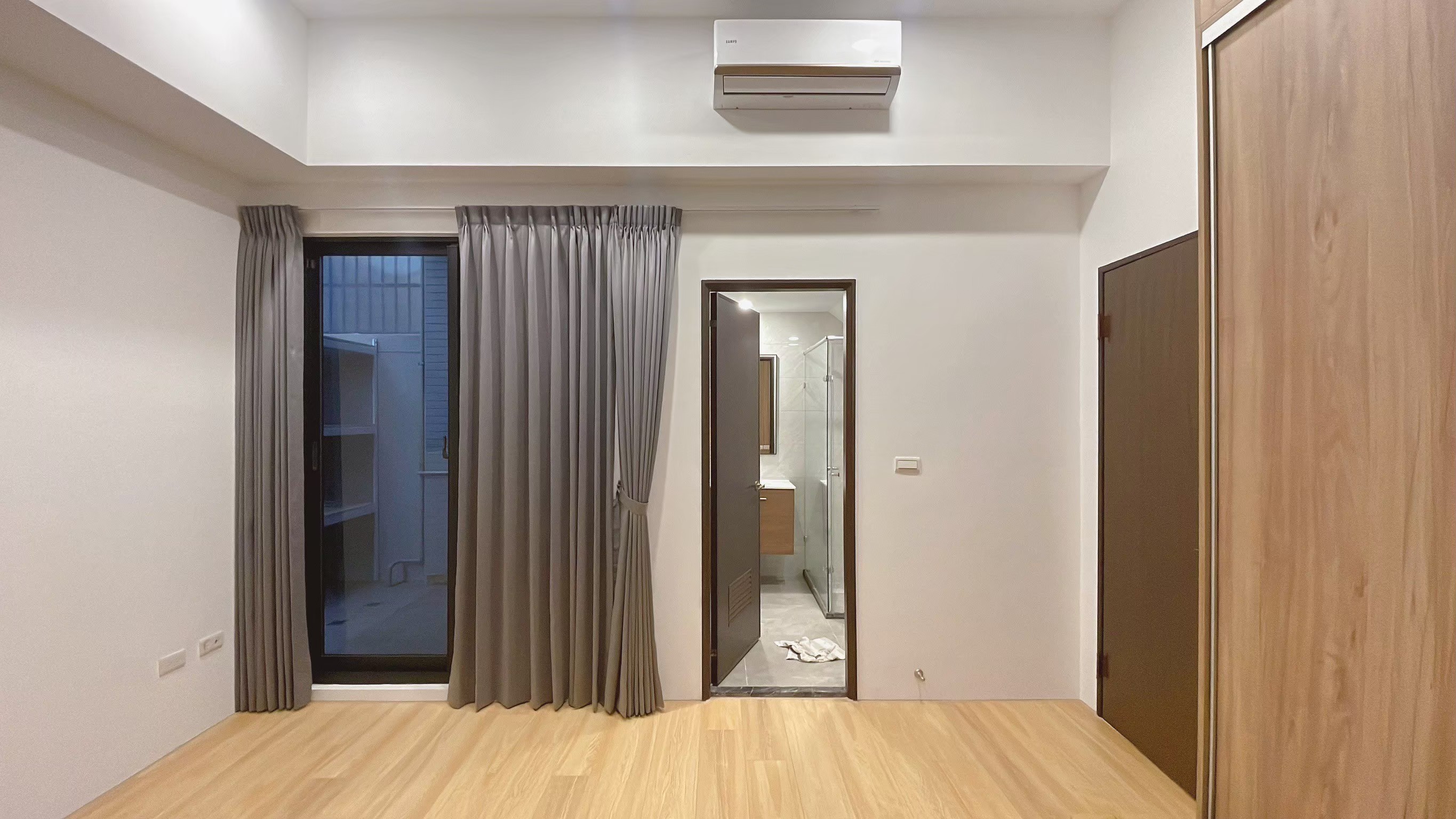 客廳的窗簾設計以「遮光布簾+霧感柔光紗」為主,展現簡潔大方的氛圍。外層深灰色遮光布簾能在需要時完全隔絕光線,提供安靜私密的休憩環境;內層白色霧感紗簾則在白天引入柔和光線,讓空間保持明亮卻不刺眼。雙層搭配既能靈活控制光線,又增添層次感,與灰色牆面及淨白地板相互呼應,使空間更顯現代感與質感。