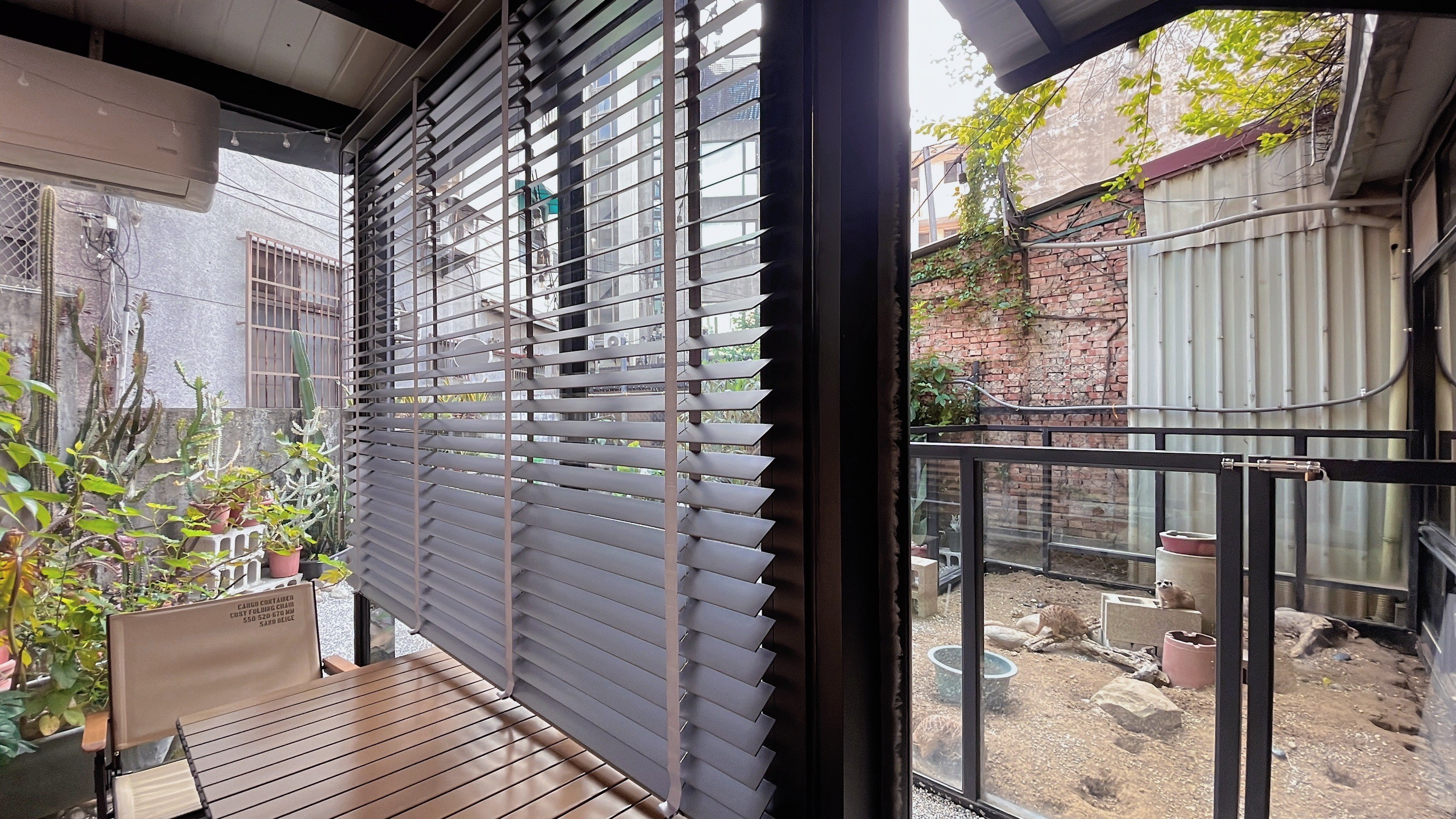 玻璃屋的窗飾選用純色原木百葉簾,展現簡約而自然的質感。木質葉片能依角度調整光線強弱,白天時柔和過濾陽光,夜晚則能維持私密性。純色設計讓空間更顯清爽俐落,與戶外的綠植與紅磚牆形成對比,帶出溫暖又具現代感的氛圍。百葉簾的線條感也呼應玻璃屋結構,營造出輕盈且富有層次的視覺效果,非常適合休憩或小聚的場域。