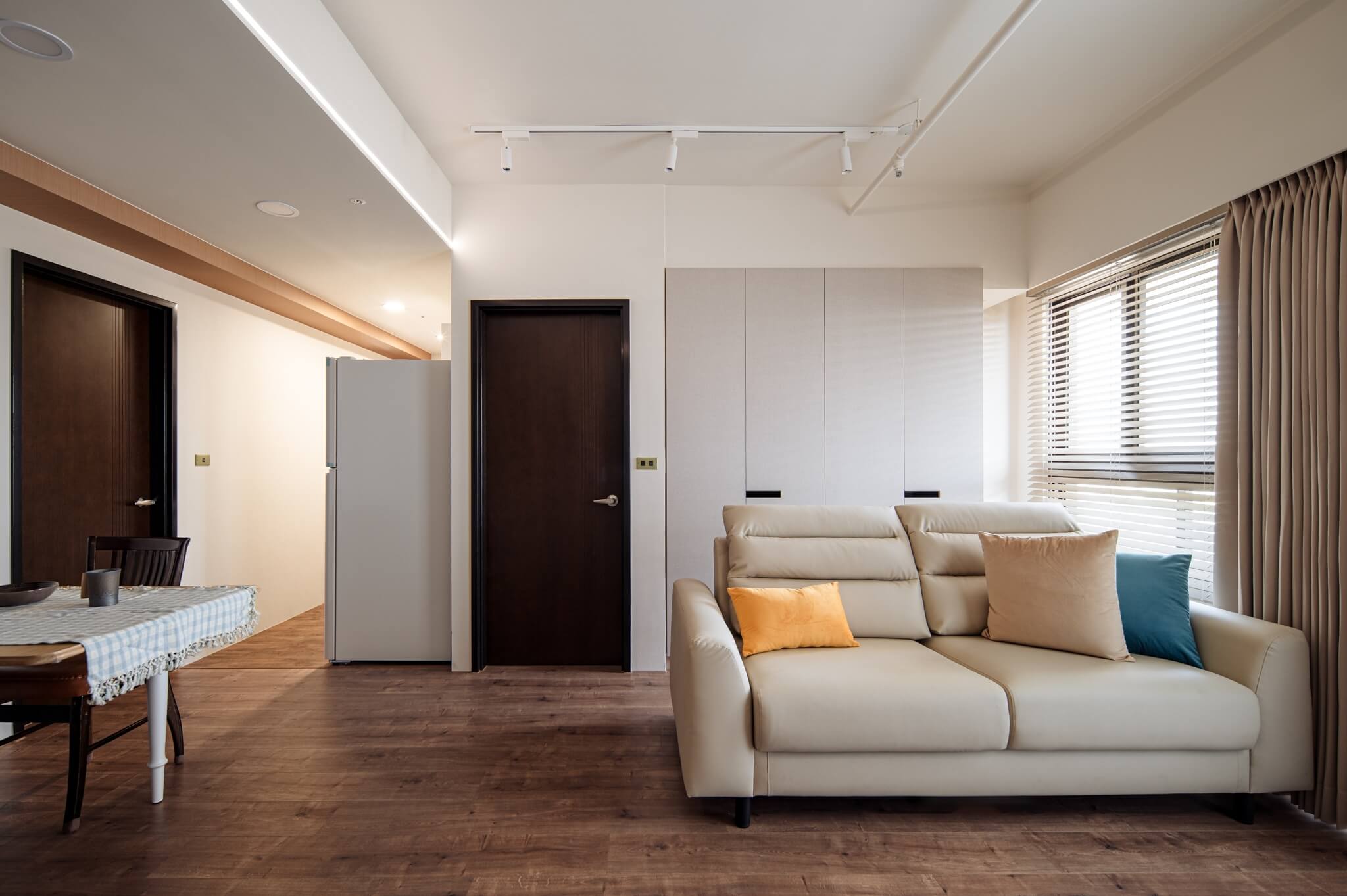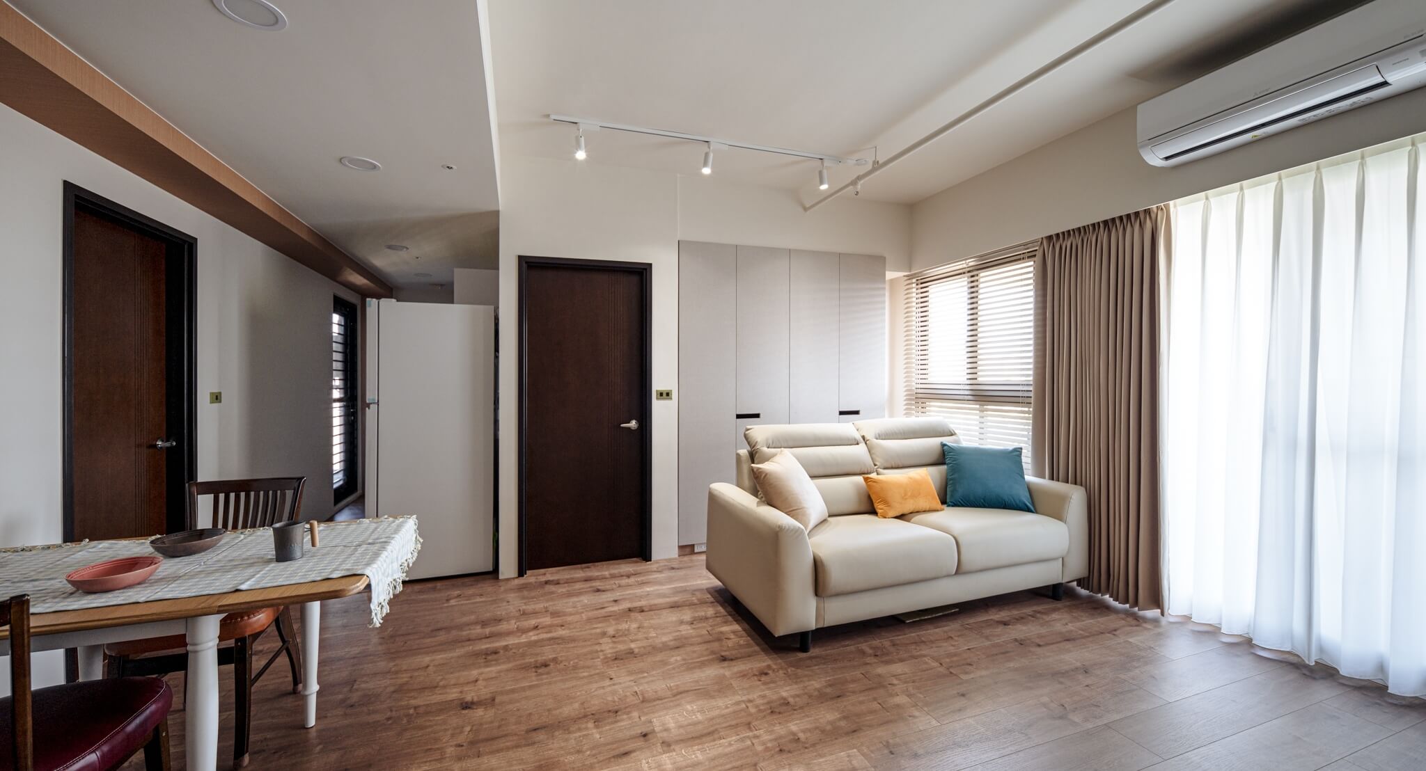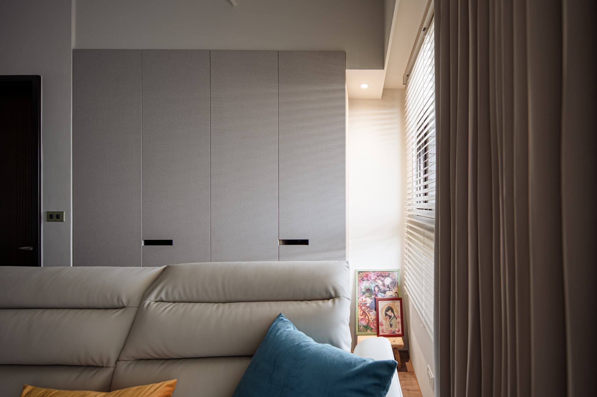 結合遮光布簾、高隱私霧光紗,讓光線控制更靈活。白色紗簾帶來柔和自然光,使室內保持明亮通透;咖啡色布簾則能完全遮光,提供隱私與安定感;一旁的木百葉簾則能細緻調整光線角度,增添層次與自然氛圍。多層次的搭配不僅提升了實用性,也讓整體空間展現溫暖、典雅與舒適的居家質感。