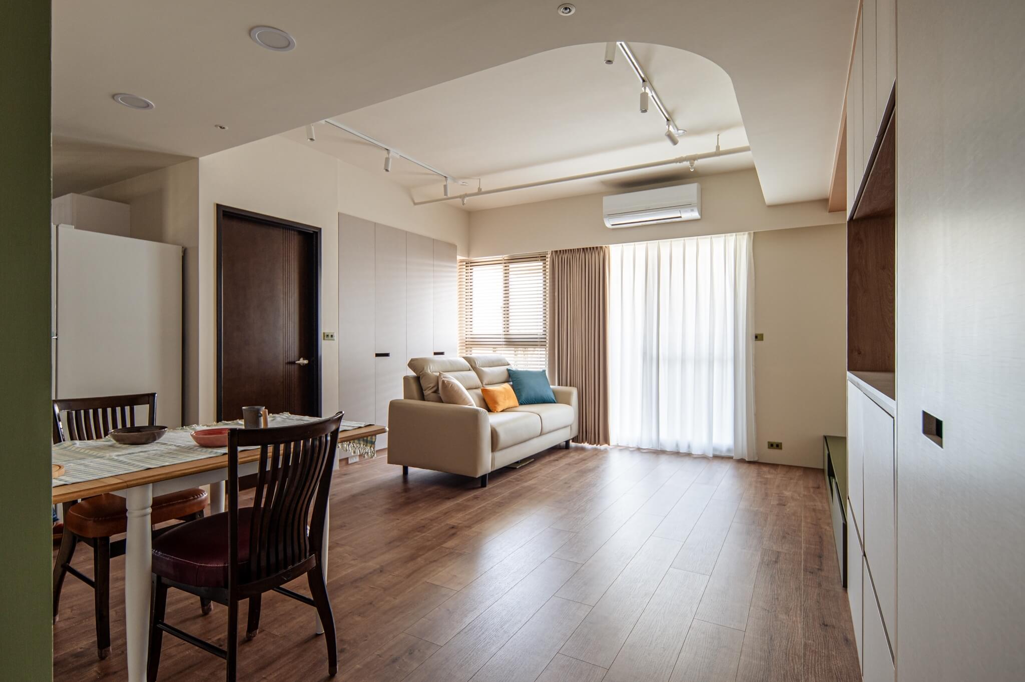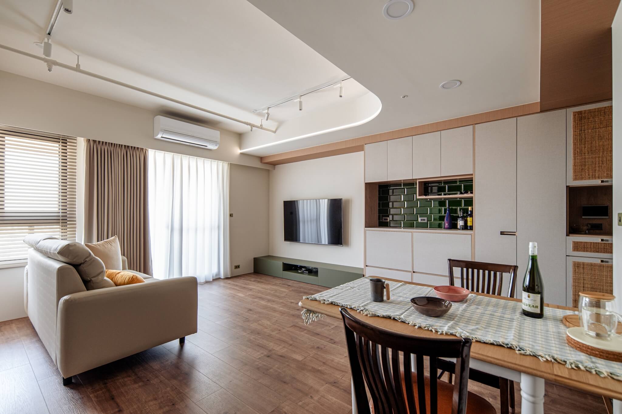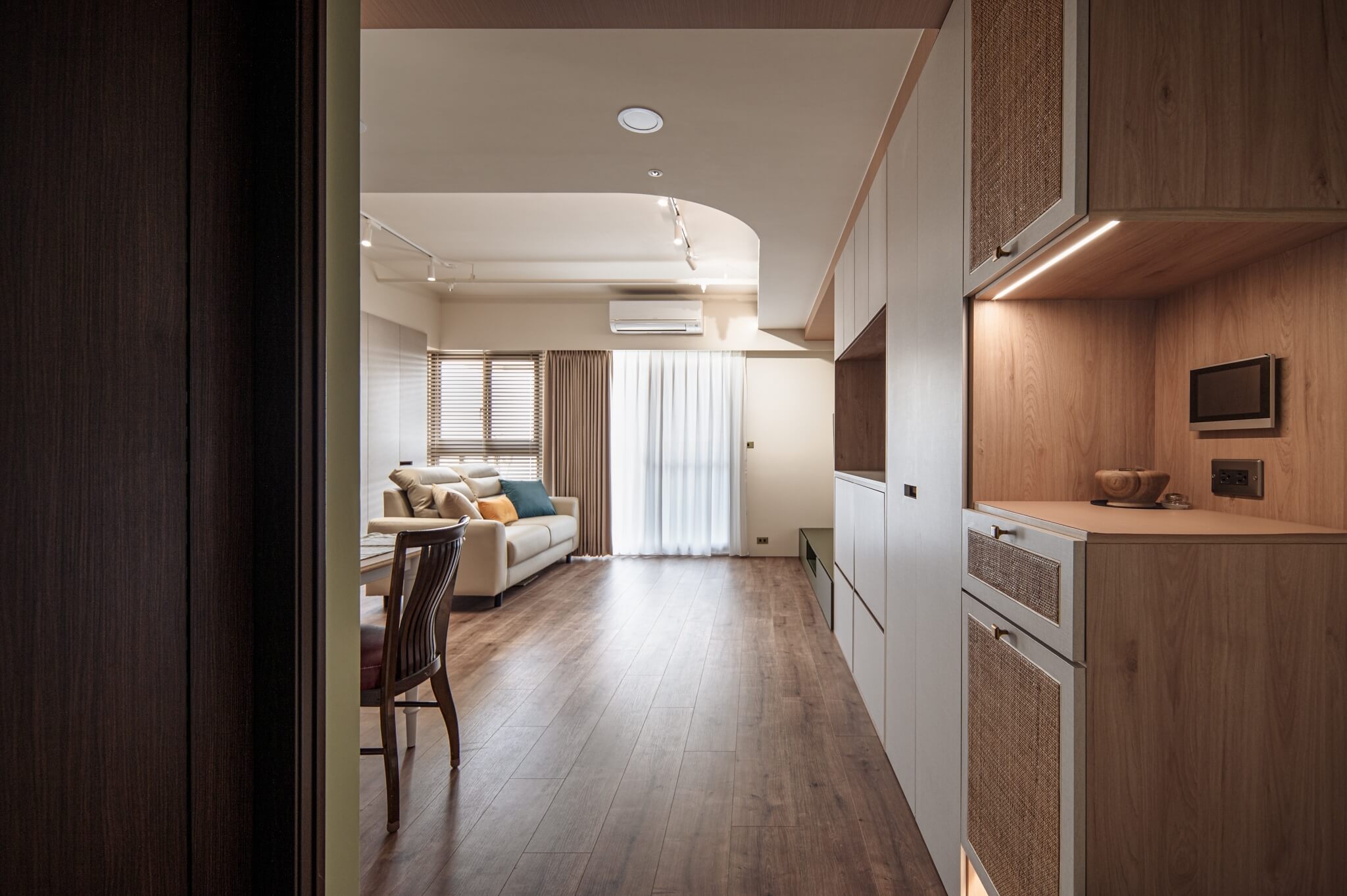 結合遮光布簾、高隱私霧光紗,讓光線控制更靈活。白色紗簾帶來柔和自然光,使室內保持明亮通透;咖啡色布簾則能完全遮光,提供隱私與安定感;一旁的木百葉簾則能細緻調整光線角度,增添層次與自然氛圍。多層次的搭配不僅提升了實用性,也讓整體空間展現溫暖、典雅與舒適的居家質感。