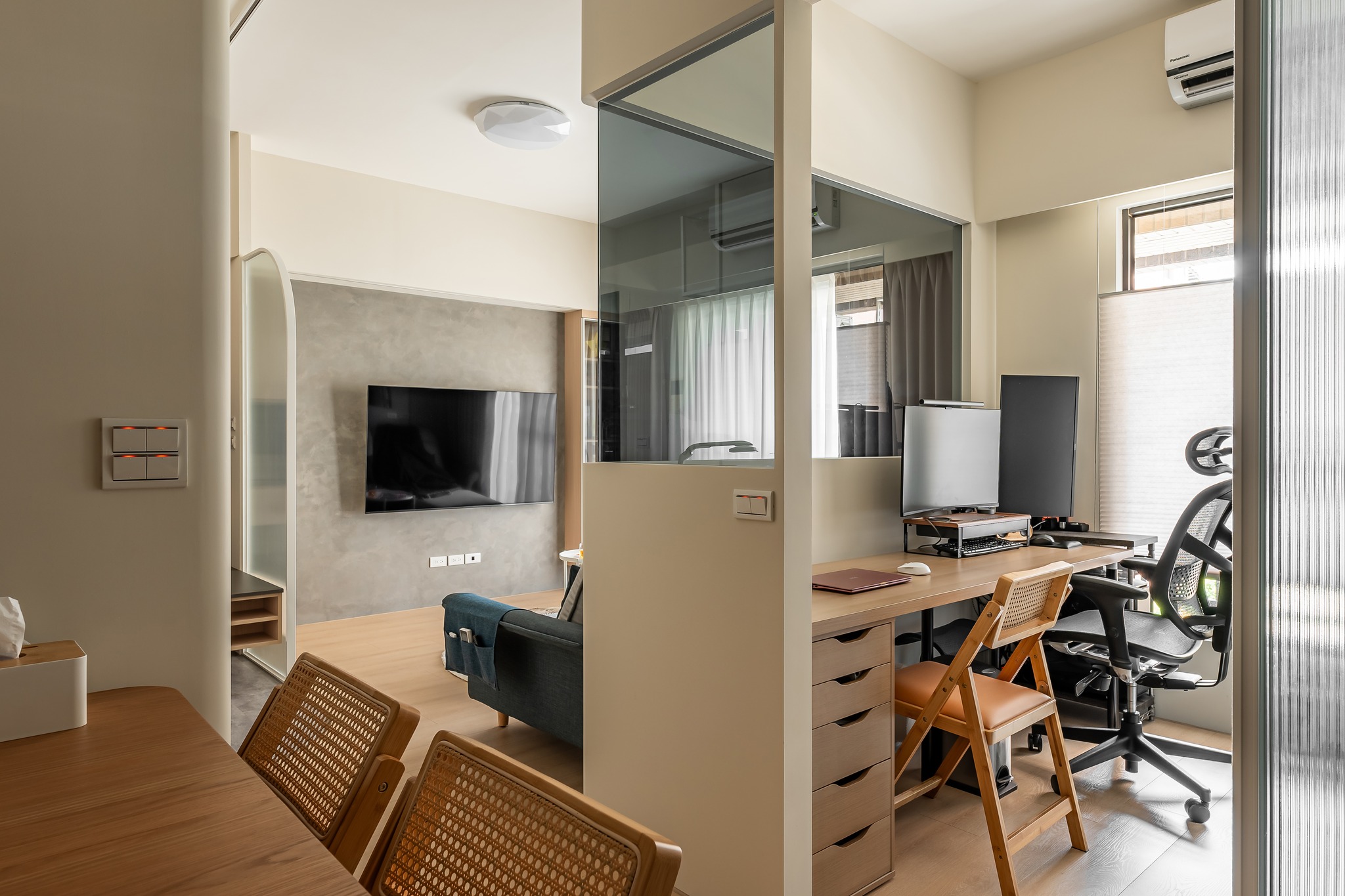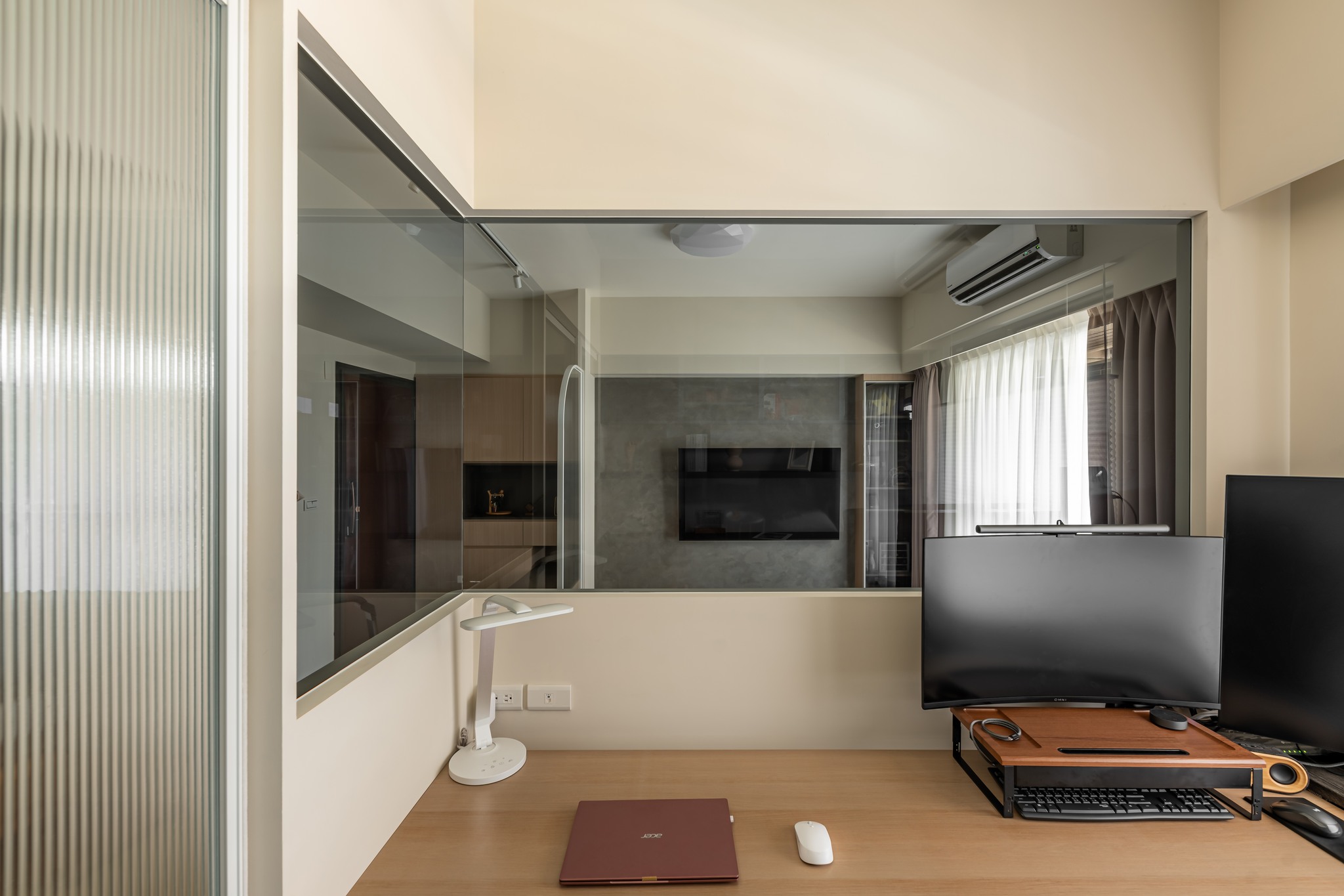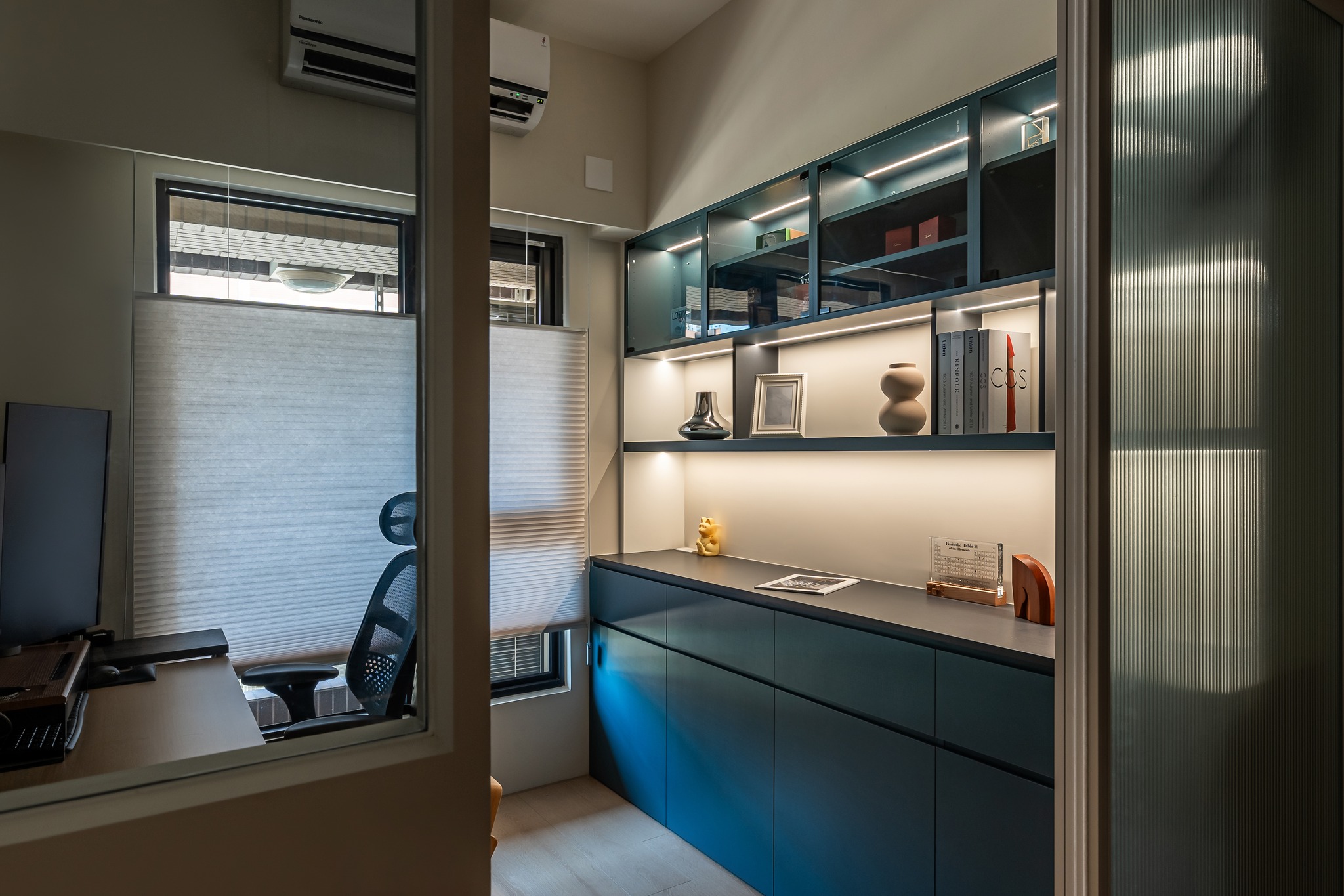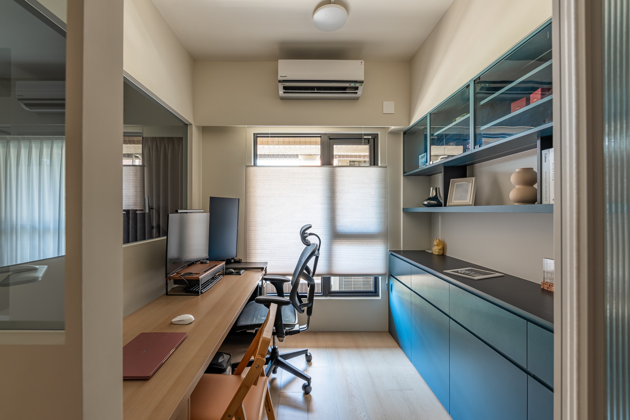 書房以半透光蜂巢簾作為窗飾,讓自然光能柔和進入,避免直射眩光影響閱讀與工作,同時保有良好的隱私。蜂巢結構具有隔熱效果,能讓空間在使用電腦或專心工作時更為舒適。淺灰色簾面與整體現代感的收納櫃、燈帶相呼應,讓書房既具專業氛圍,又維持簡潔與溫潤的質感。這樣的窗簾選擇特別適合需要長時間專注的工作環境。