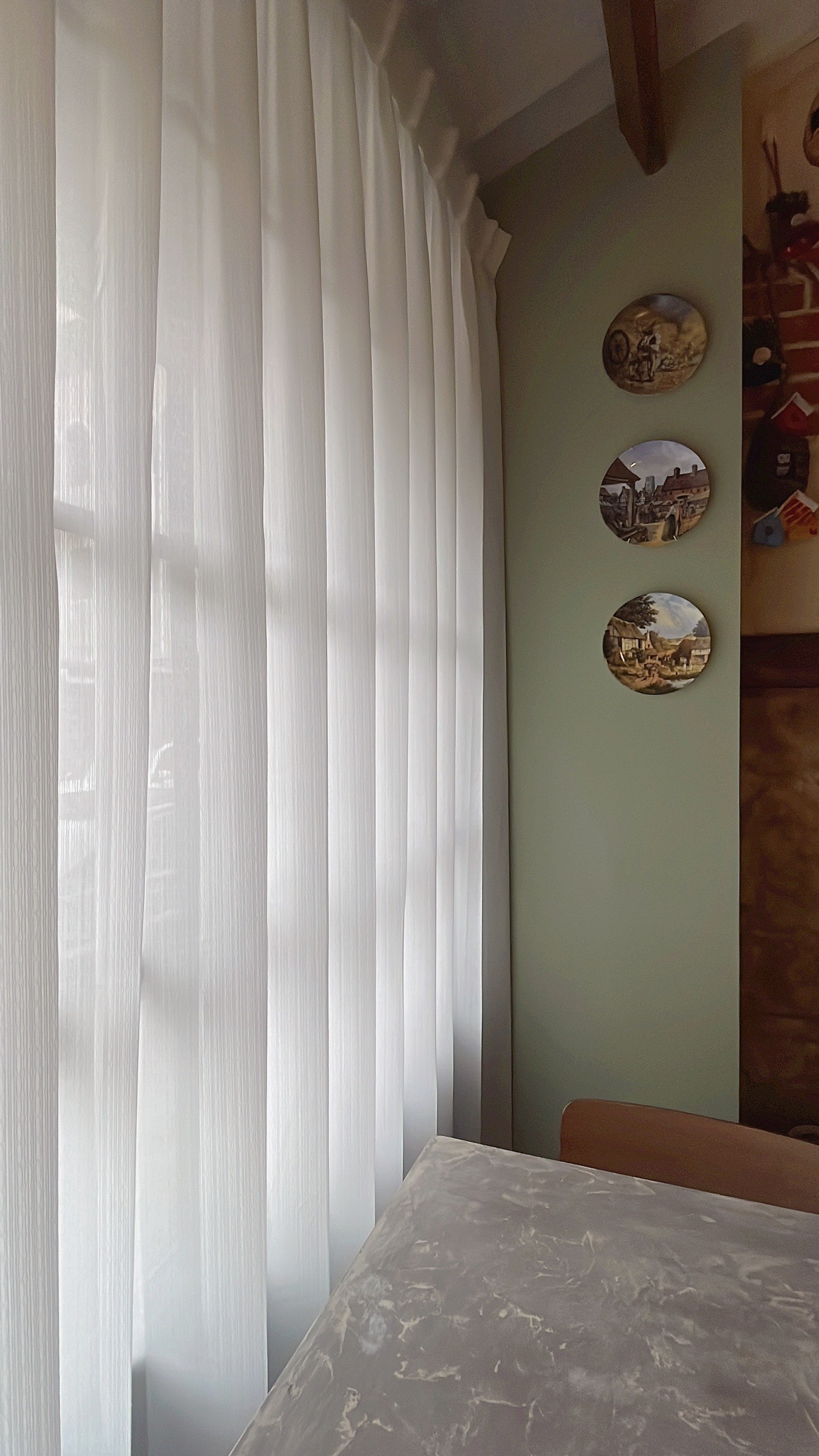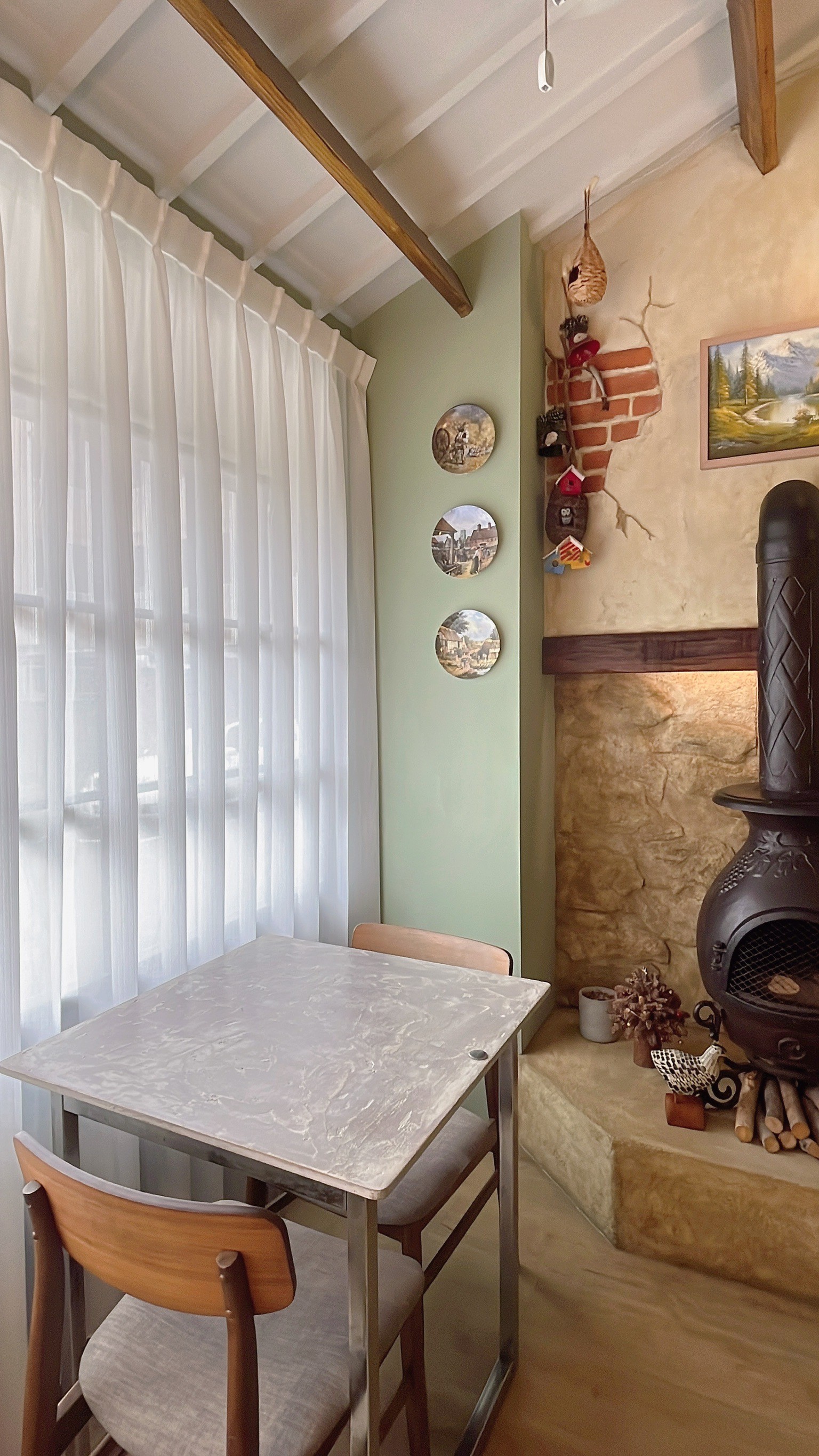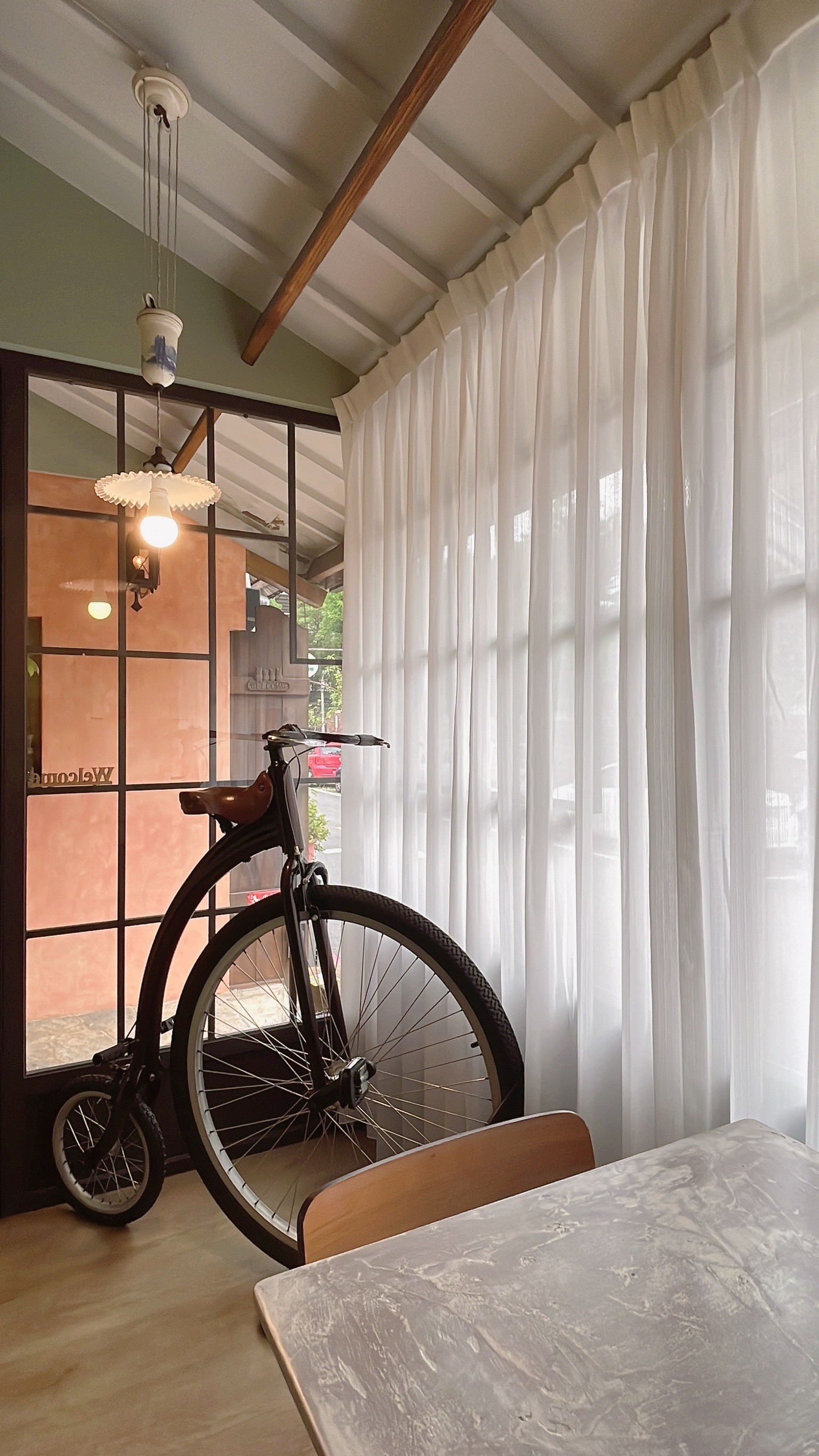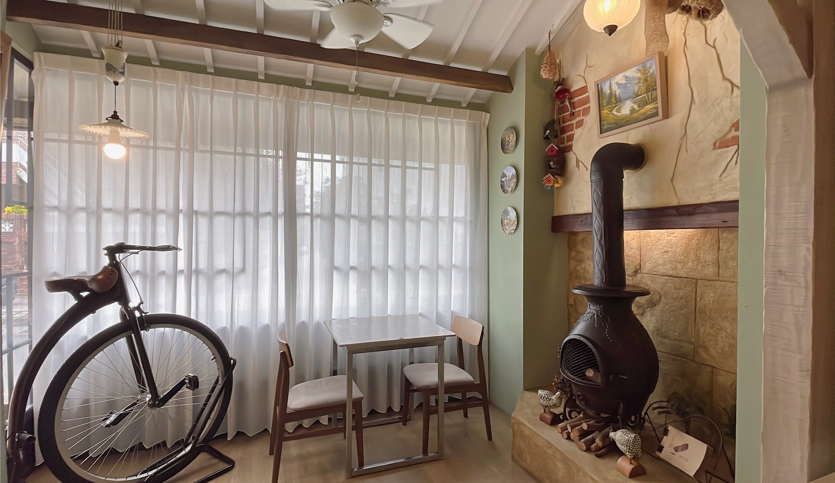 店面櫥窗的窗簾選用柔光紗簾,布料帶有細緻的復古織紋,讓自然光在室內化為柔和光暈,增添一份溫潤氛圍。透光的質感既能保持隱私,又不會遮掩窗外景致,使空間更顯通透。搭配木質家具、復古掛畫與壁爐設計,整體氛圍宛如歐式鄉村小館,充滿懷舊與溫馨的美感,讓人一走進來便感受到舒適與故事感。
