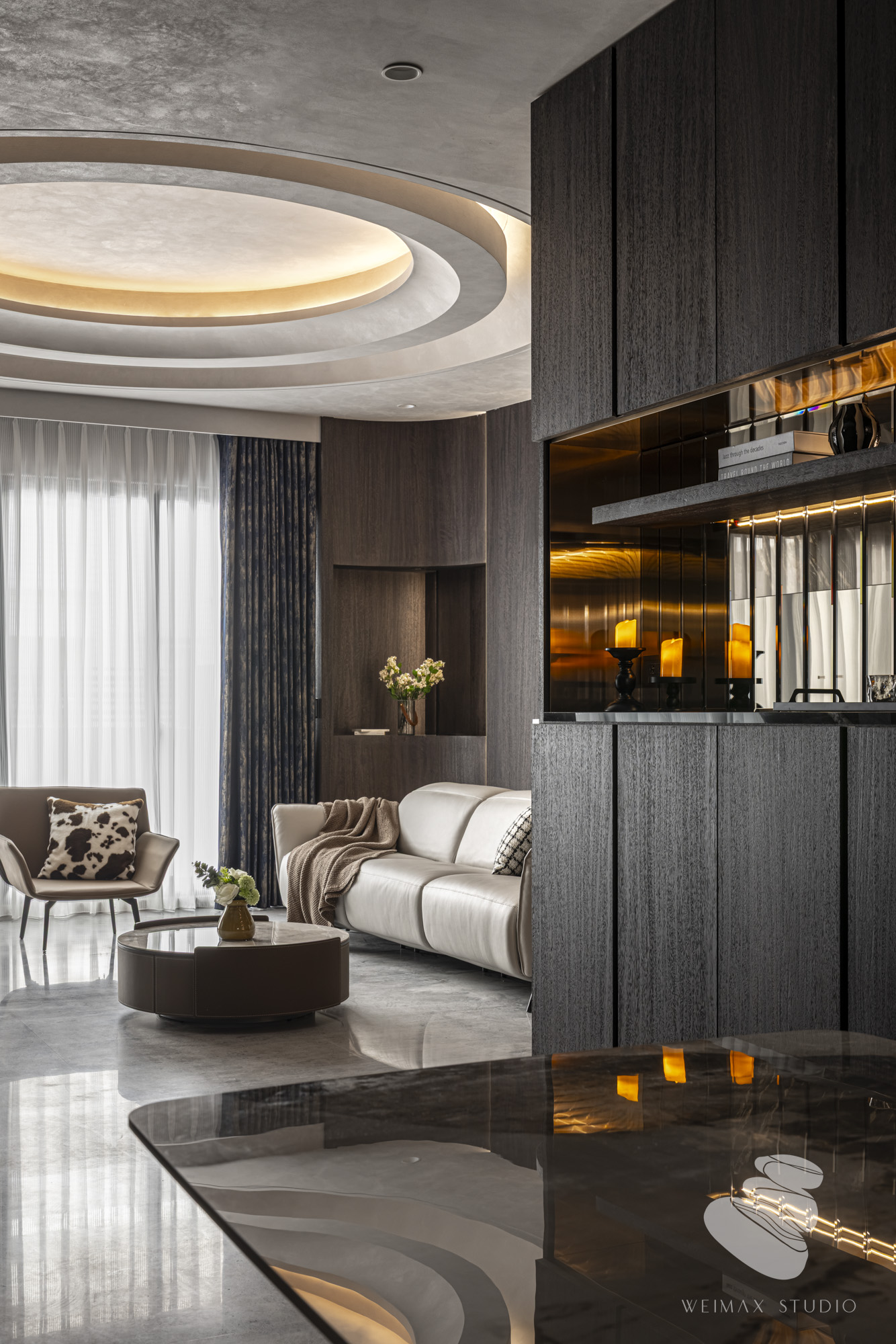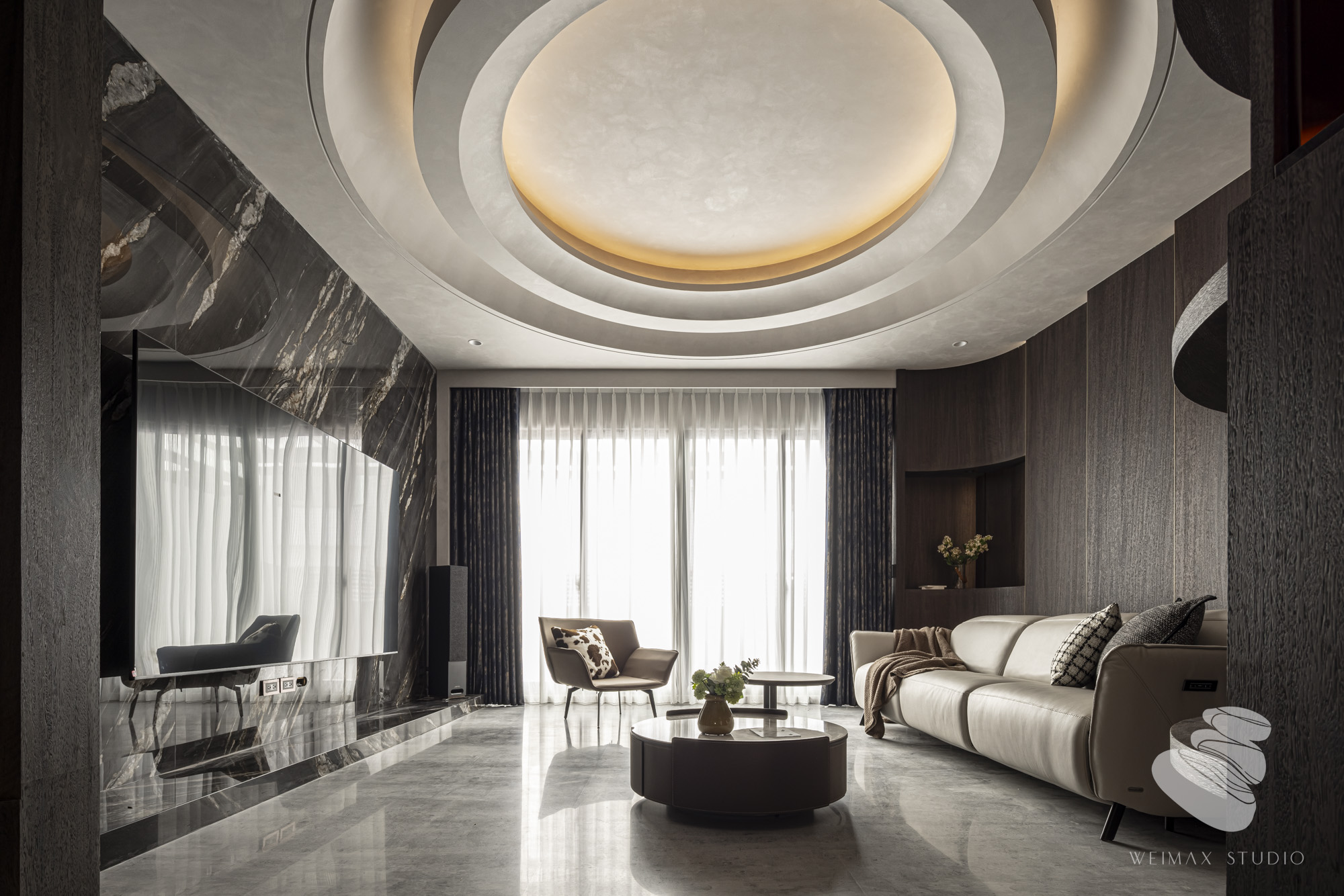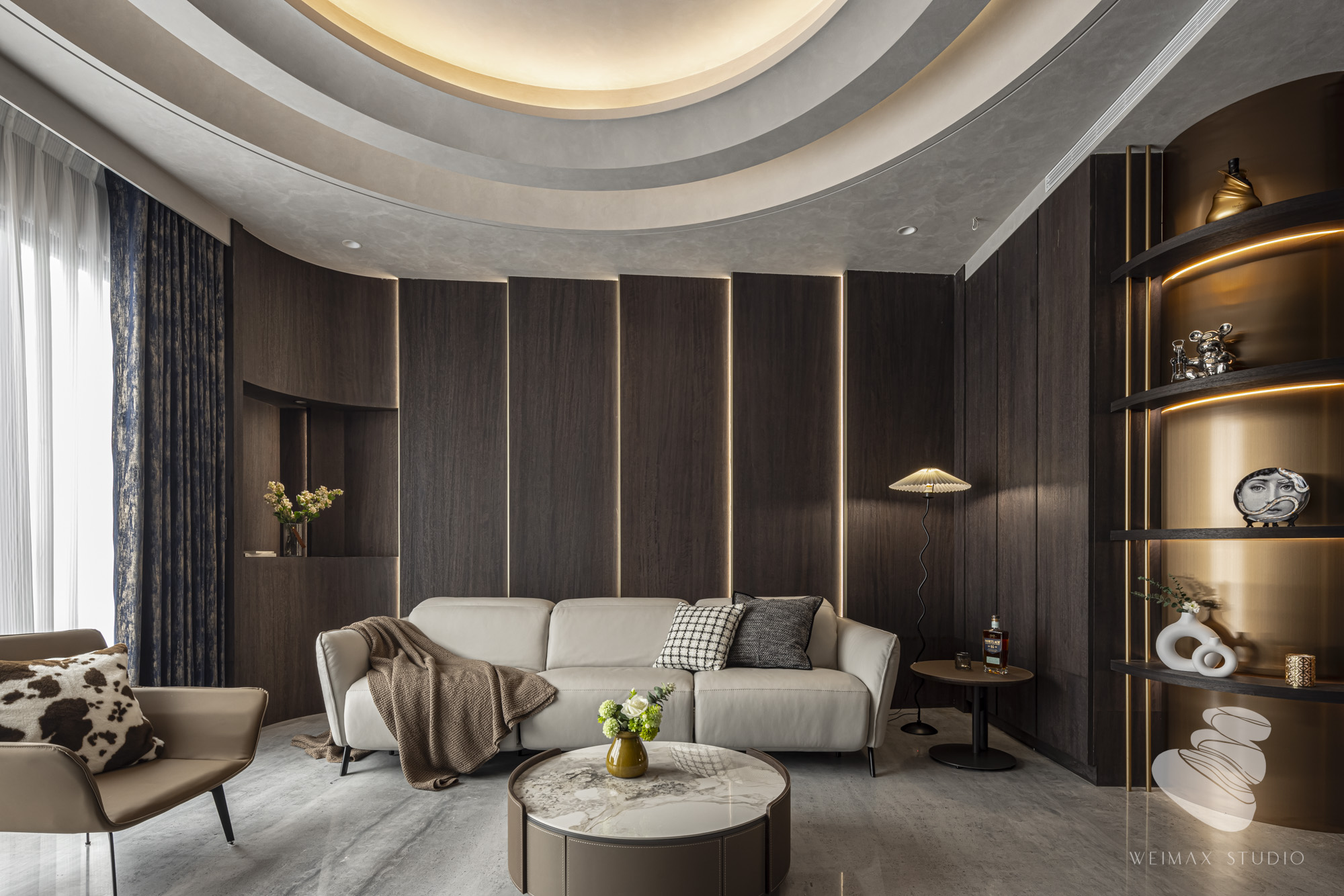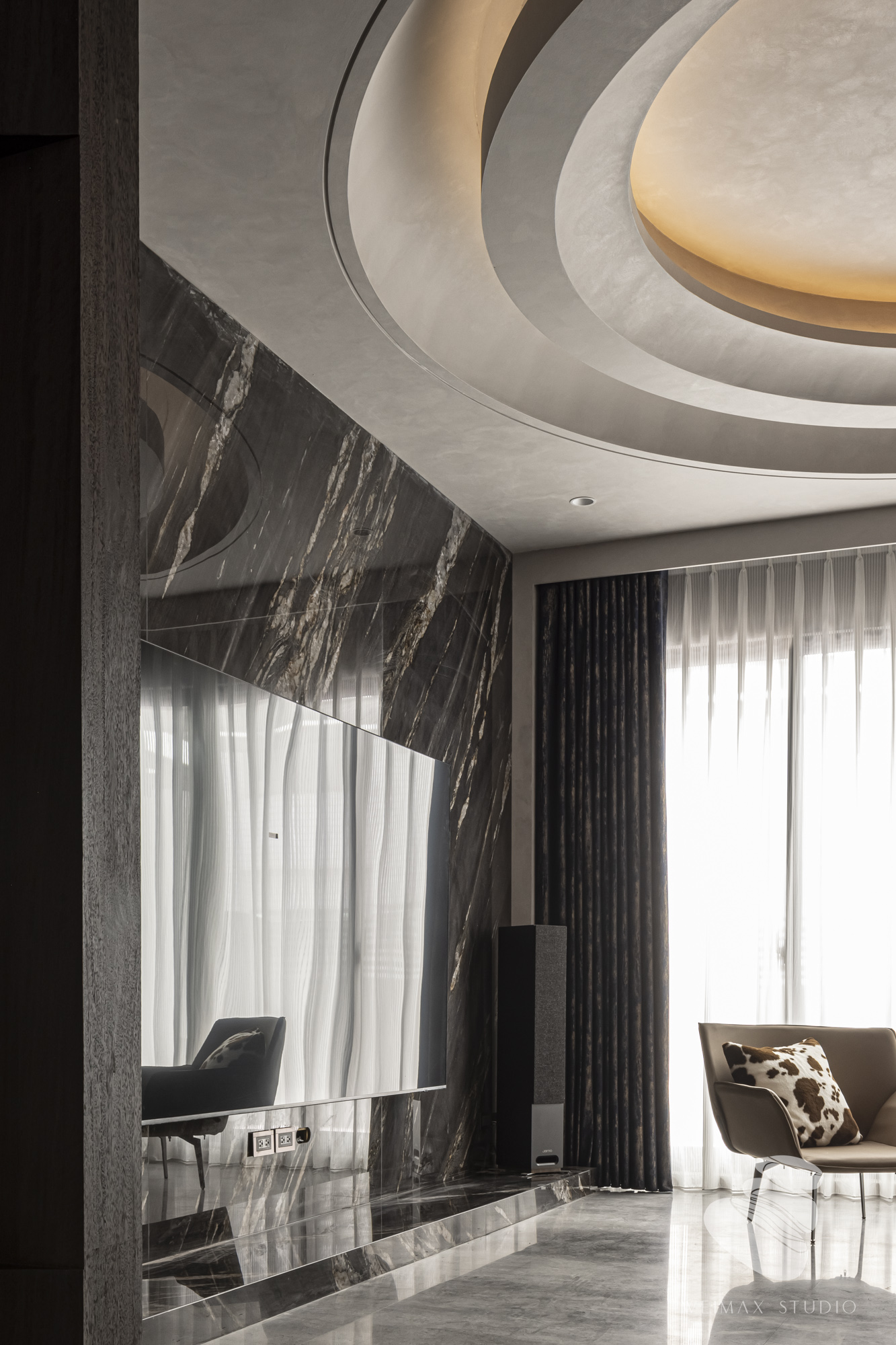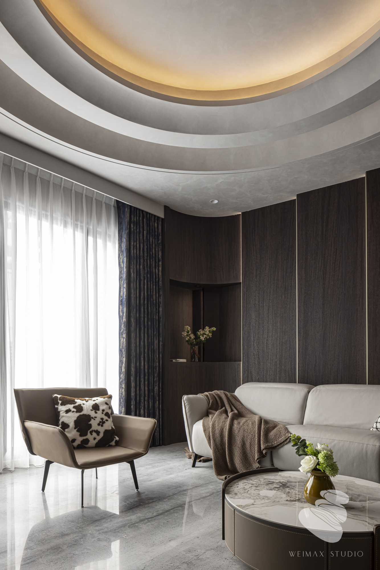 這個客廳以電動智能窗簾系統展現豪華質感,主體採用蛇形無縫燙金遮光絨布搭配造型柔光紗。深色絨布簾在關閉時能有效遮光與隔熱,營造沉穩典雅的氛圍;柔光紗則在白天柔化日光,讓室內保持明亮卻不刺眼。自動化控制提升便利性,能依不同情境自由調整光線。窗簾與大理石電視牆、弧形天花板設計呼應,整體空間展現出現代奢華與高級感。