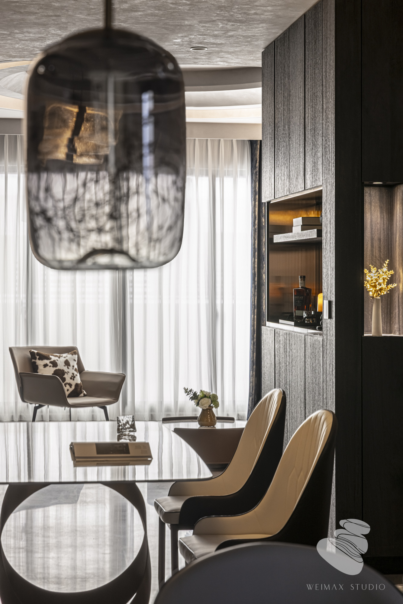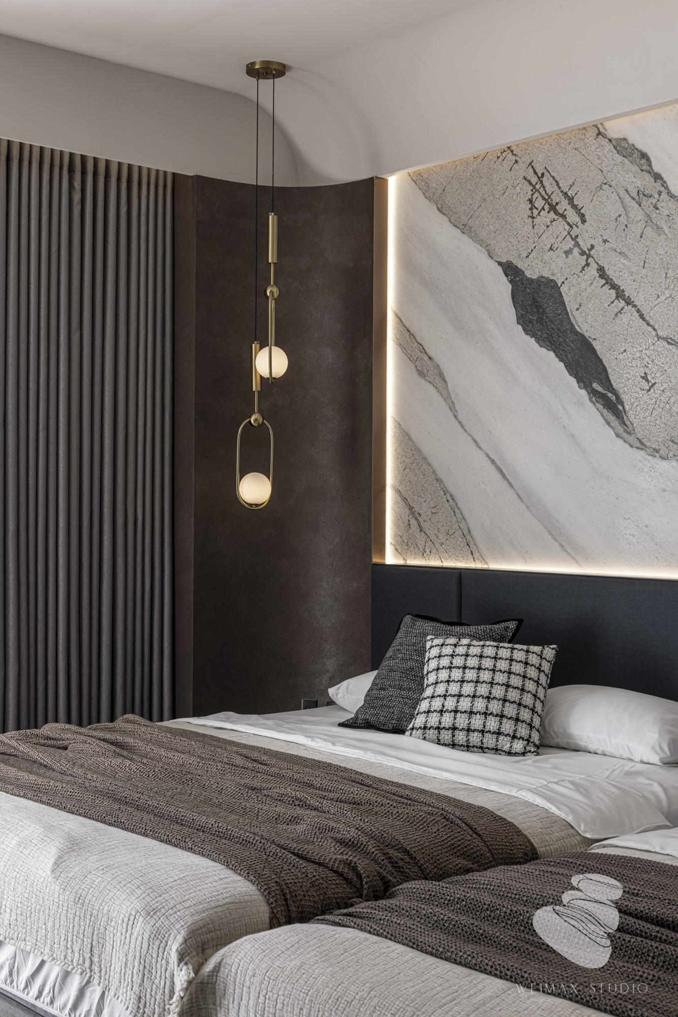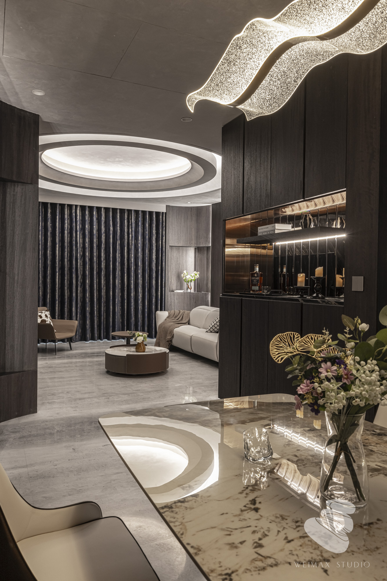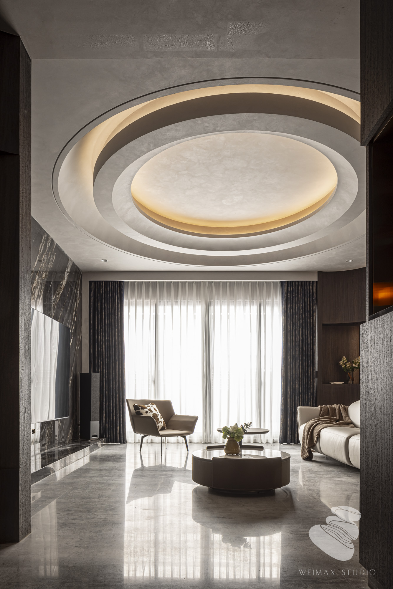 這個客廳以電動智能窗簾系統展現豪華質感,主體採用蛇形無縫燙金遮光絨布搭配造型柔光紗。深色絨布簾在關閉時能有效遮光與隔熱,營造沉穩典雅的氛圍;柔光紗則在白天柔化日光,讓室內保持明亮卻不刺眼。自動化控制提升便利性,能依不同情境自由調整光線。窗簾與大理石電視牆、弧形天花板設計呼應,整體空間展現出現代奢華與高級感。