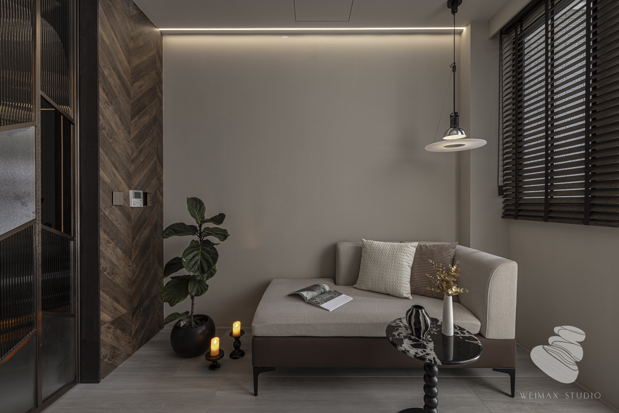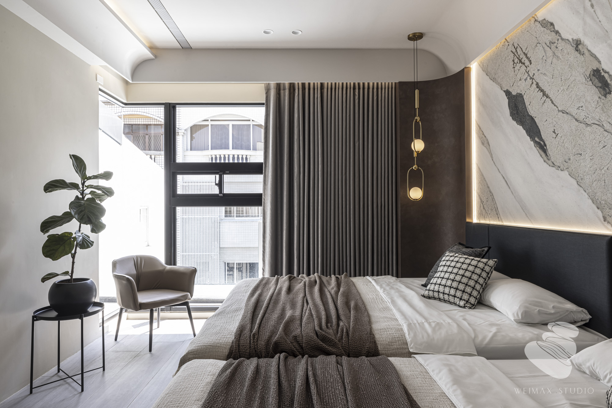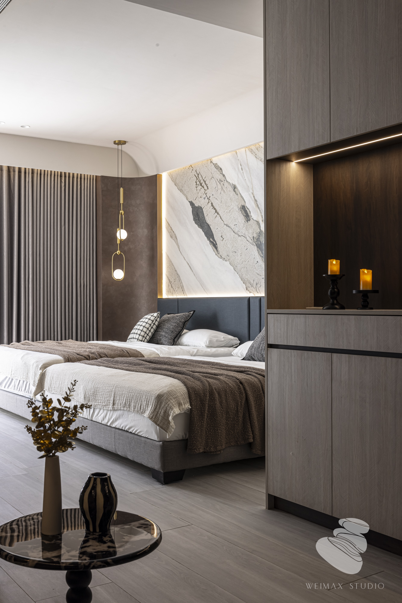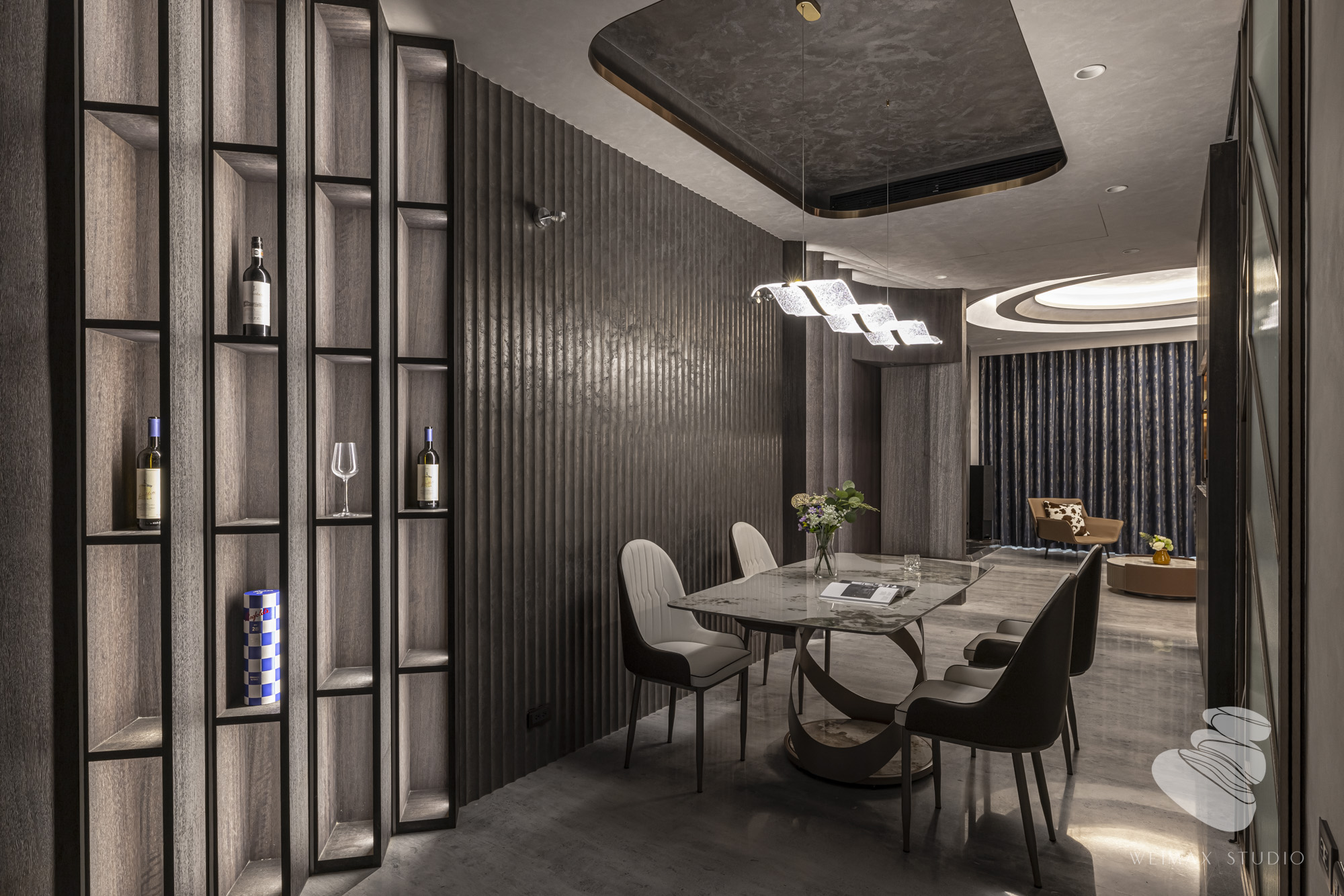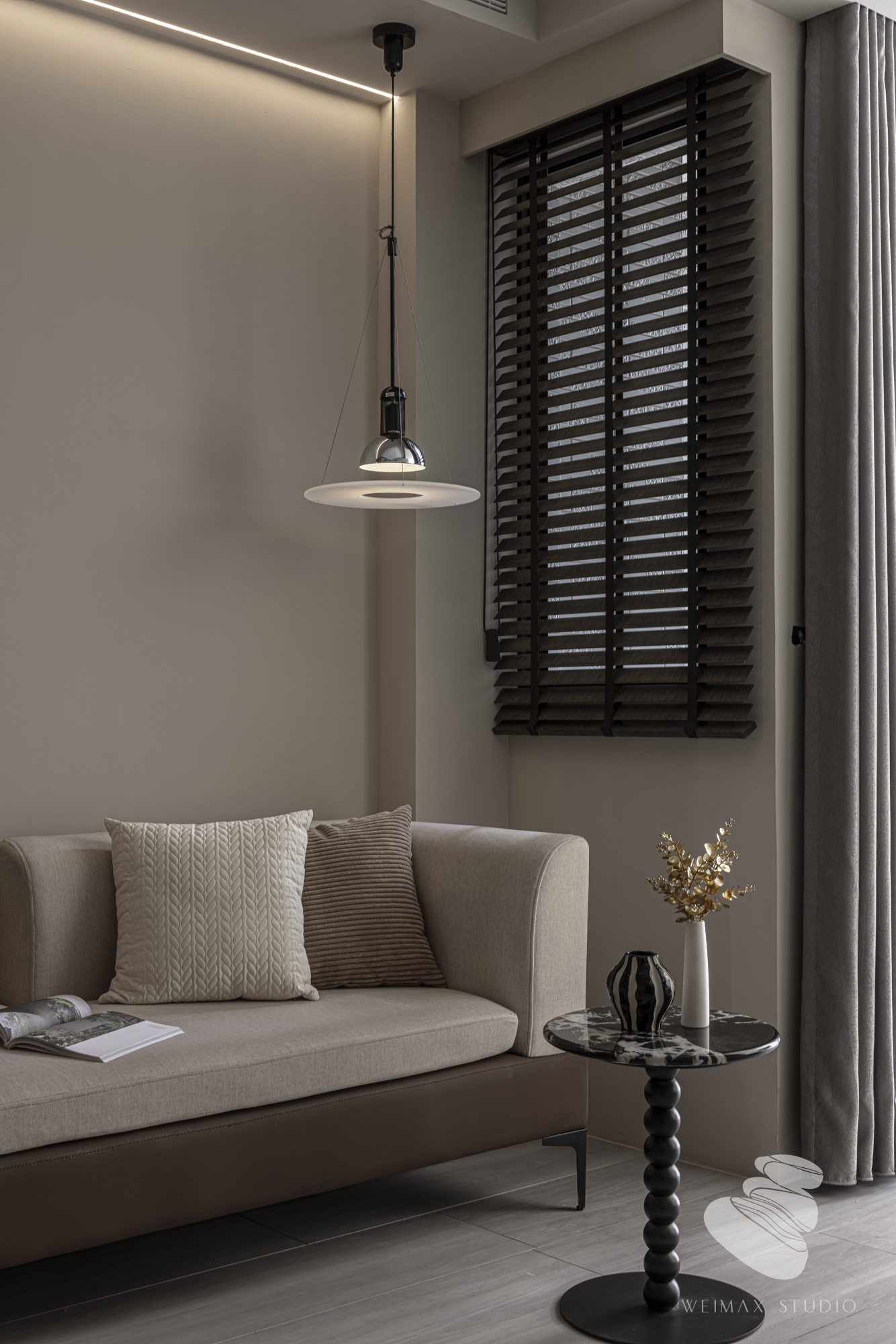 這個客廳以電動智能窗簾系統展現豪華質感,主體採用蛇形無縫燙金遮光絨布搭配造型柔光紗。深色絨布簾在關閉時能有效遮光與隔熱,營造沉穩典雅的氛圍;柔光紗則在白天柔化日光,讓室內保持明亮卻不刺眼。自動化控制提升便利性,能依不同情境自由調整光線。窗簾與大理石電視牆、弧形天花板設計呼應,整體空間展現出現代奢華與高級感。