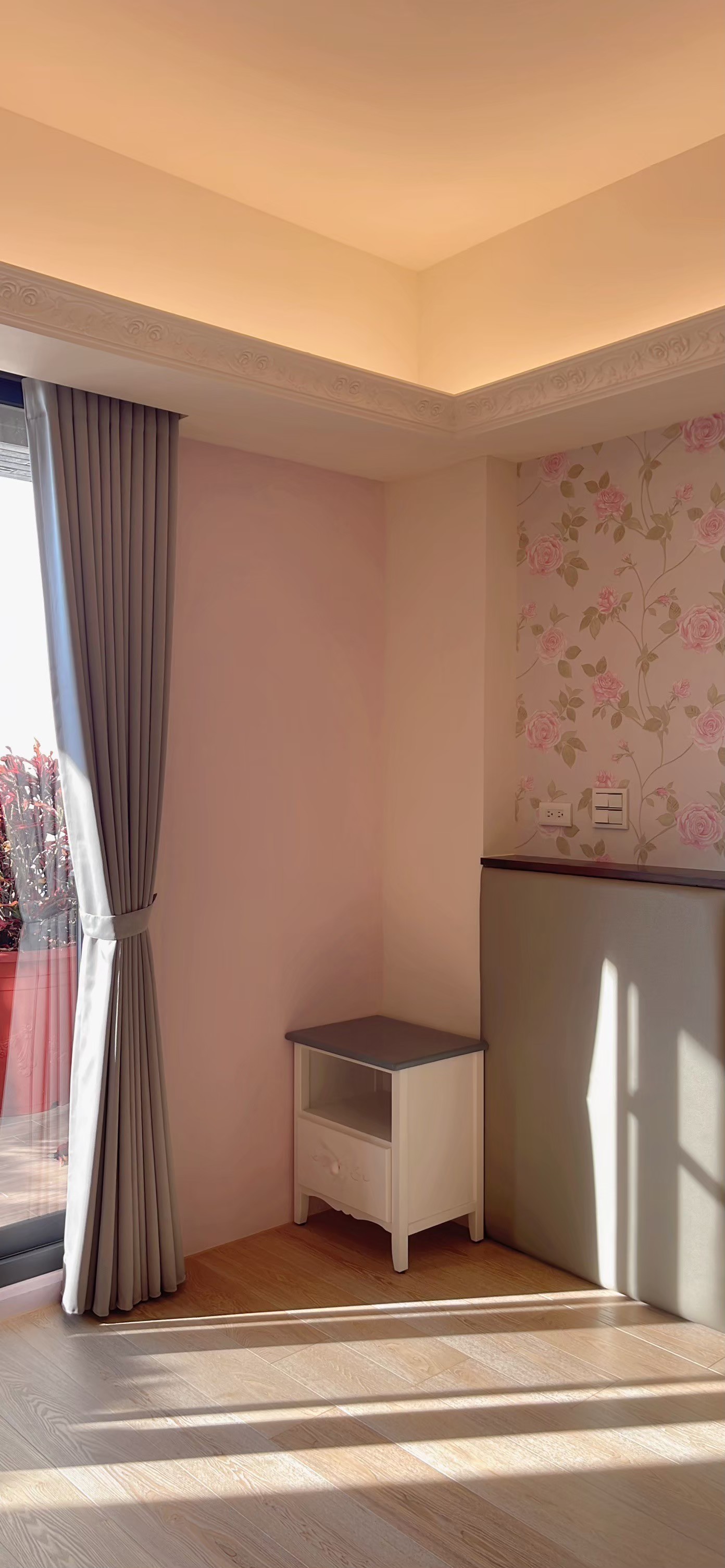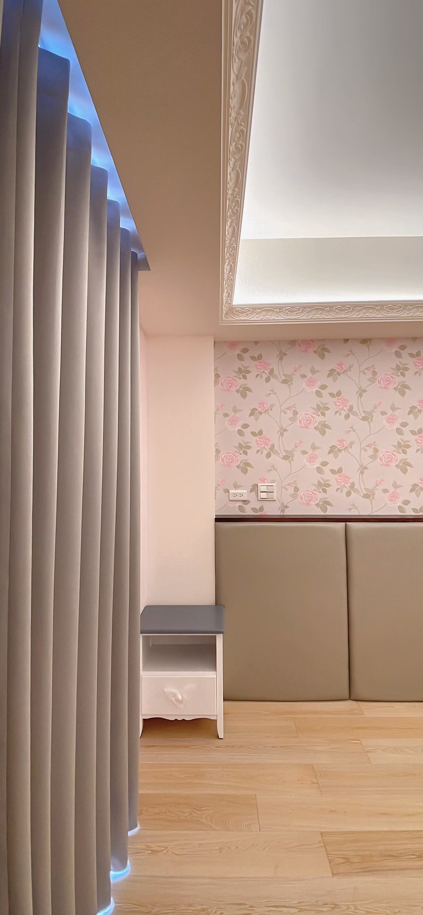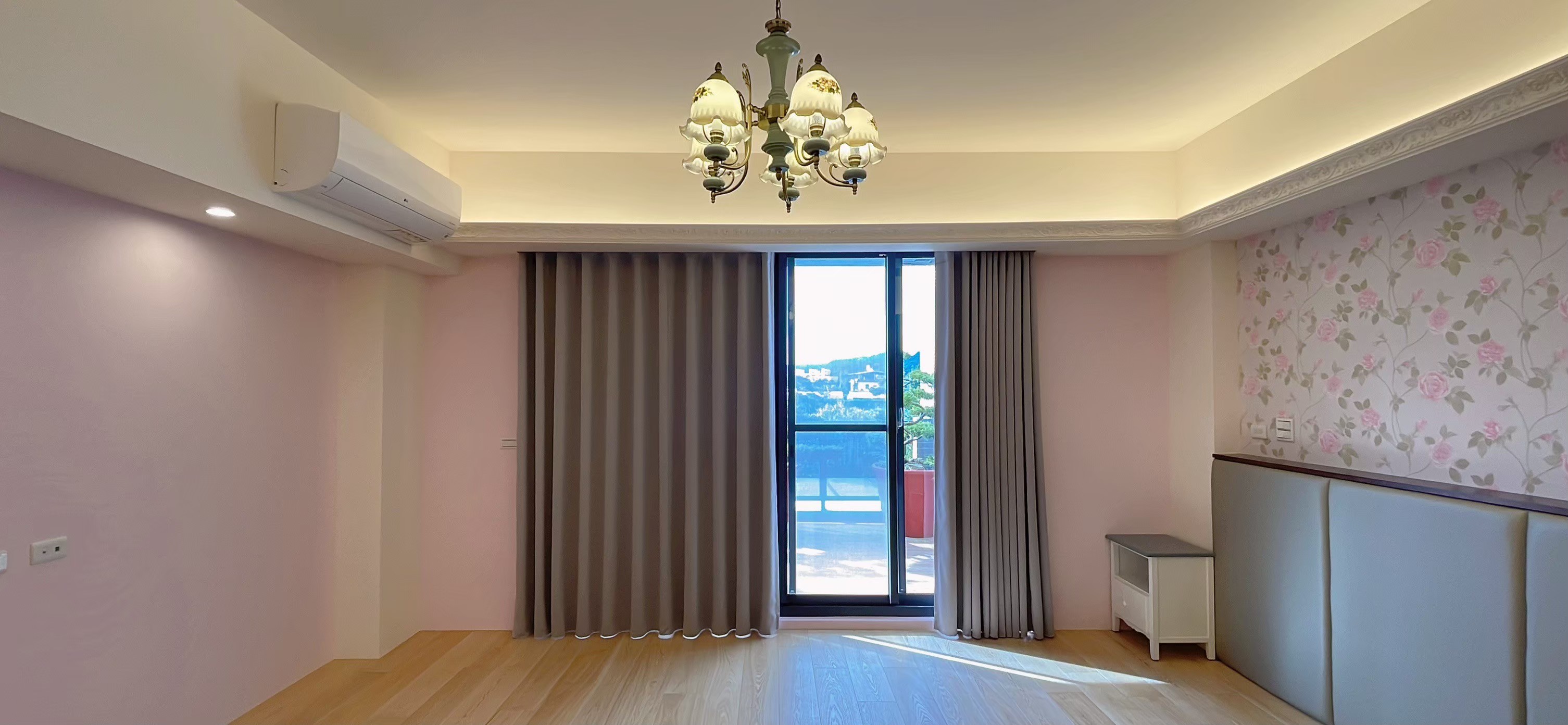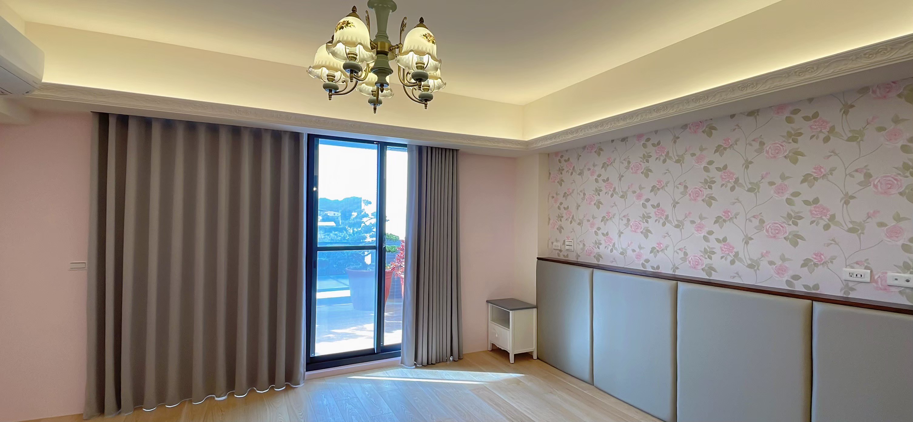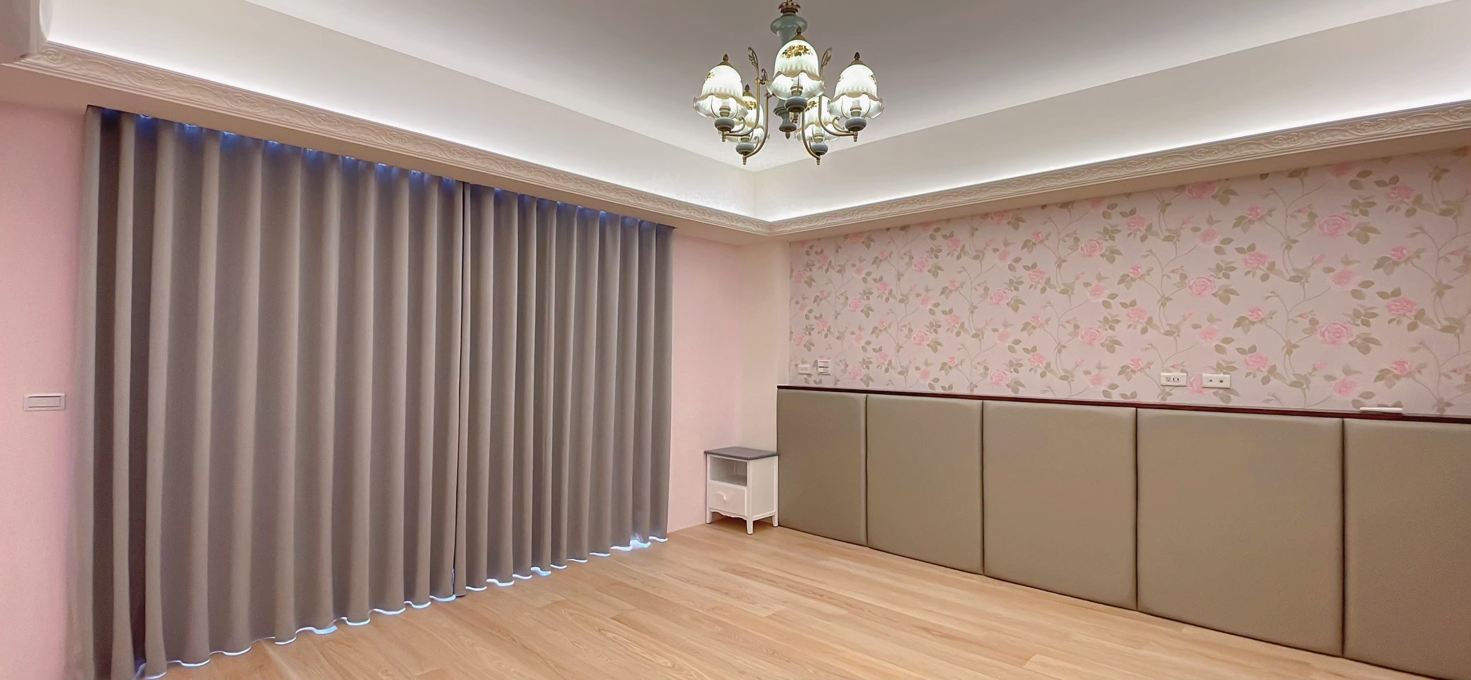 窗簾設計以蛇形摺疊的三合一遮光布簾為主,展現俐落大方的視覺效果。遮光布簾能有效阻隔光線,確保夜晚隱私與良好的睡眠品質;同時透過蛇形摺疊設計,增加窗簾的立體感與律動感,使空間更具層次。搭配粉色牆面與花卉壁紙,柔和中帶有優雅氛圍,讓臥室兼具實用性與浪漫氣息,營造出舒適宜人的休憩環境。