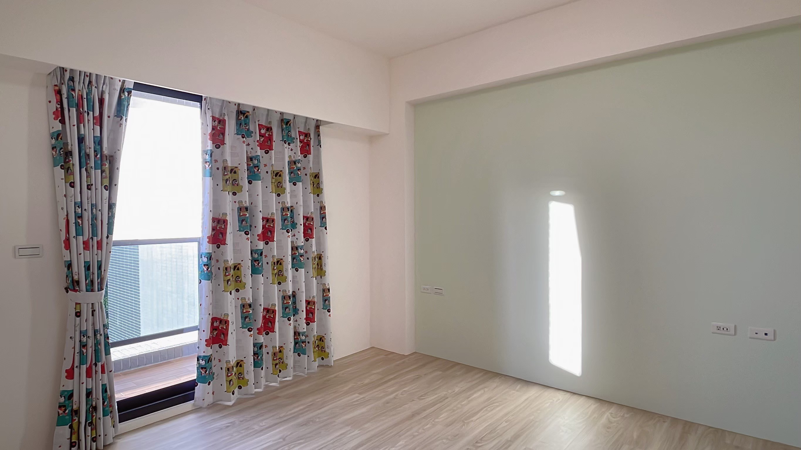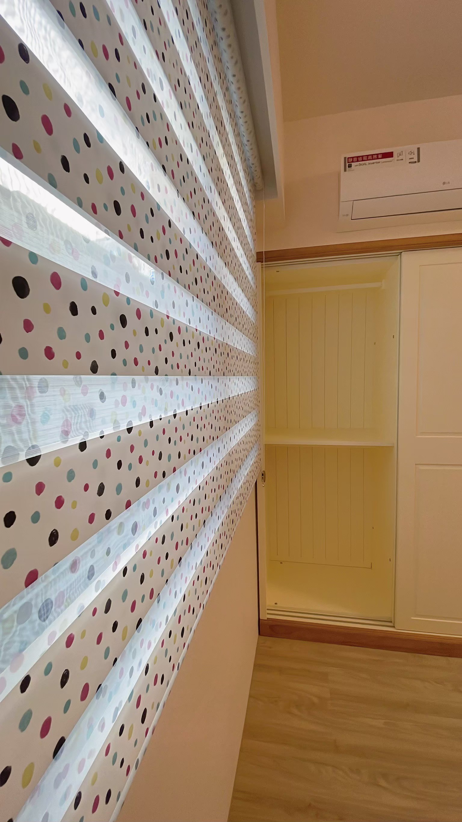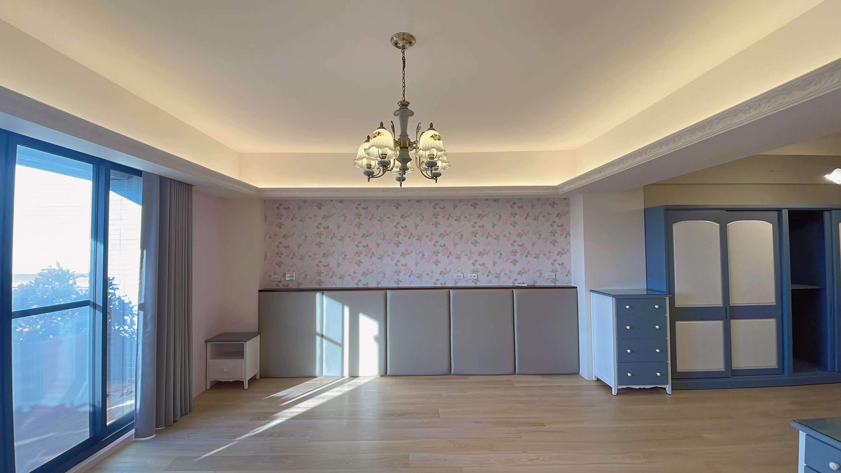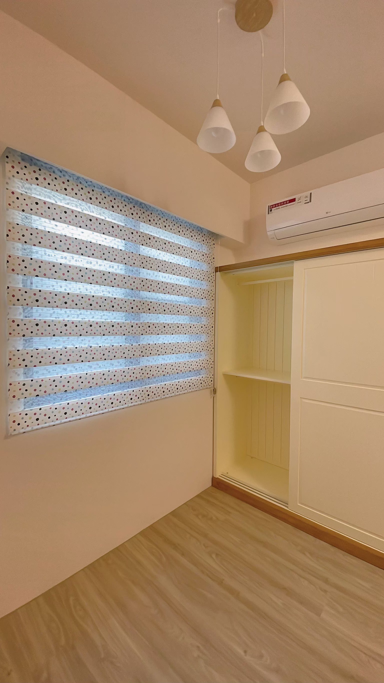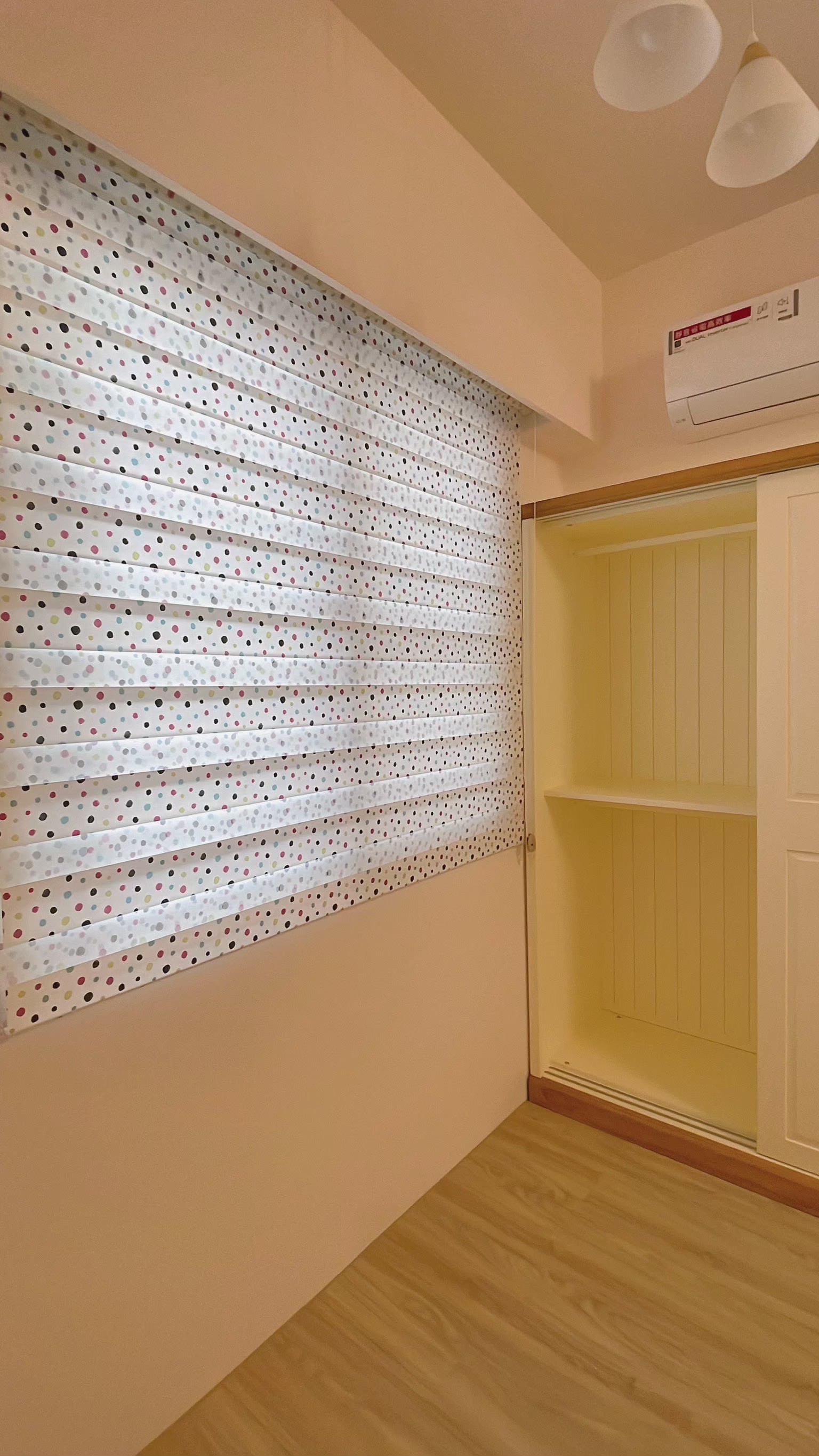 窗簾設計以蛇形摺疊的三合一遮光布簾為主,展現俐落大方的視覺效果。遮光布簾能有效阻隔光線,確保夜晚隱私與良好的睡眠品質;同時透過蛇形摺疊設計,增加窗簾的立體感與律動感,使空間更具層次。搭配粉色牆面與花卉壁紙,柔和中帶有優雅氛圍,讓臥室兼具實用性與浪漫氣息,營造出舒適宜人的休憩環境。