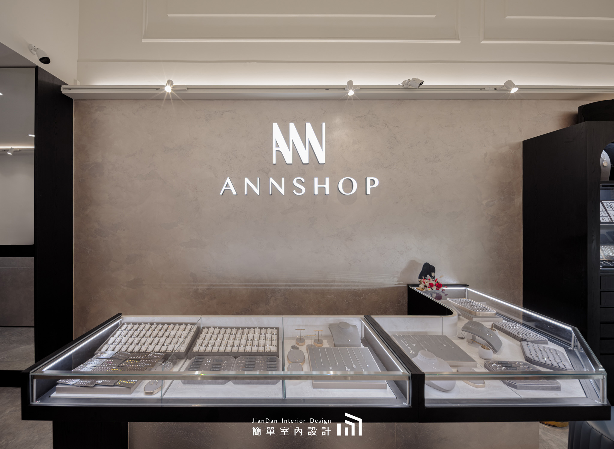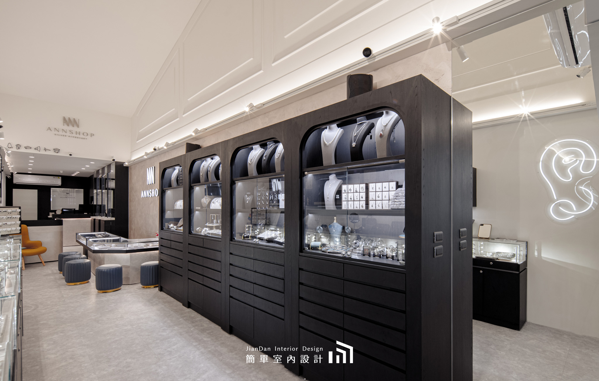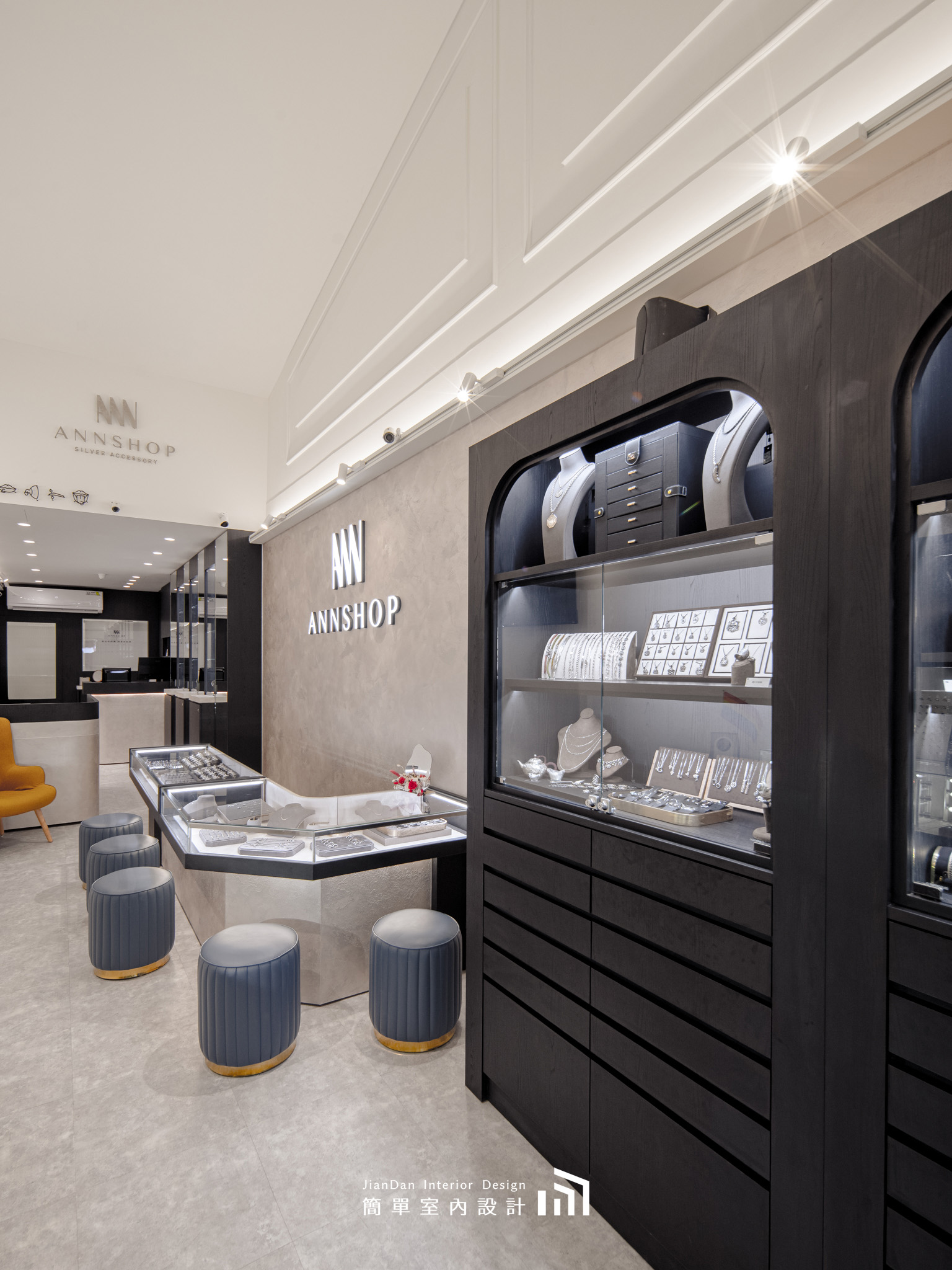以極簡的設計語彙,勾勒出專屬於銀飾的高雅舞台。純白與黑木紋的交錯,營造出靜謐而高貴的氛圍;
