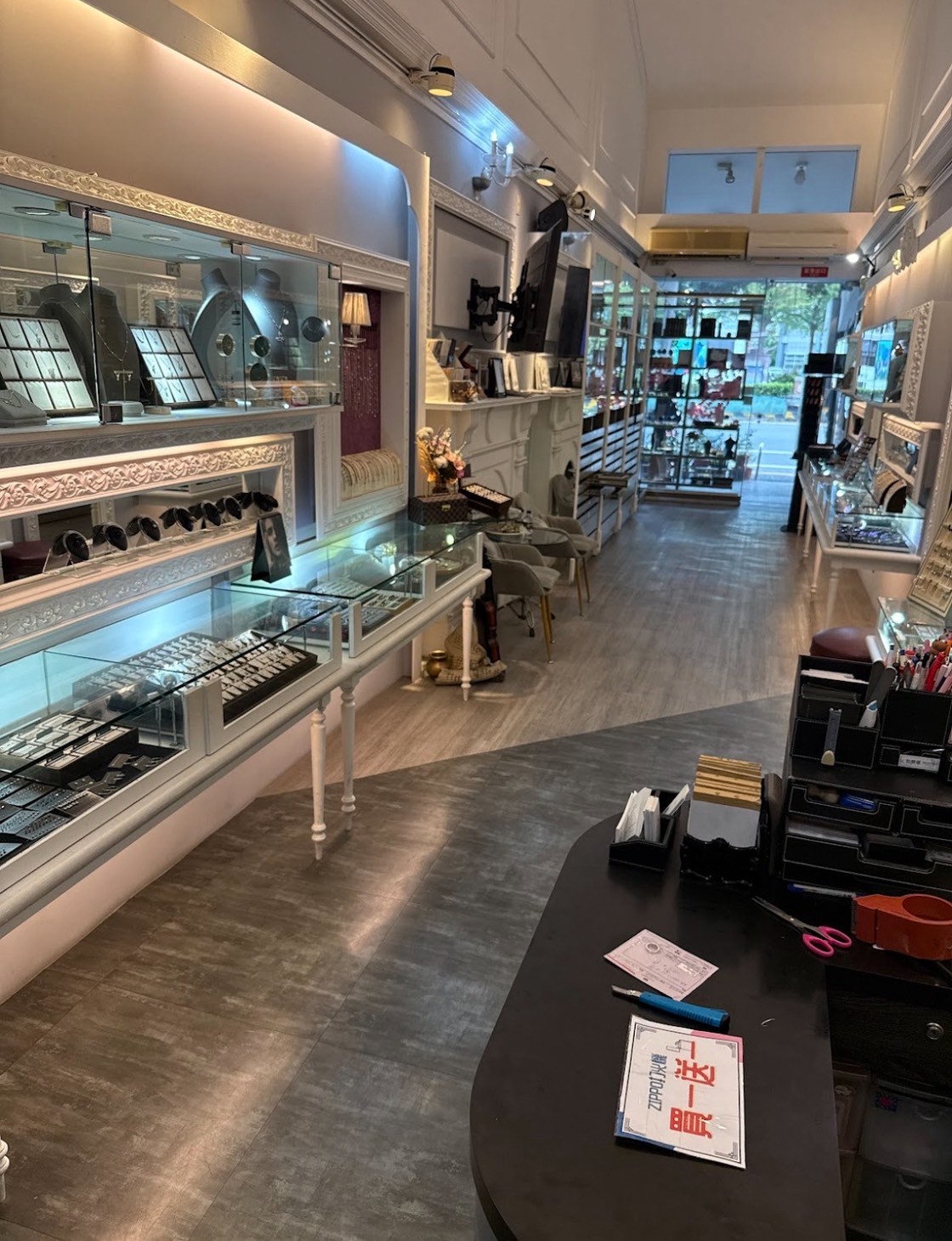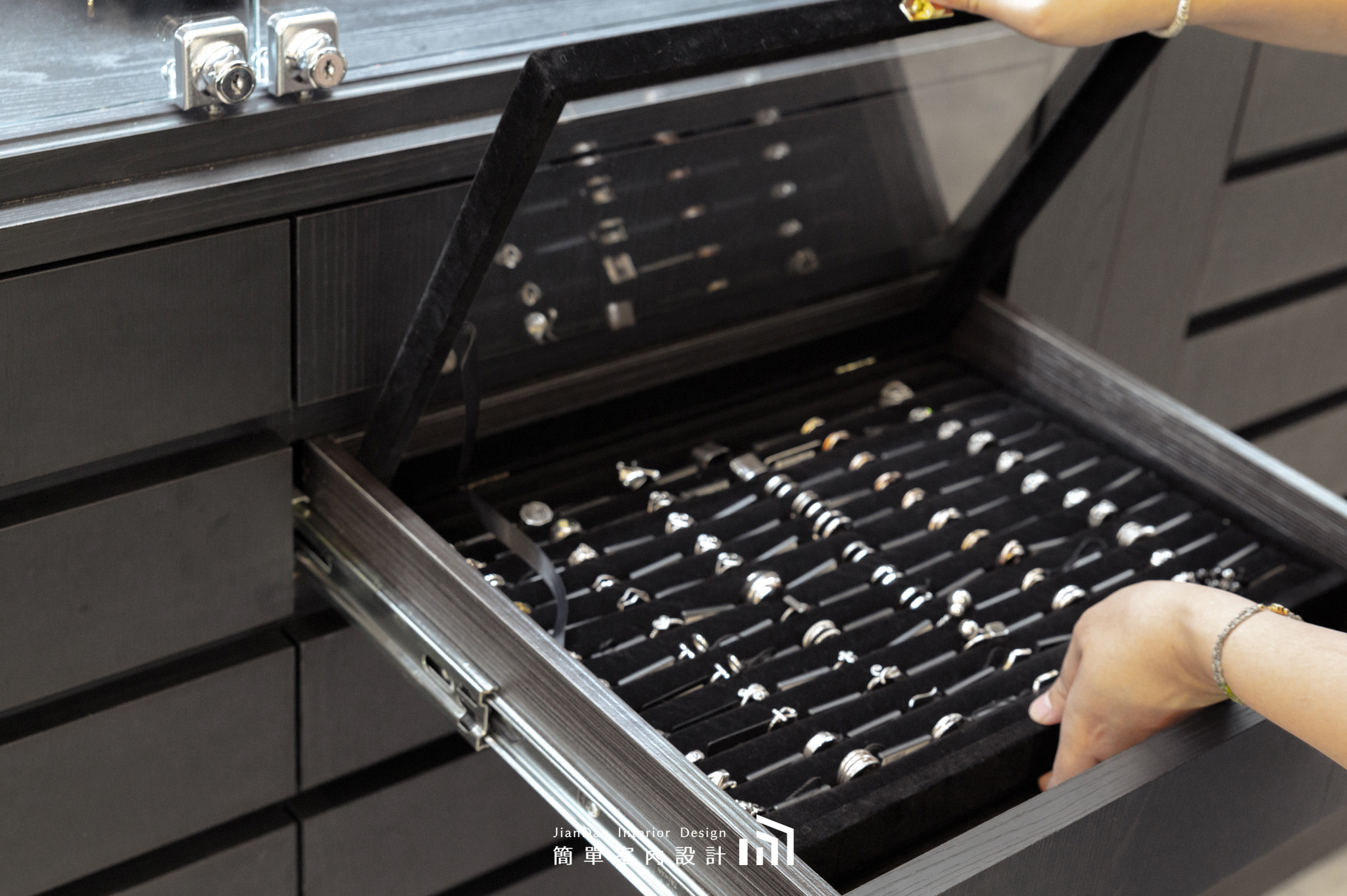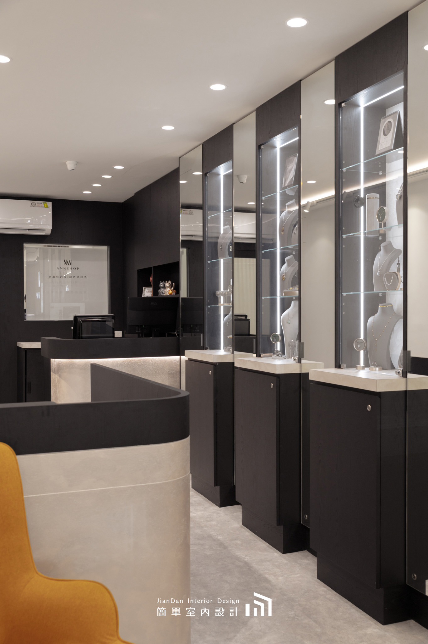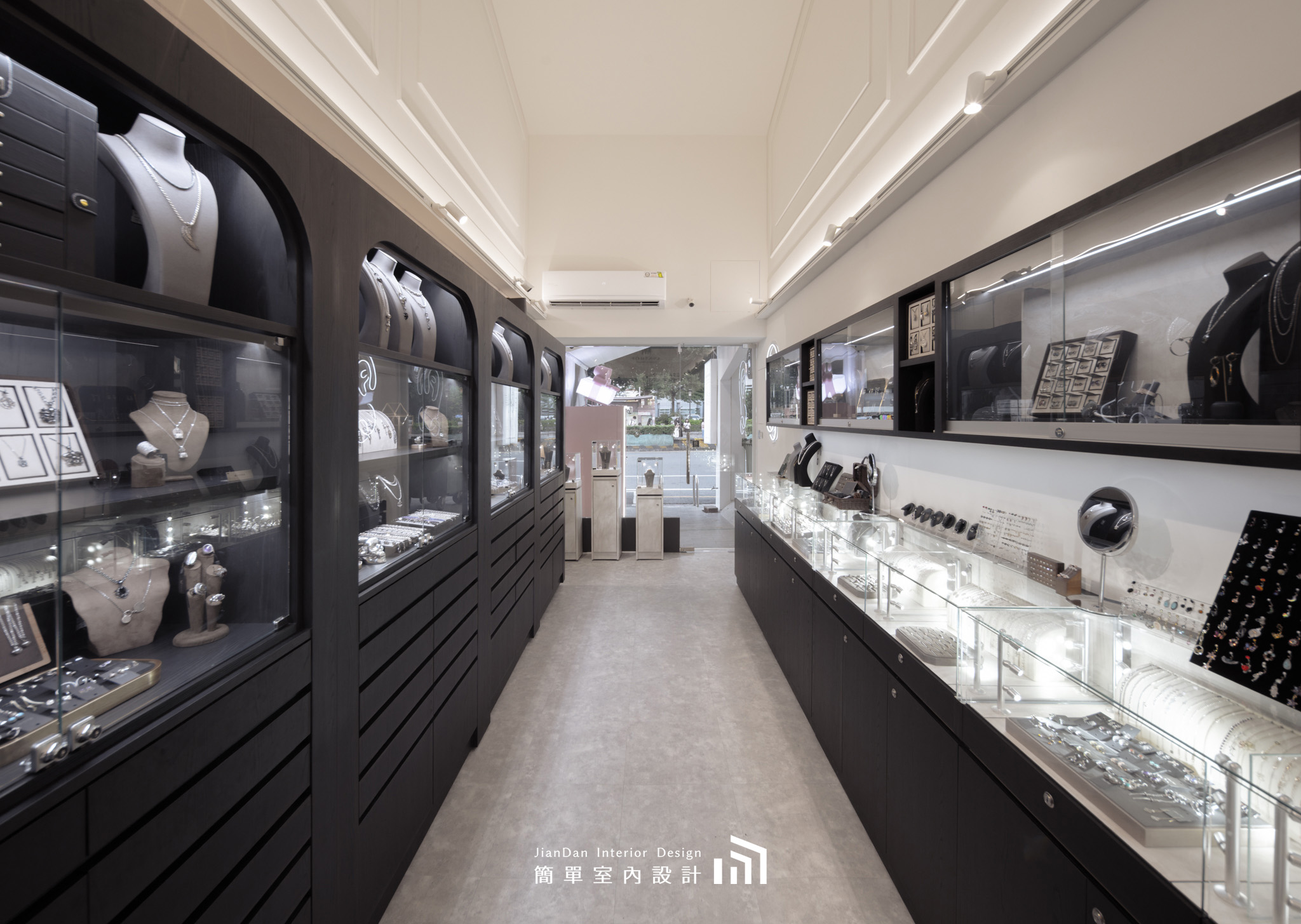 以極簡的設計語彙,勾勒出專屬於銀飾的高雅舞台。純白與黑木紋的交錯,營造出靜謐而高貴的氛圍;